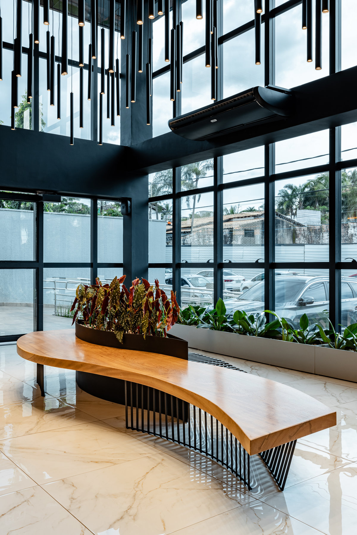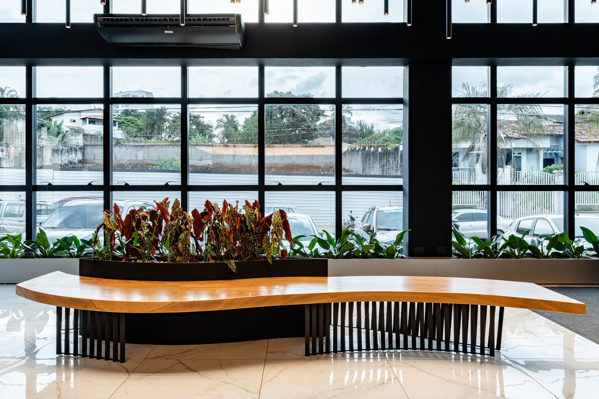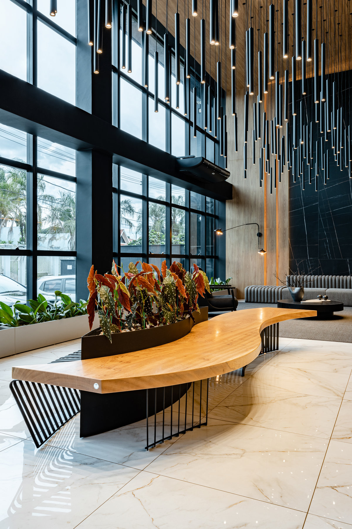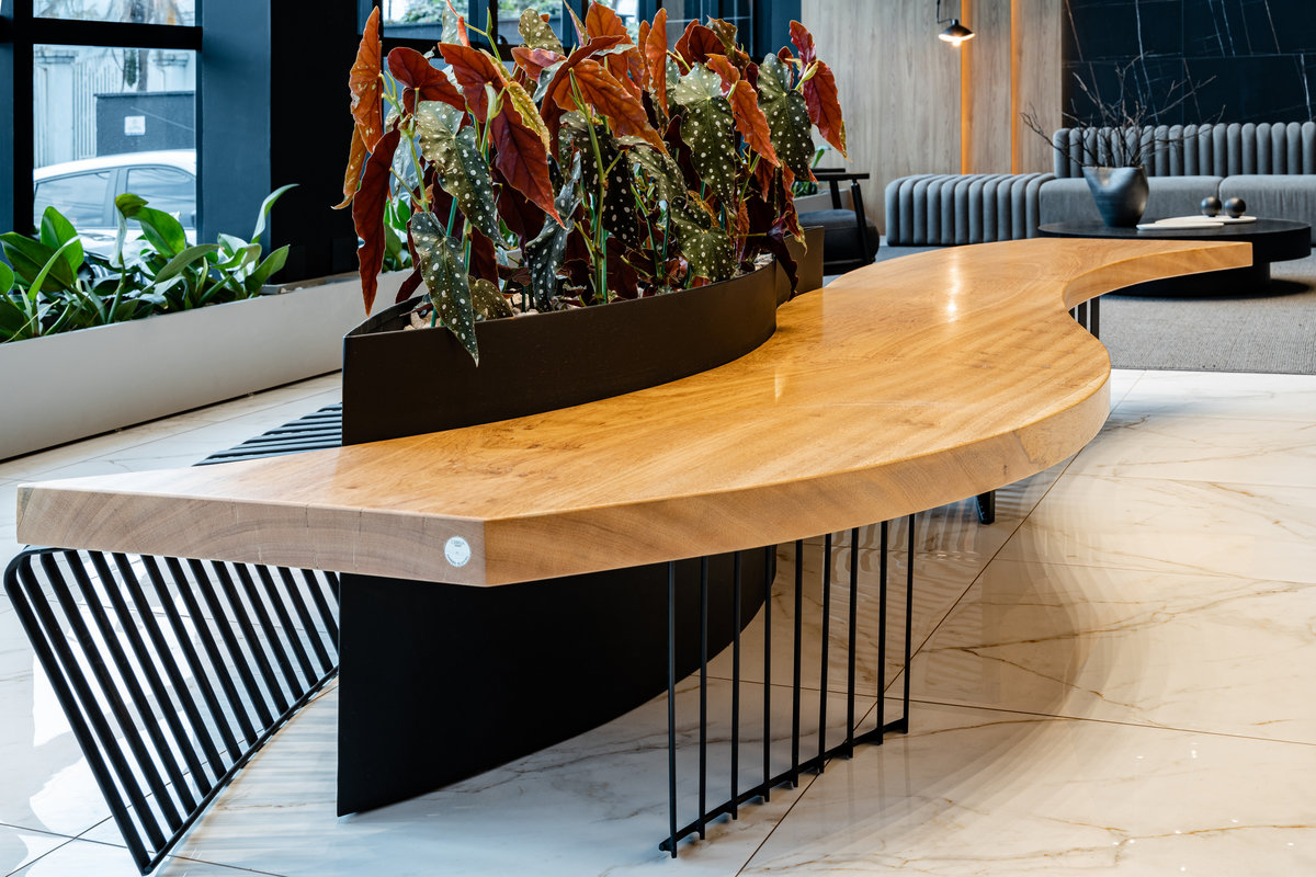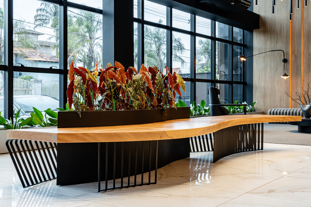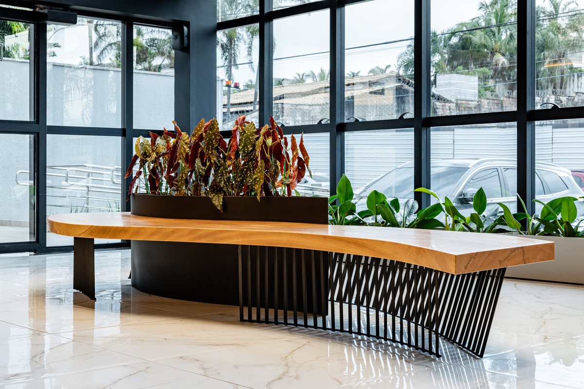 Ao centro, o jardim integrado dá vida à peça, aproximando o design da natureza e reforçando seu caráter acolhedor e contemplativo. O banco não é apenas mobiliário, mas também paisagem, escultura e ponto focal — ideal para espaços de grande circulação, como lobbies e áreas comuns sofisticadas.