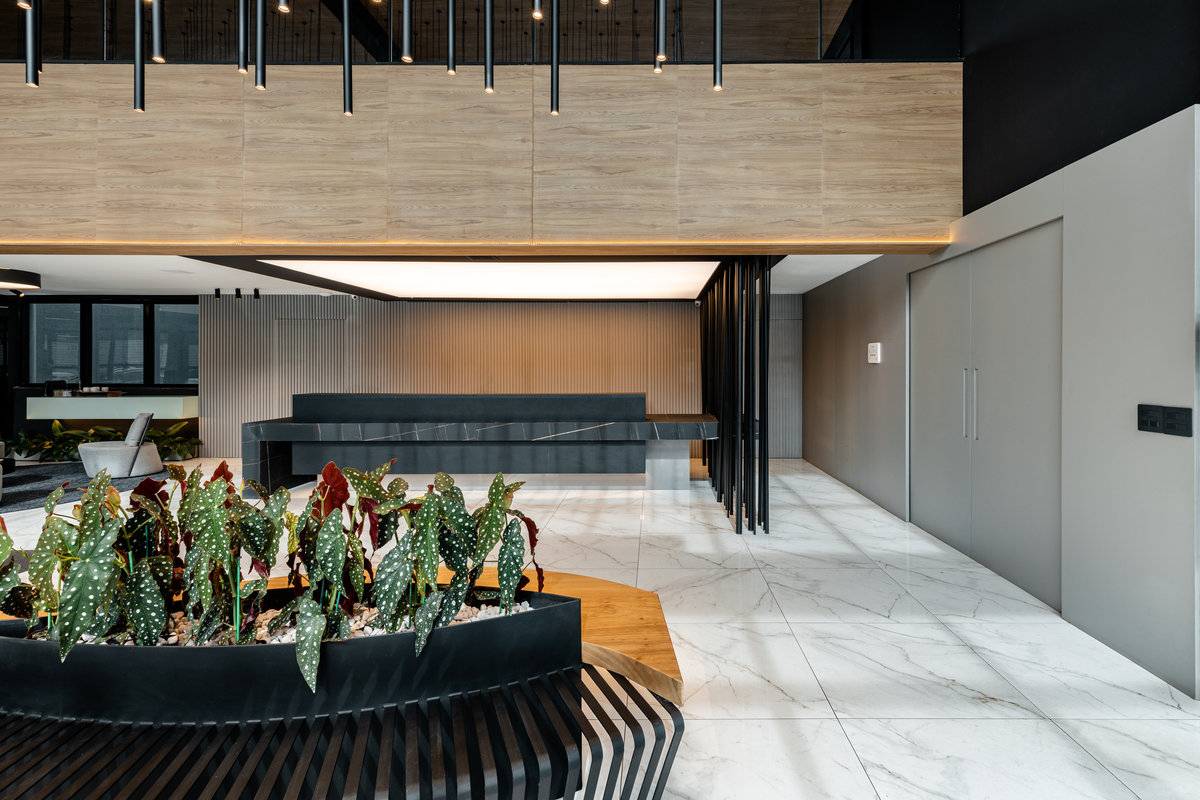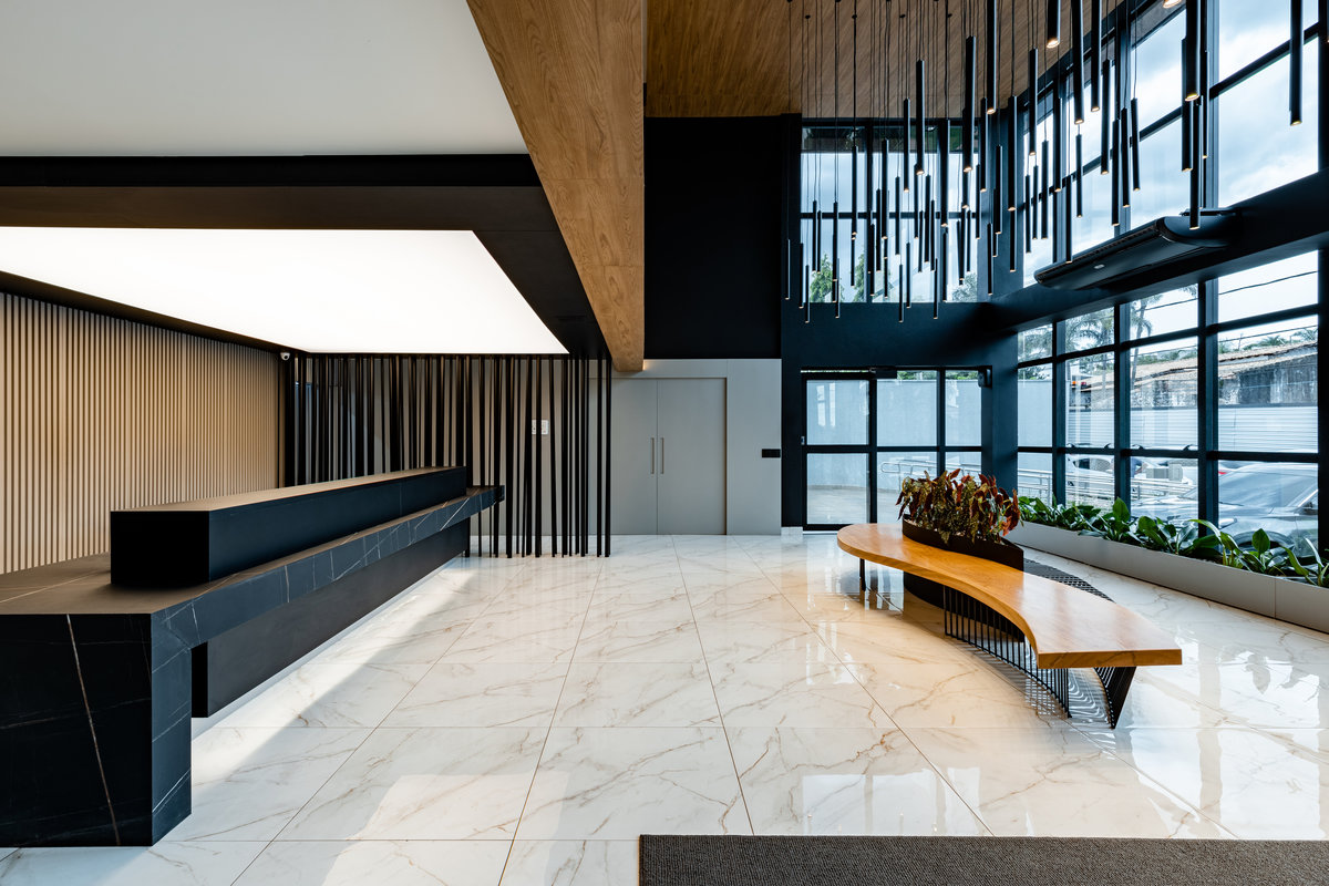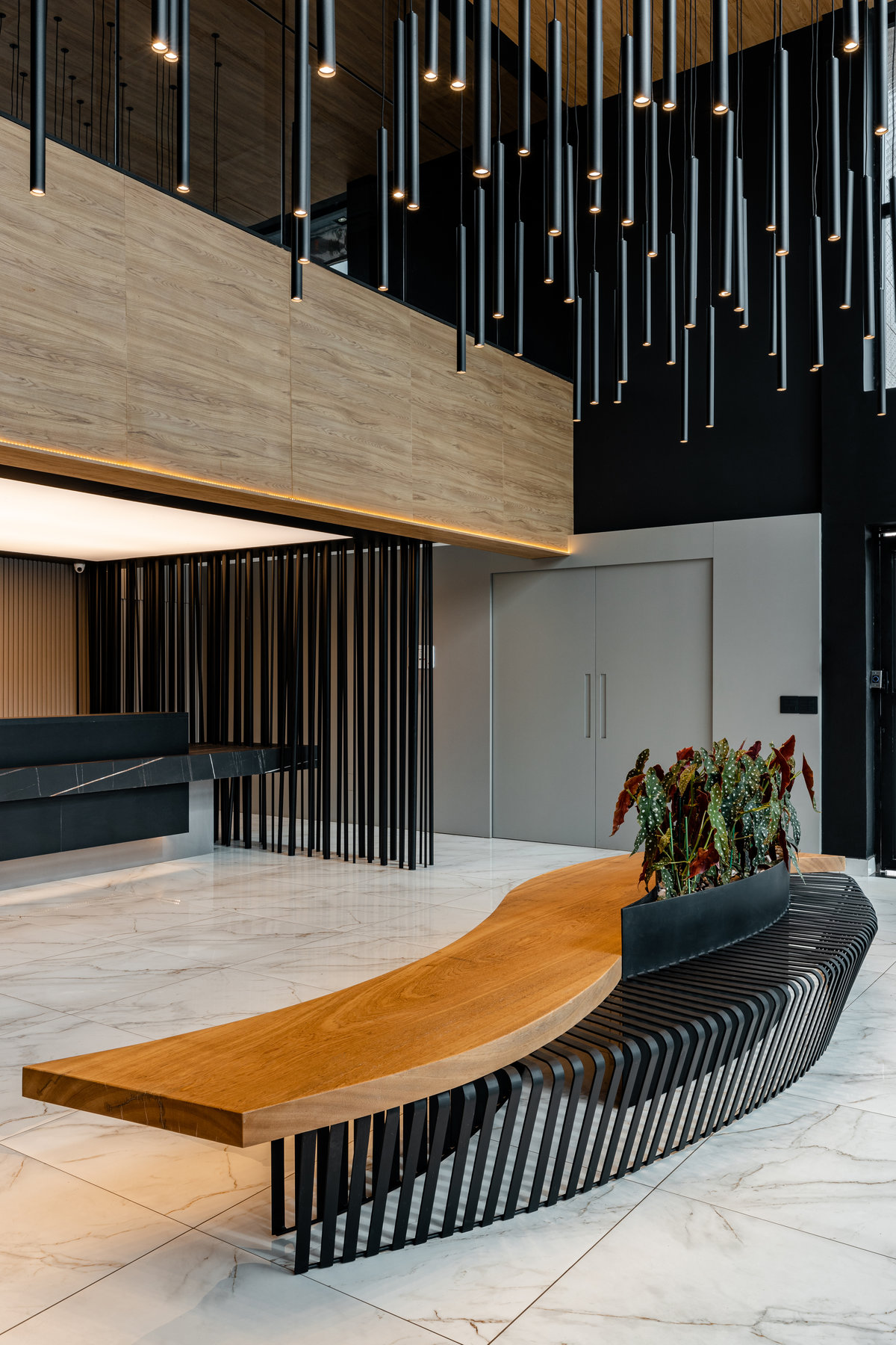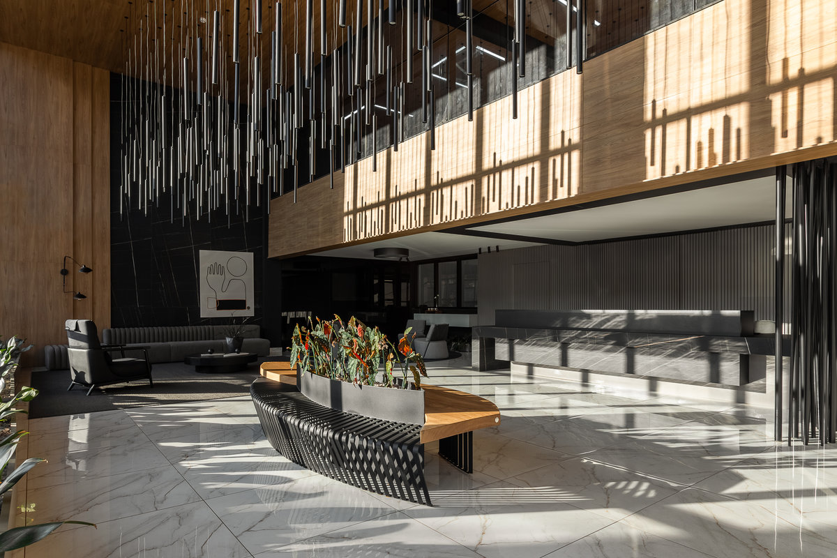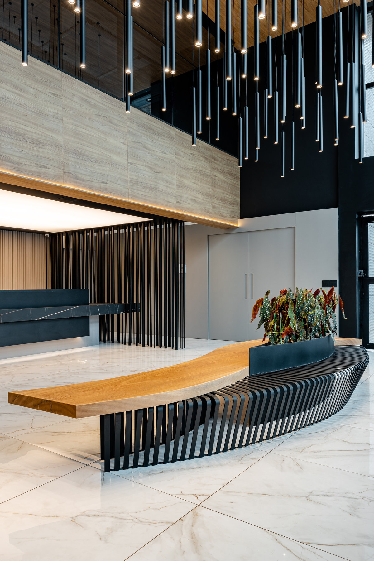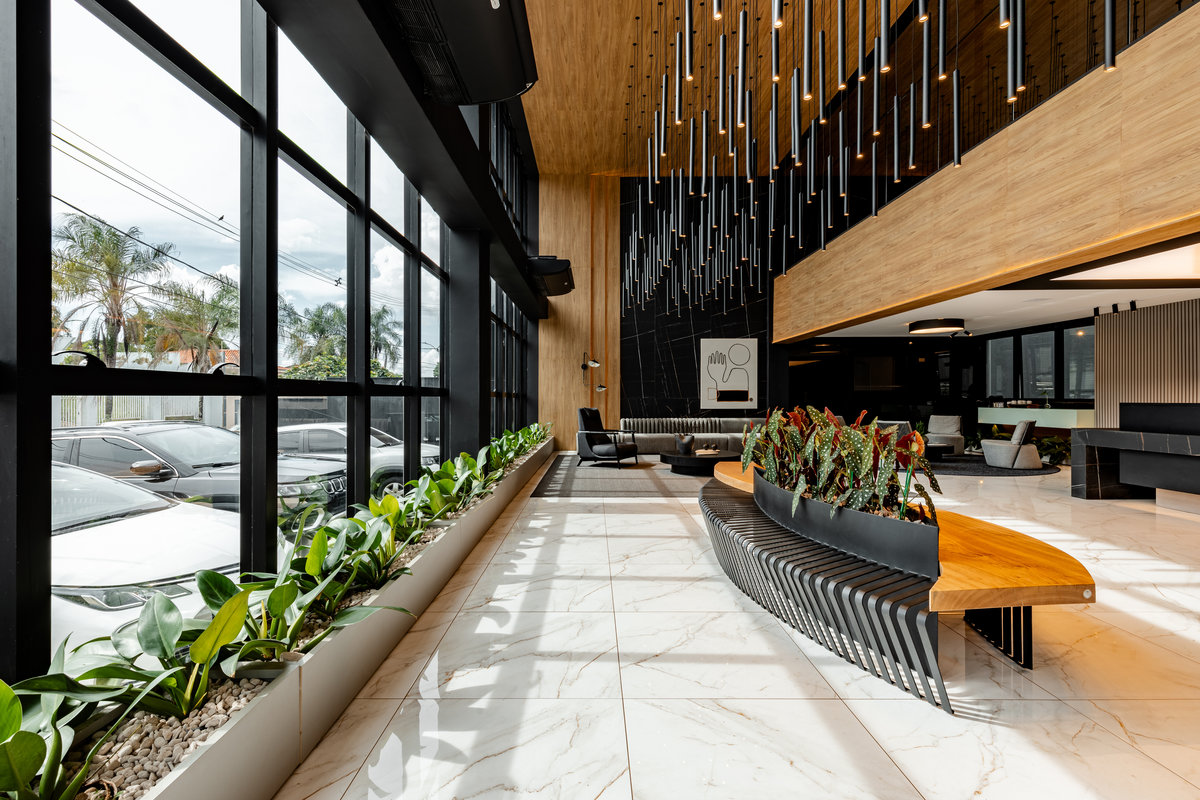 Ao centro, o jardim integrado dá vida à peça, aproximando o design da natureza e reforçando seu caráter acolhedor e contemplativo. O banco não é apenas mobiliário, mas também paisagem, escultura e ponto focal — ideal para espaços de grande circulação, como lobbies e áreas comuns sofisticadas.