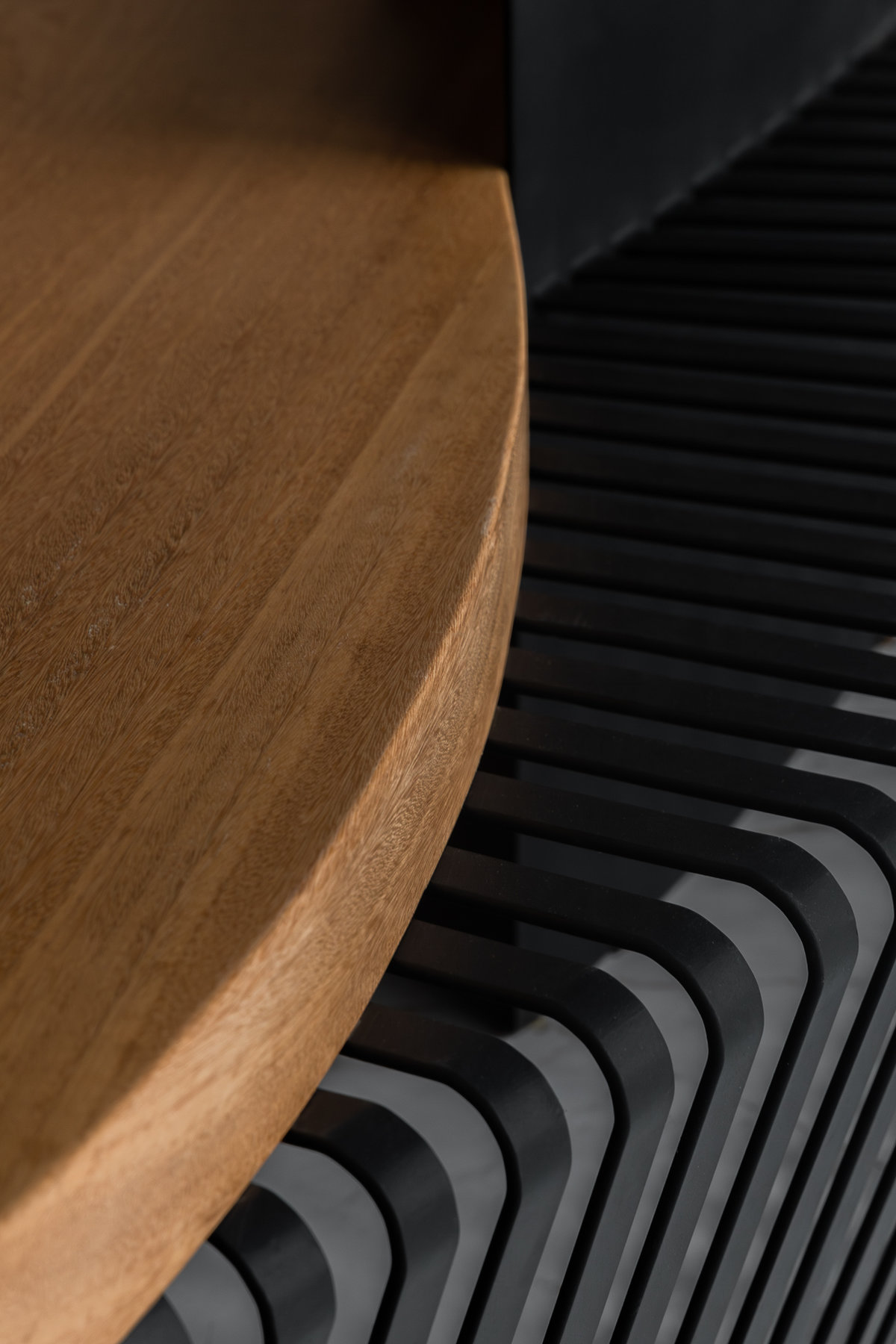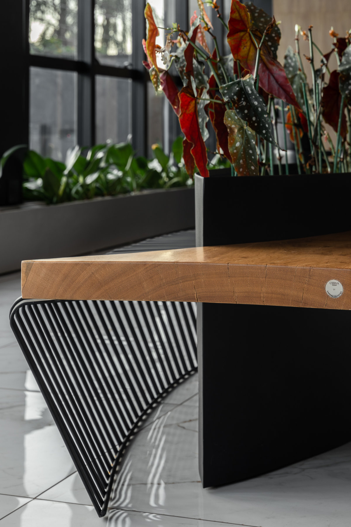 Com um traço autoral marcante, o banco assinado por Sandra Oliveira traduz a perfeita harmonia entre forma, função e expressão artística. Inspirado na fluidez das formas orgânicas, a peça se destaca pelo desenho sinuoso de seu assento em madeira natural, que contrasta com a base metálica curvada, vazada e robusta — criando um visual leve e escultural.