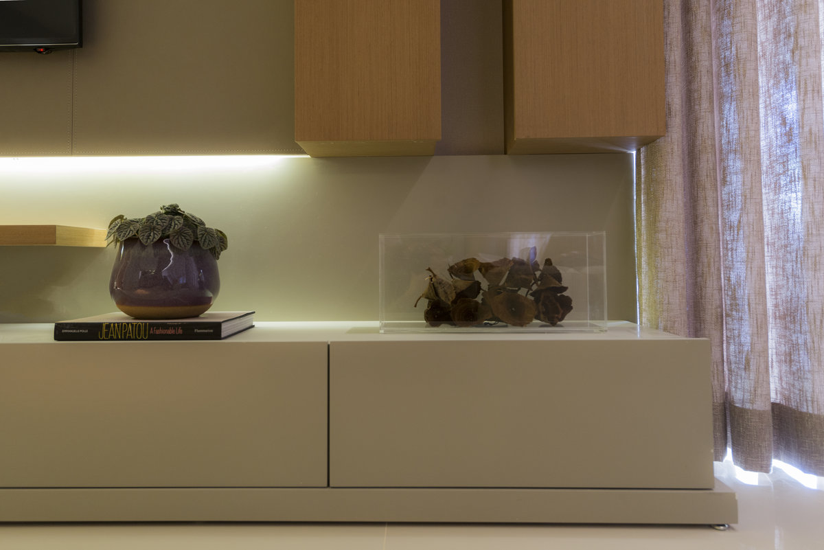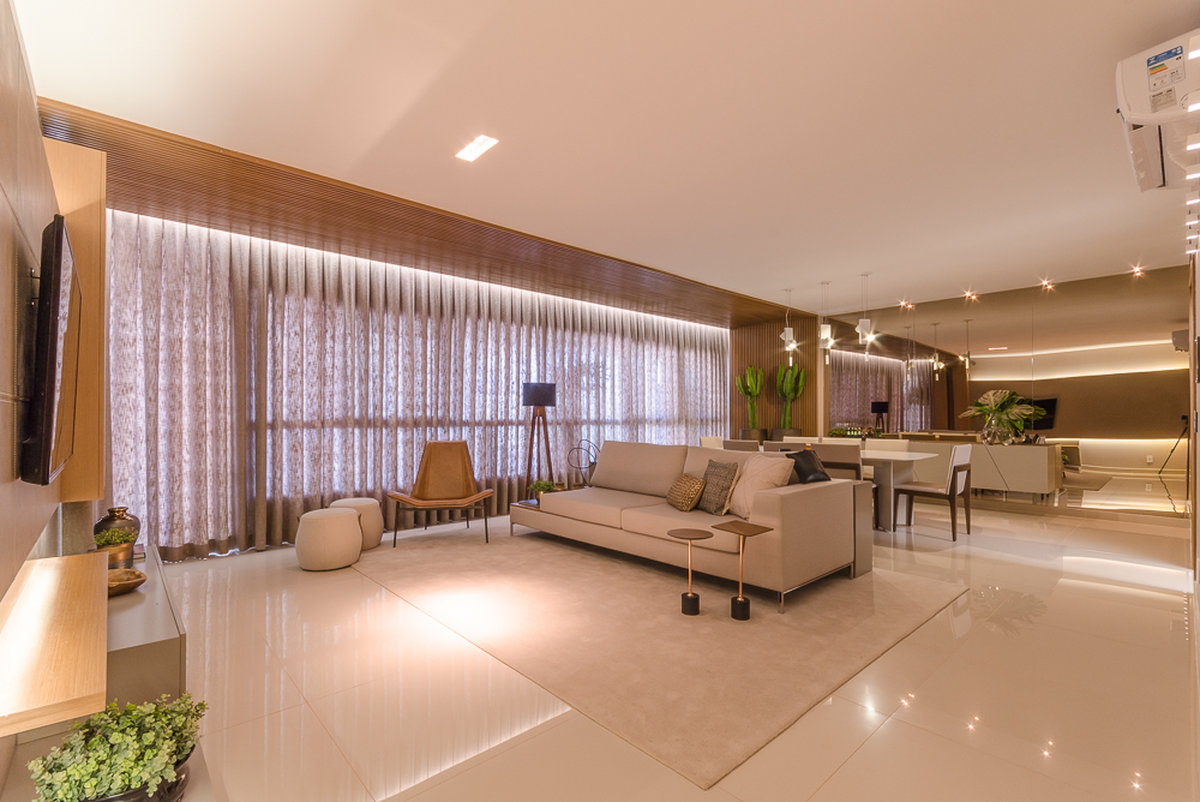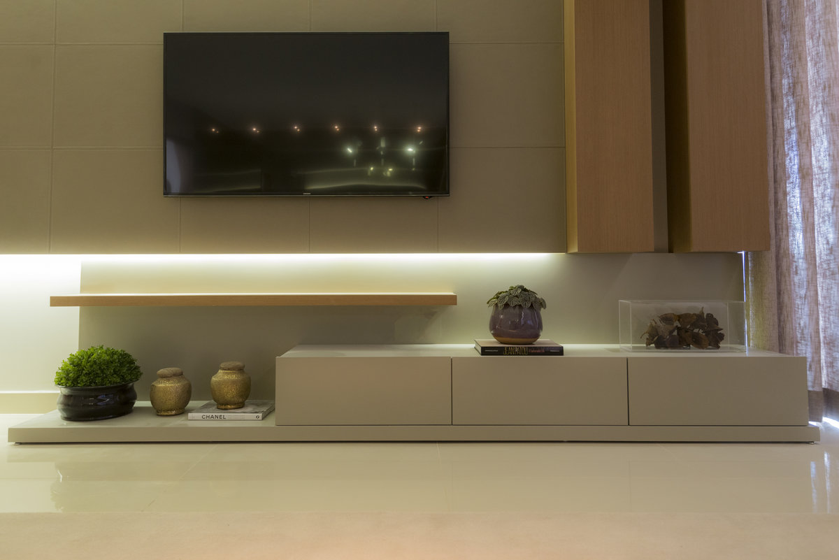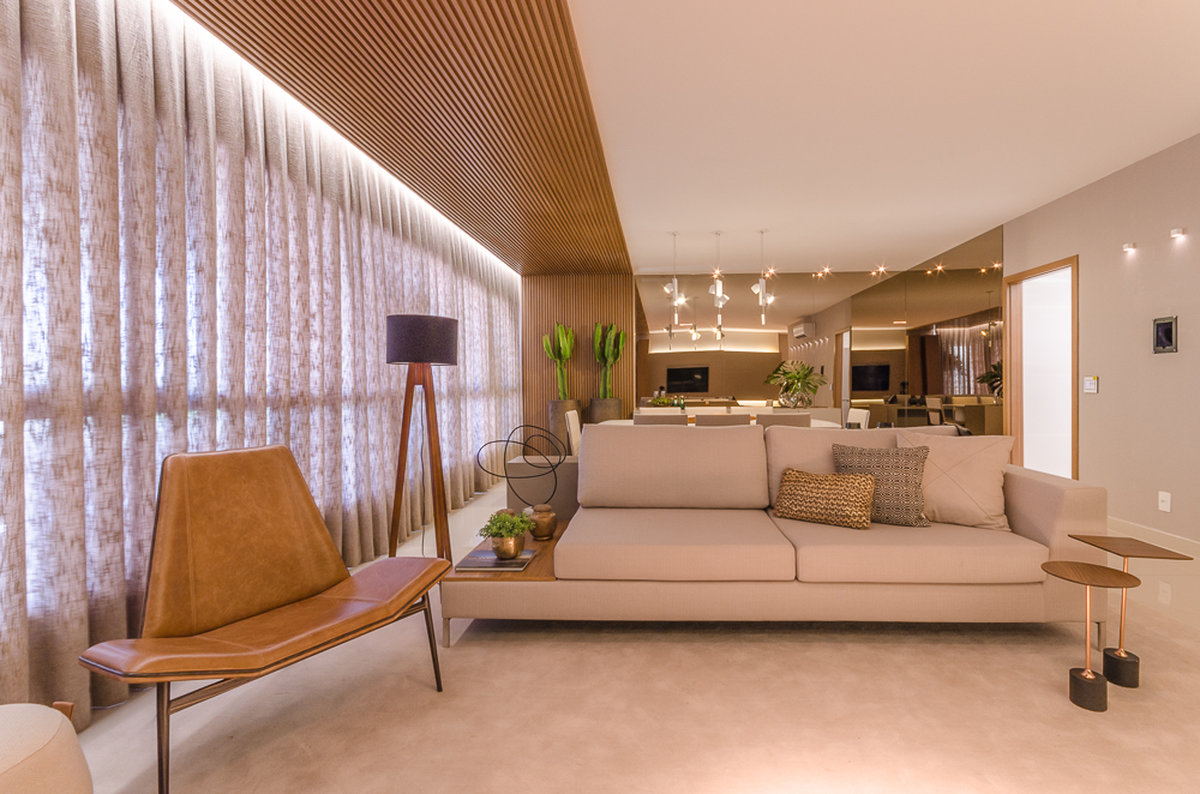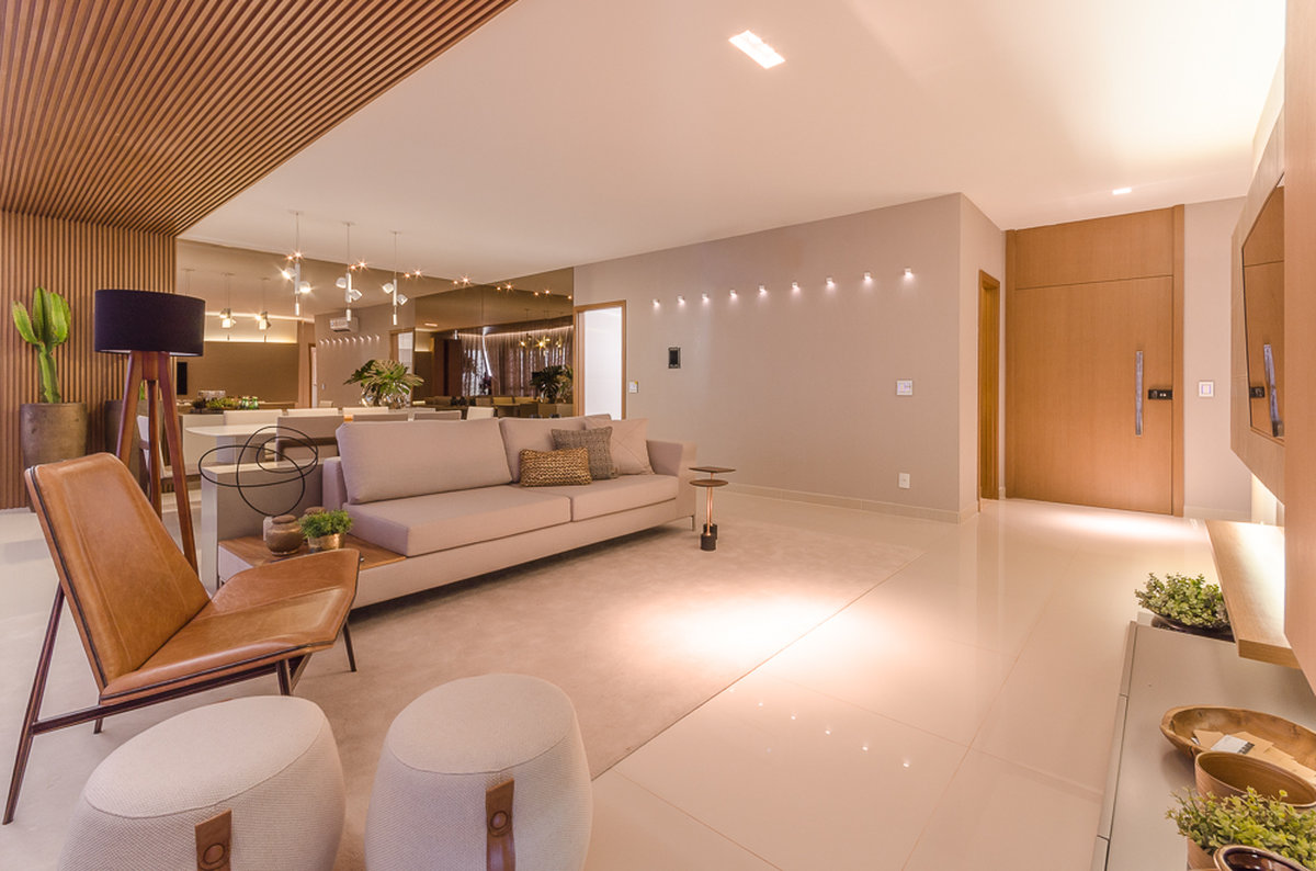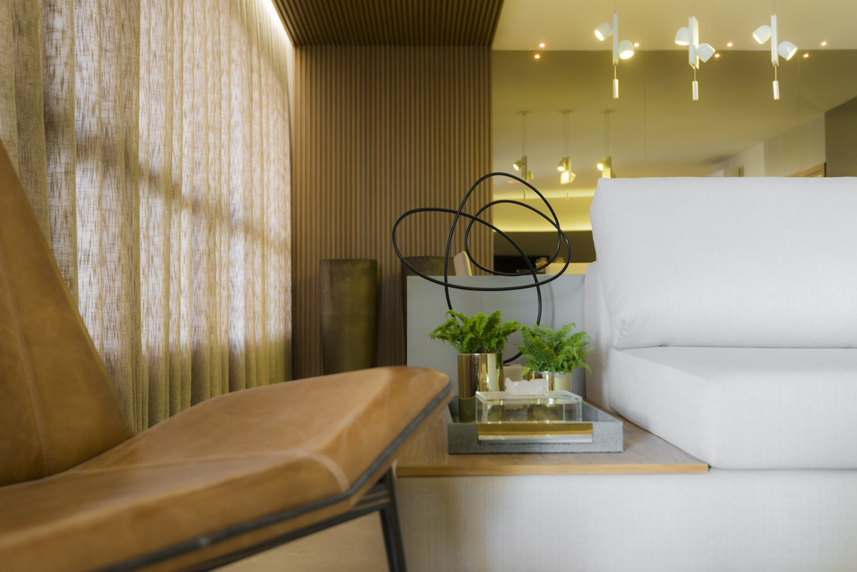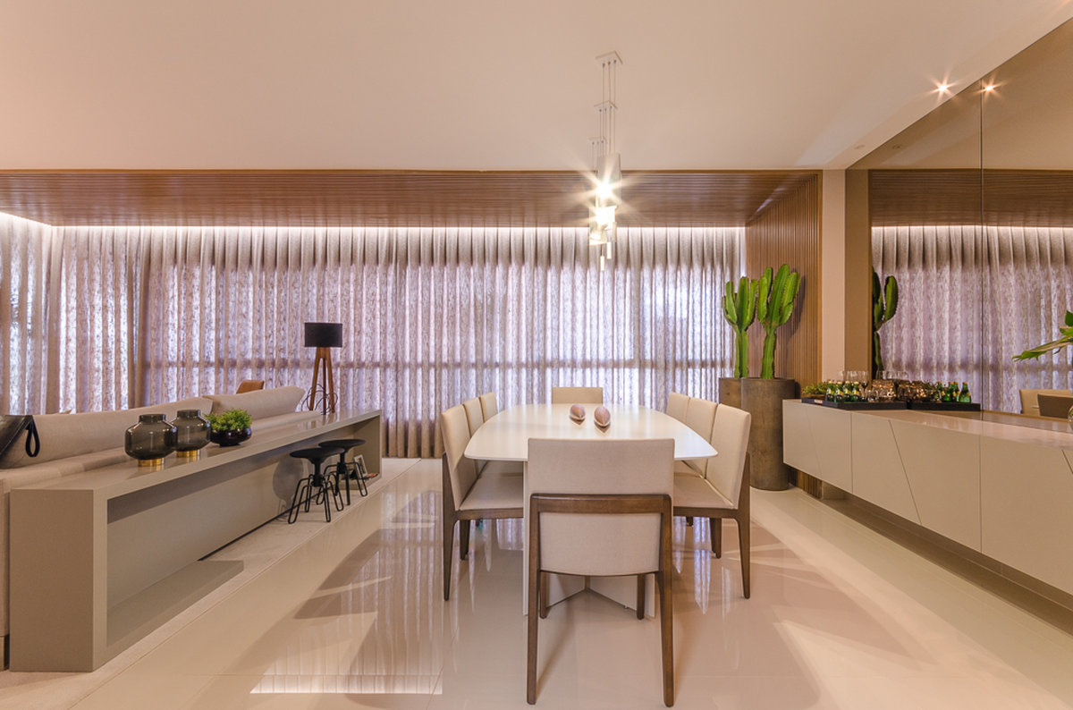 No Aventino, Sandra traduz modernidade e aconchego em um projeto que valoriza materiais nobres e soluções inteligentes de integração. A marcenaria em madeira aquece o ambiente, enquanto o espelho amplia a sensação de espaço, refletindo a luz e reforçando o design elegante.