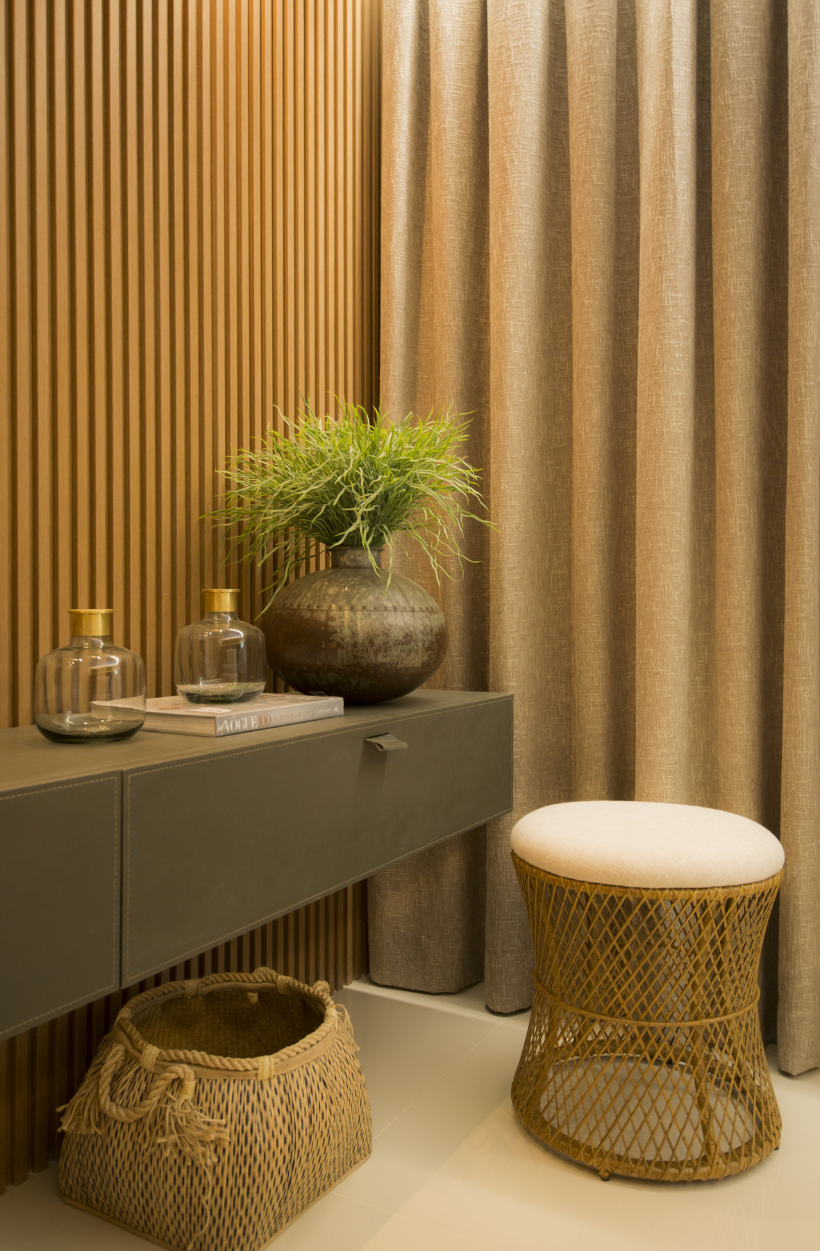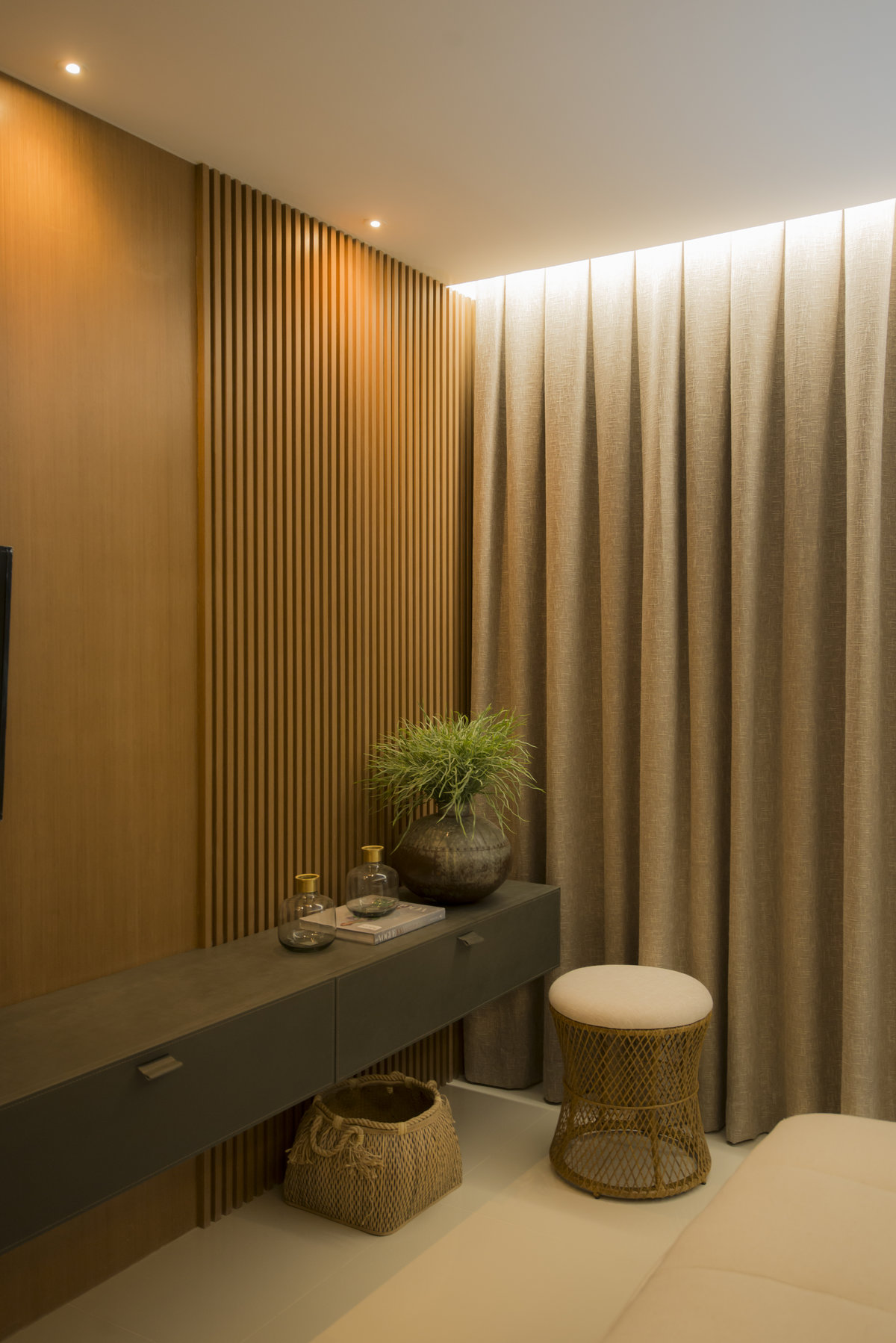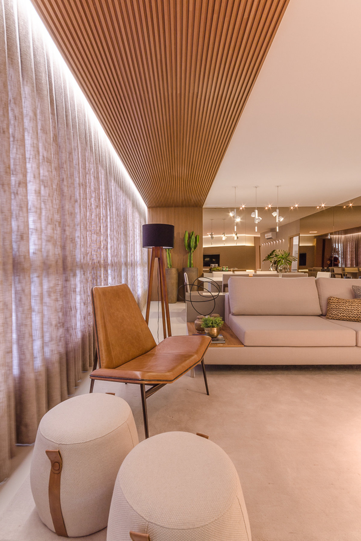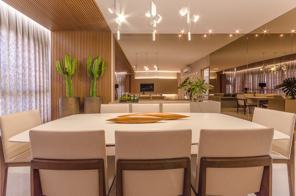 Neste projeto do Aventino, a sofisticação se traduz na simplicidade das linhas e na paleta suave. A sala de jantar se integra com harmonia ao restante do espaço, com mobiliário de traços retos e tons neutros que exaltam elegância e atemporalidade. O painel ripado com iluminação indireta cria profundidade e aconchego, enquanto os grandes cactos trazem personalidade e frescor ao décor.
