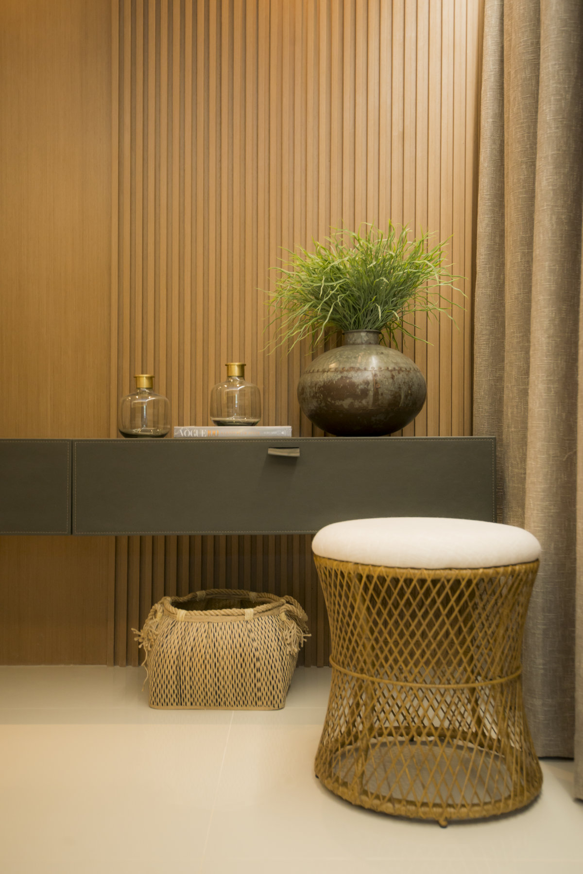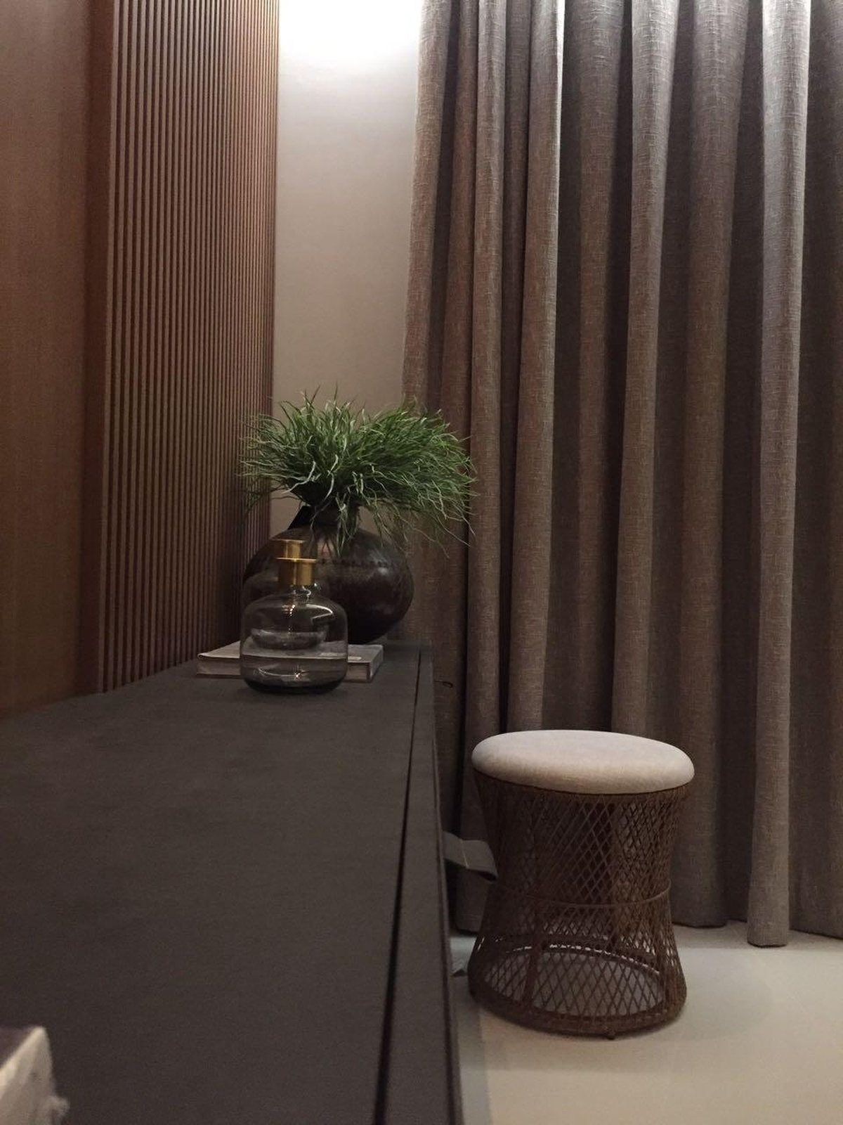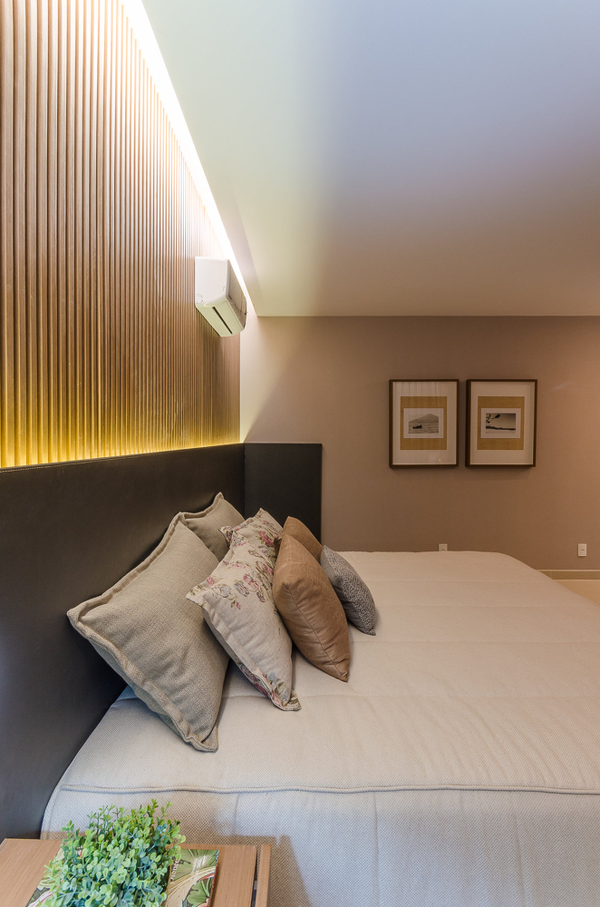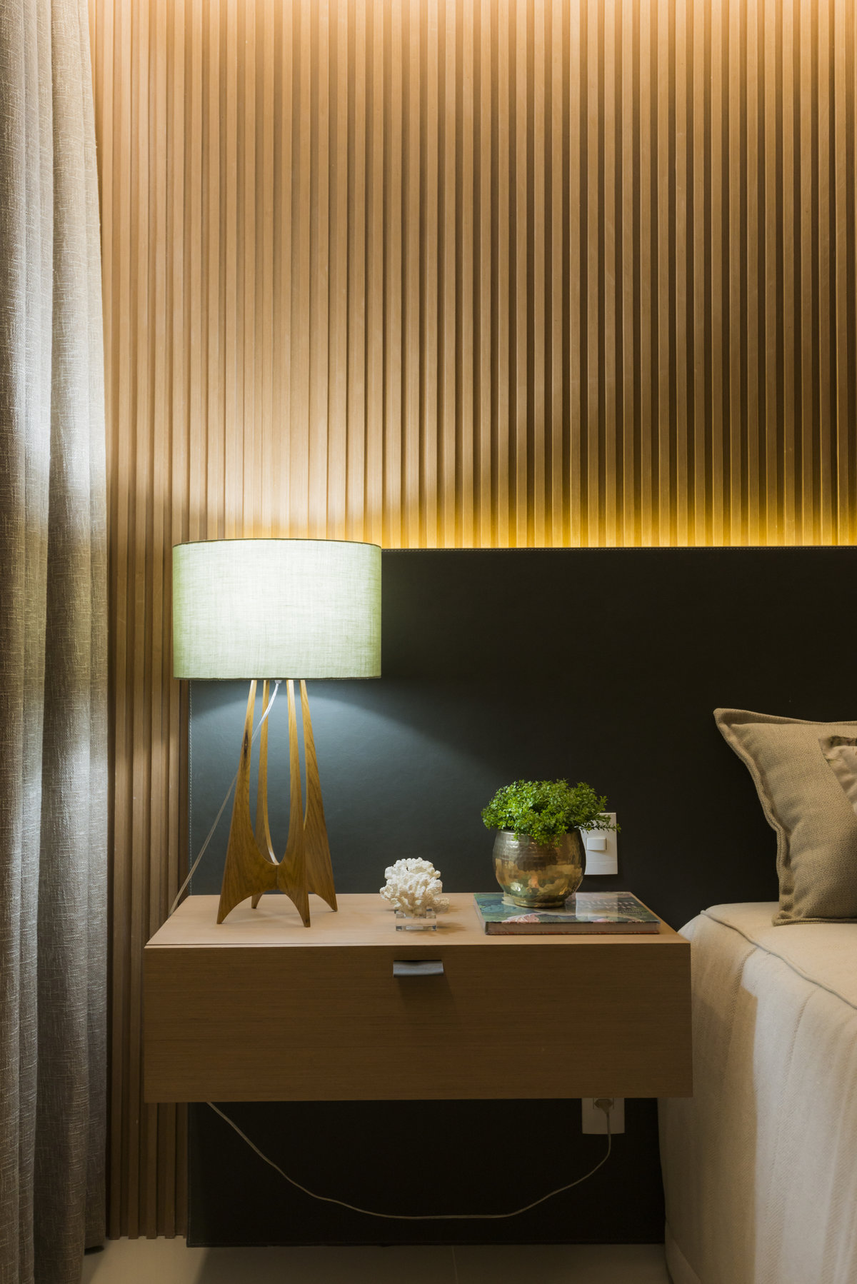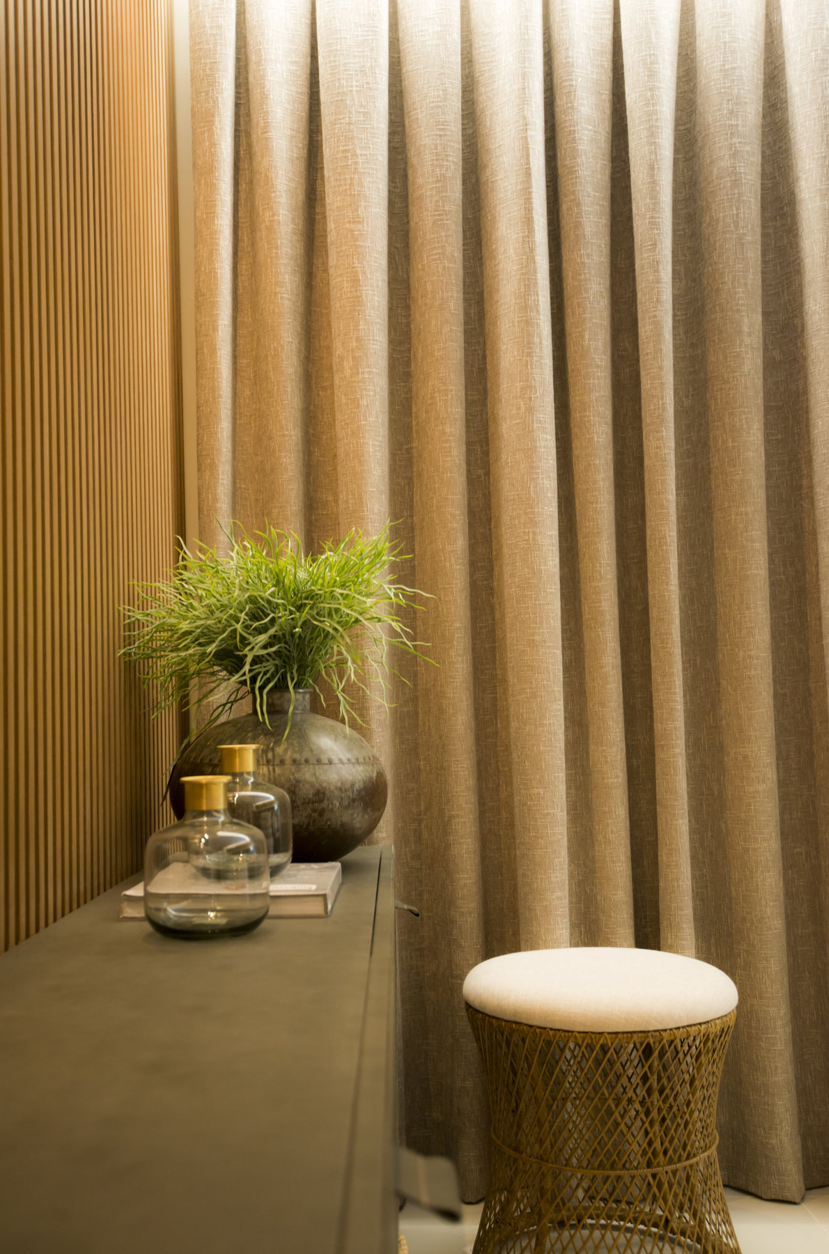 Neste projeto do Aventino, a sofisticação se traduz na simplicidade das linhas e na paleta suave. A sala de jantar se integra com harmonia ao restante do espaço, com mobiliário de traços retos e tons neutros que exaltam elegância e atemporalidade. O painel ripado com iluminação indireta cria profundidade e aconchego, enquanto os grandes cactos trazem personalidade e frescor ao décor.
