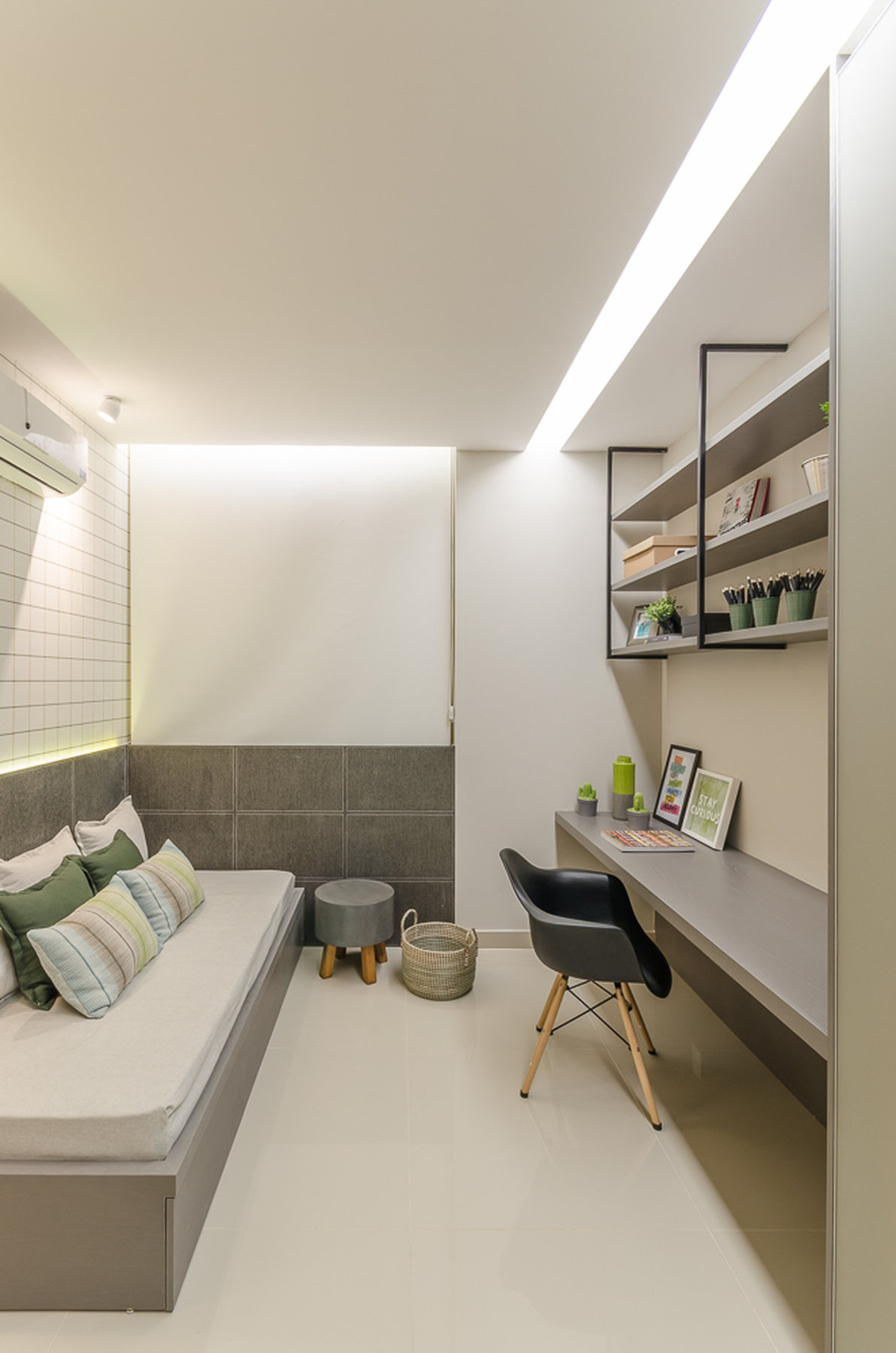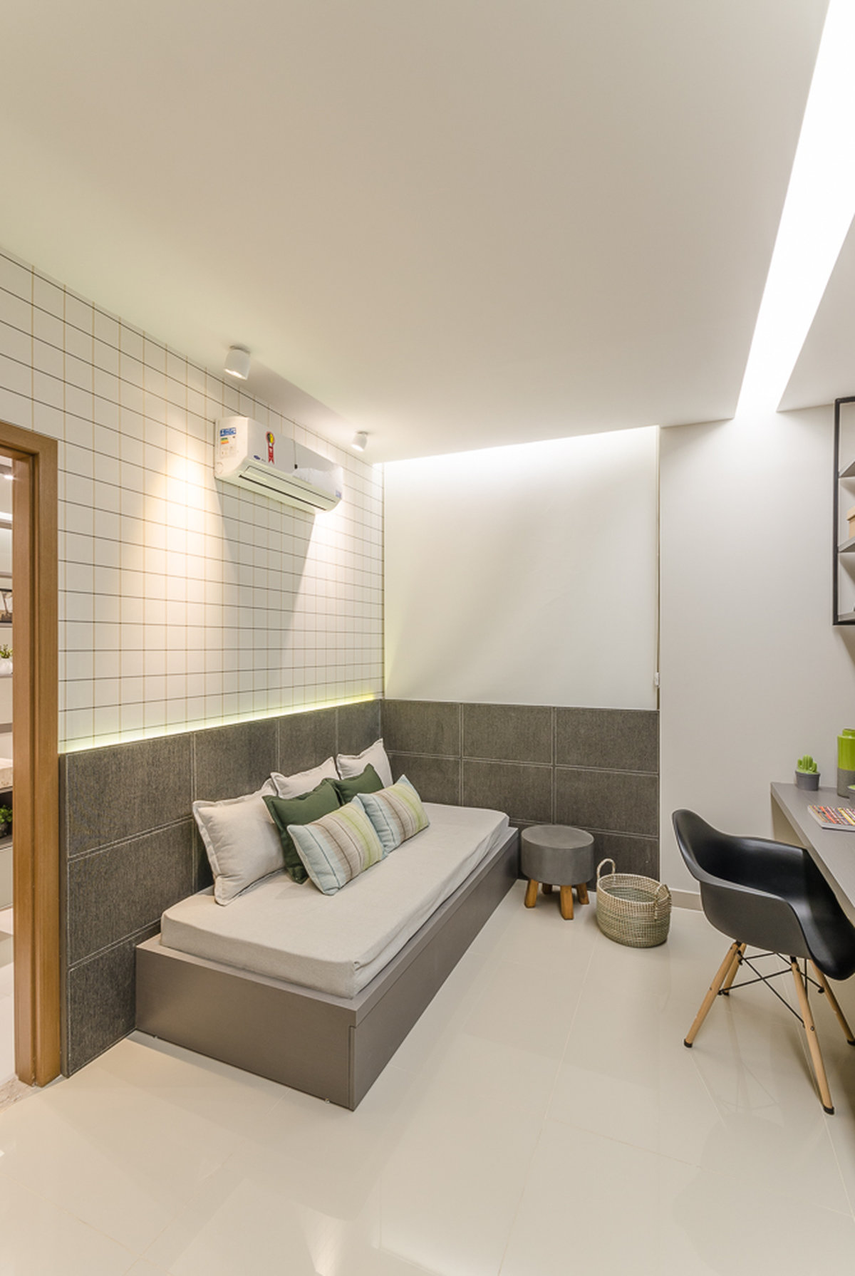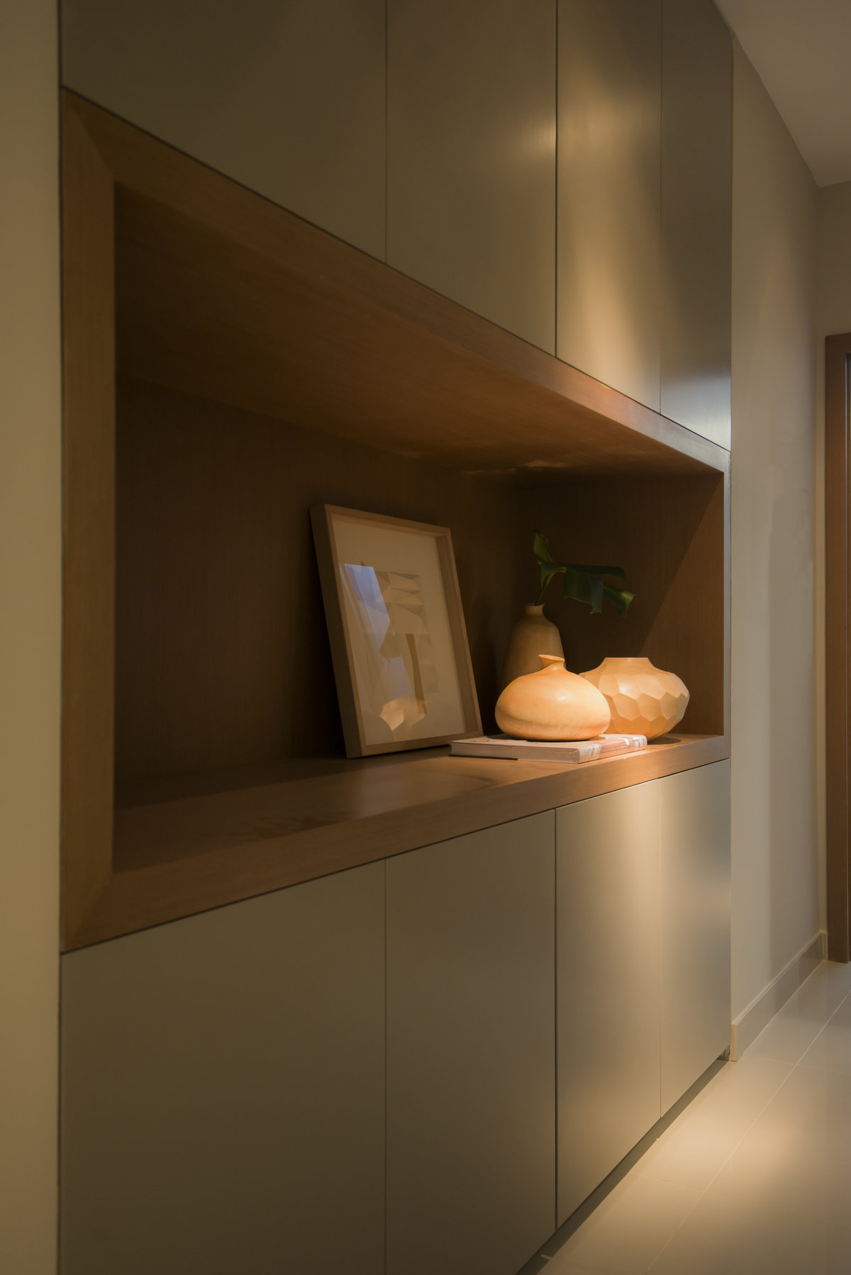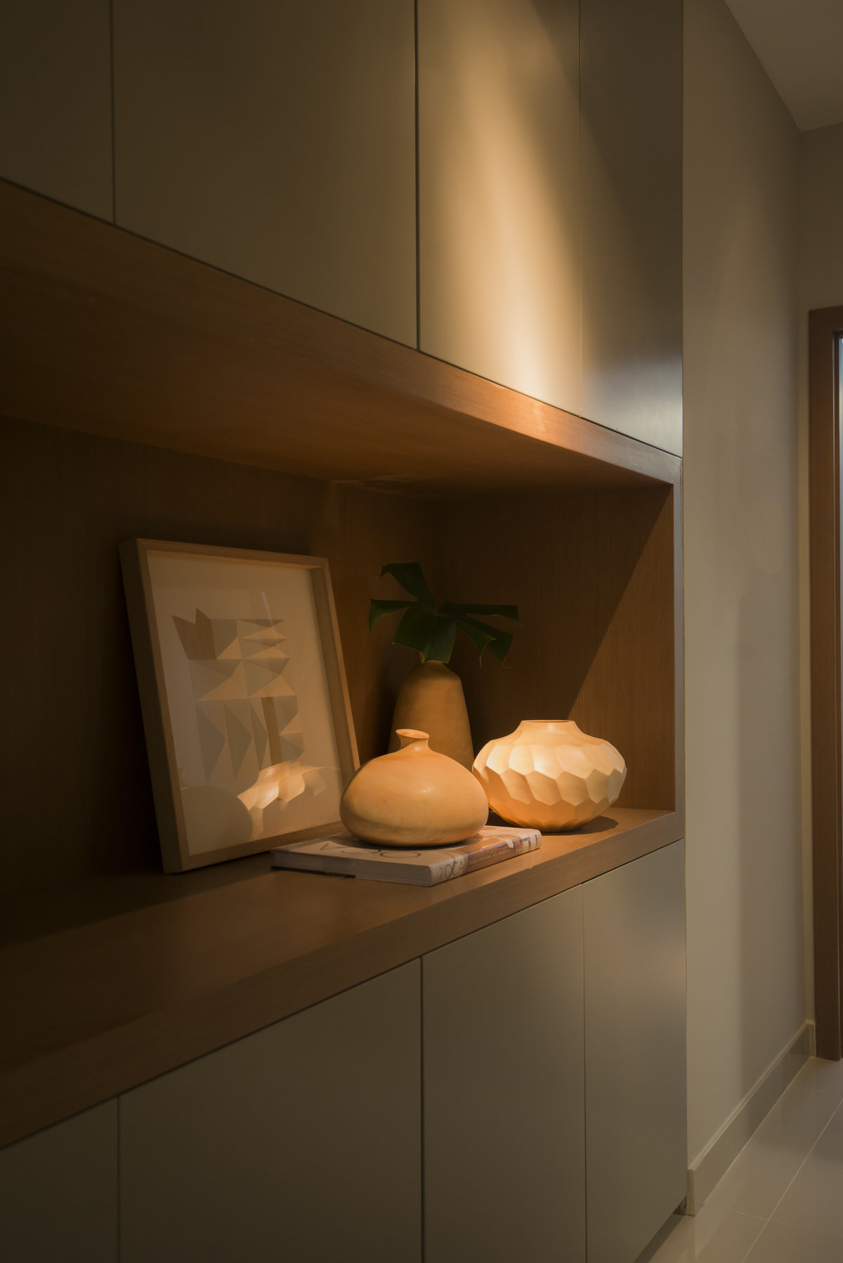 Neste projeto do Aventino, a sofisticação se traduz na simplicidade das linhas e na paleta suave. A sala de jantar se integra com harmonia ao restante do espaço, com mobiliário de traços retos e tons neutros que exaltam elegância e atemporalidade. O painel ripado com iluminação indireta cria profundidade e aconchego, enquanto os grandes cactos trazem personalidade e frescor ao décor.