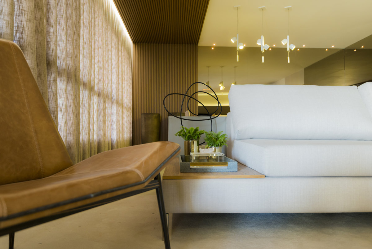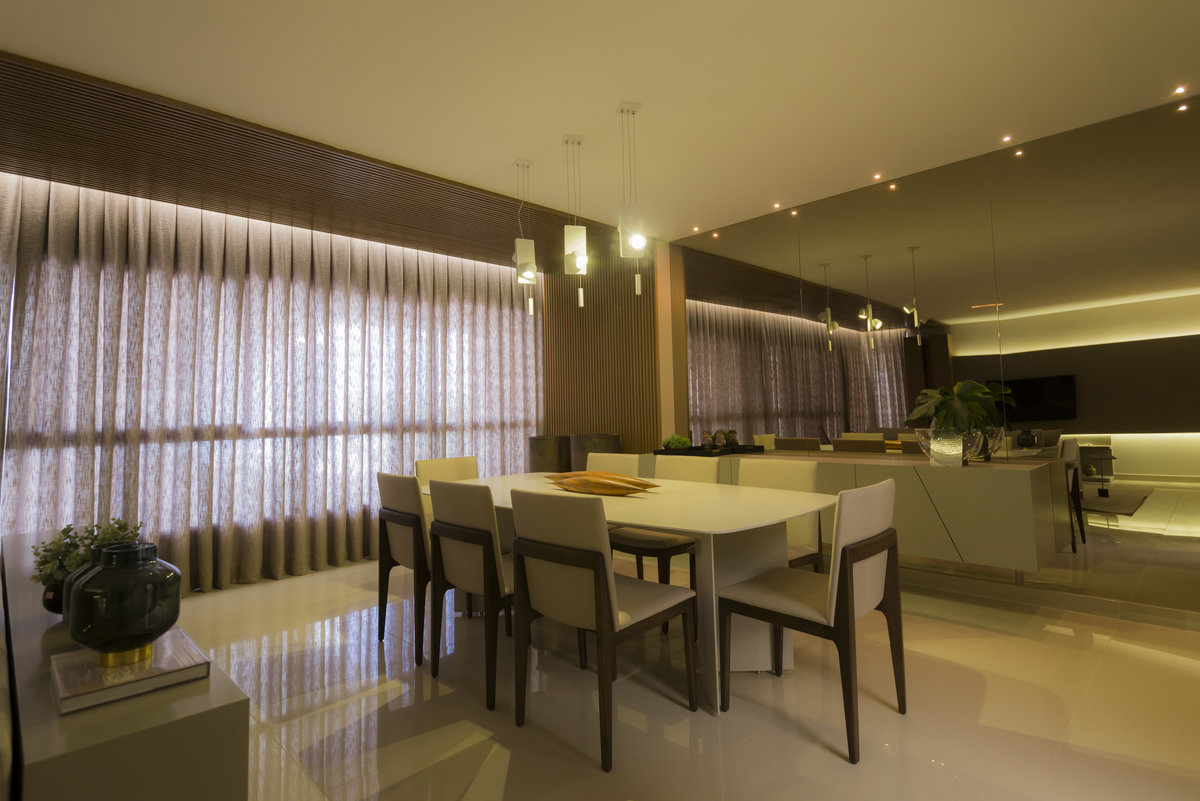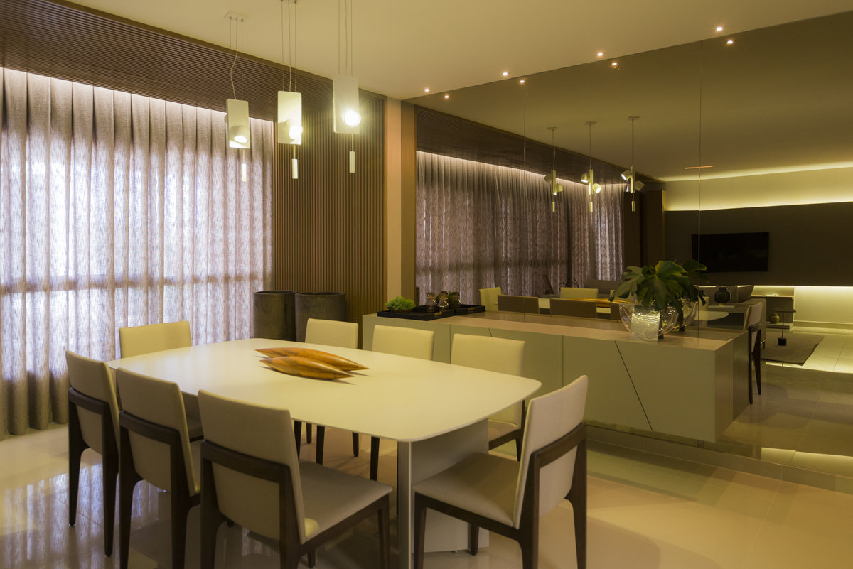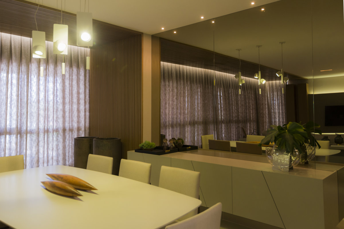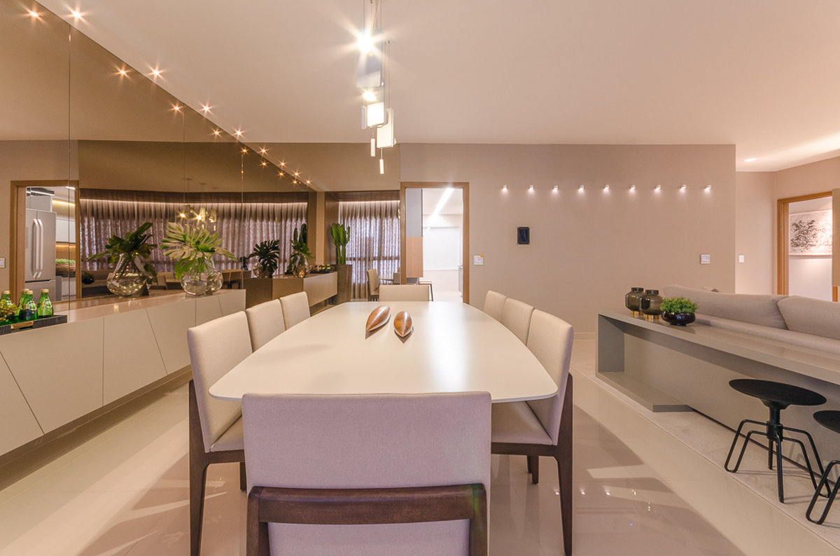 O espelho amplia o ambiente e reforça a iluminação natural, criando um efeito visual que valoriza cada detalhe do design. O aparador suspenso e o bar trazem leveza e funcionalidade, equilibrando estética e praticidade. Um espaço pensado para receber com sofisticação, sem abrir mão do conforto e da identidade.