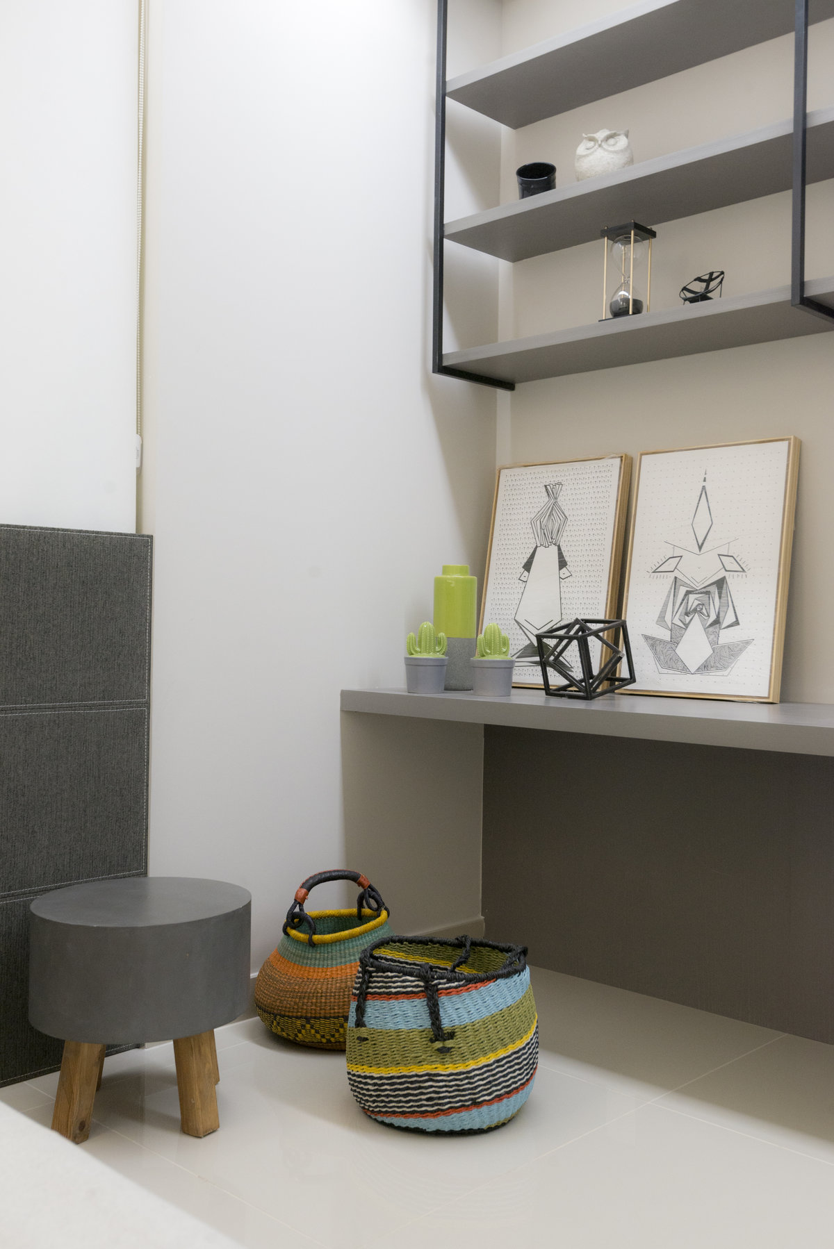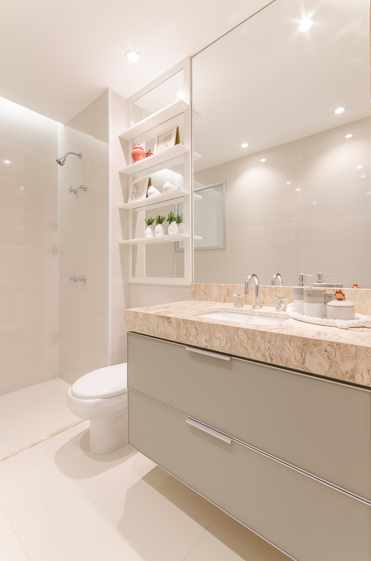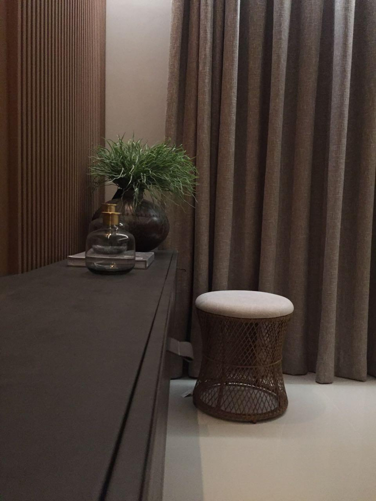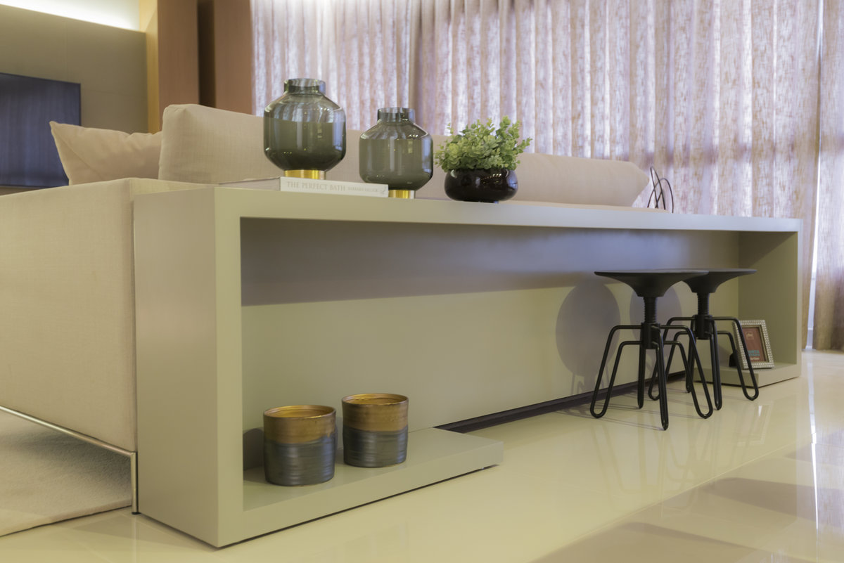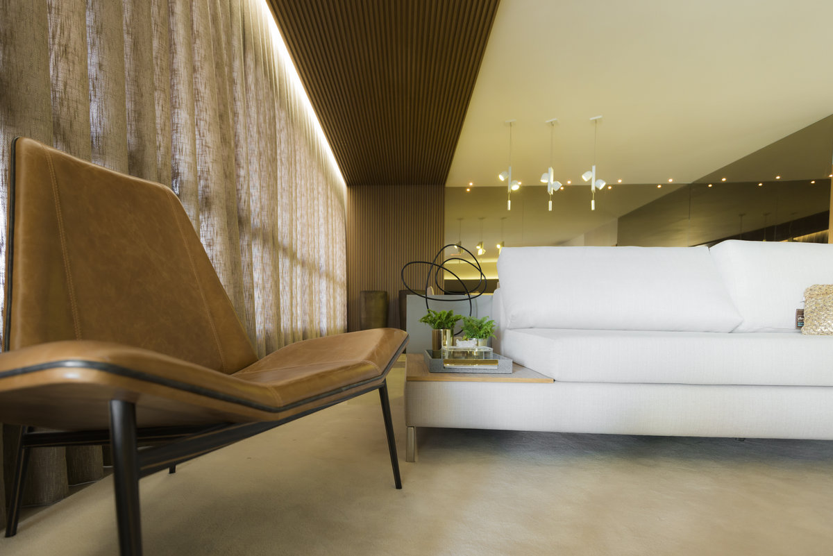O espelho amplia o ambiente e reforça a iluminação natural, criando um efeito visual que valoriza cada detalhe do design. O aparador suspenso e o bar trazem leveza e funcionalidade, equilibrando estética e praticidade. Um espaço pensado para receber com sofisticação, sem abrir mão do conforto e da identidade.