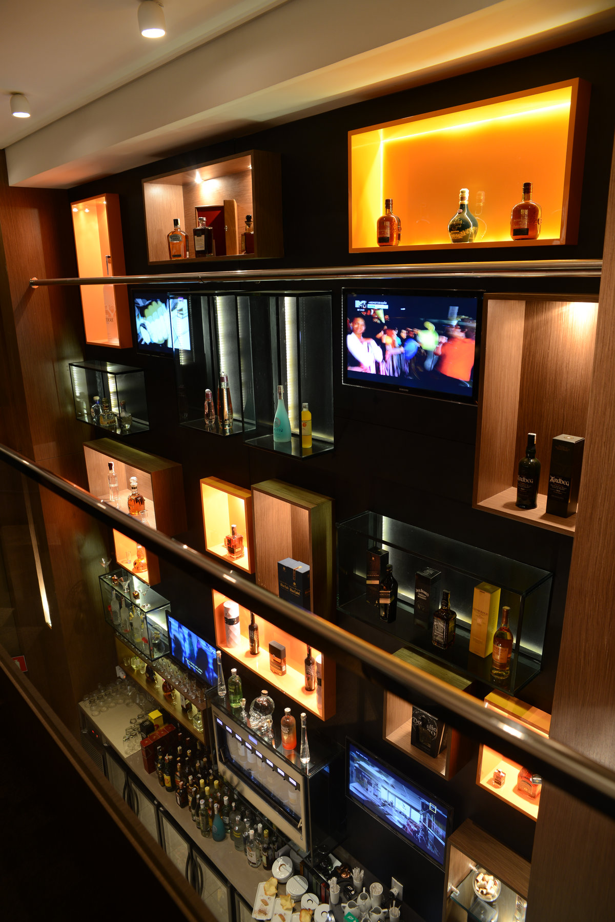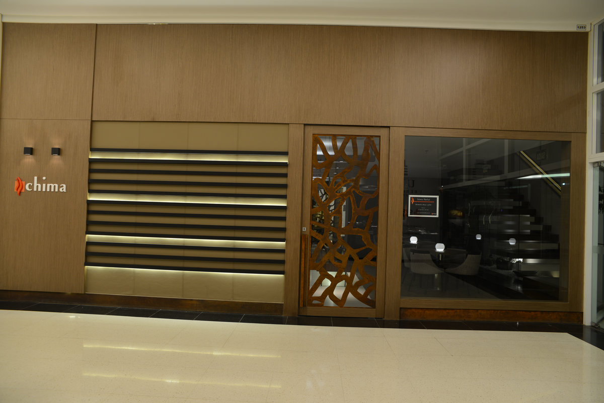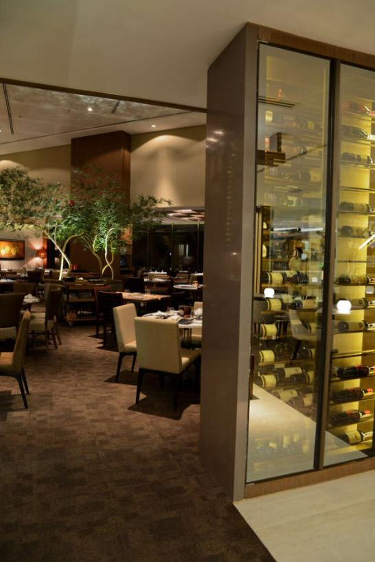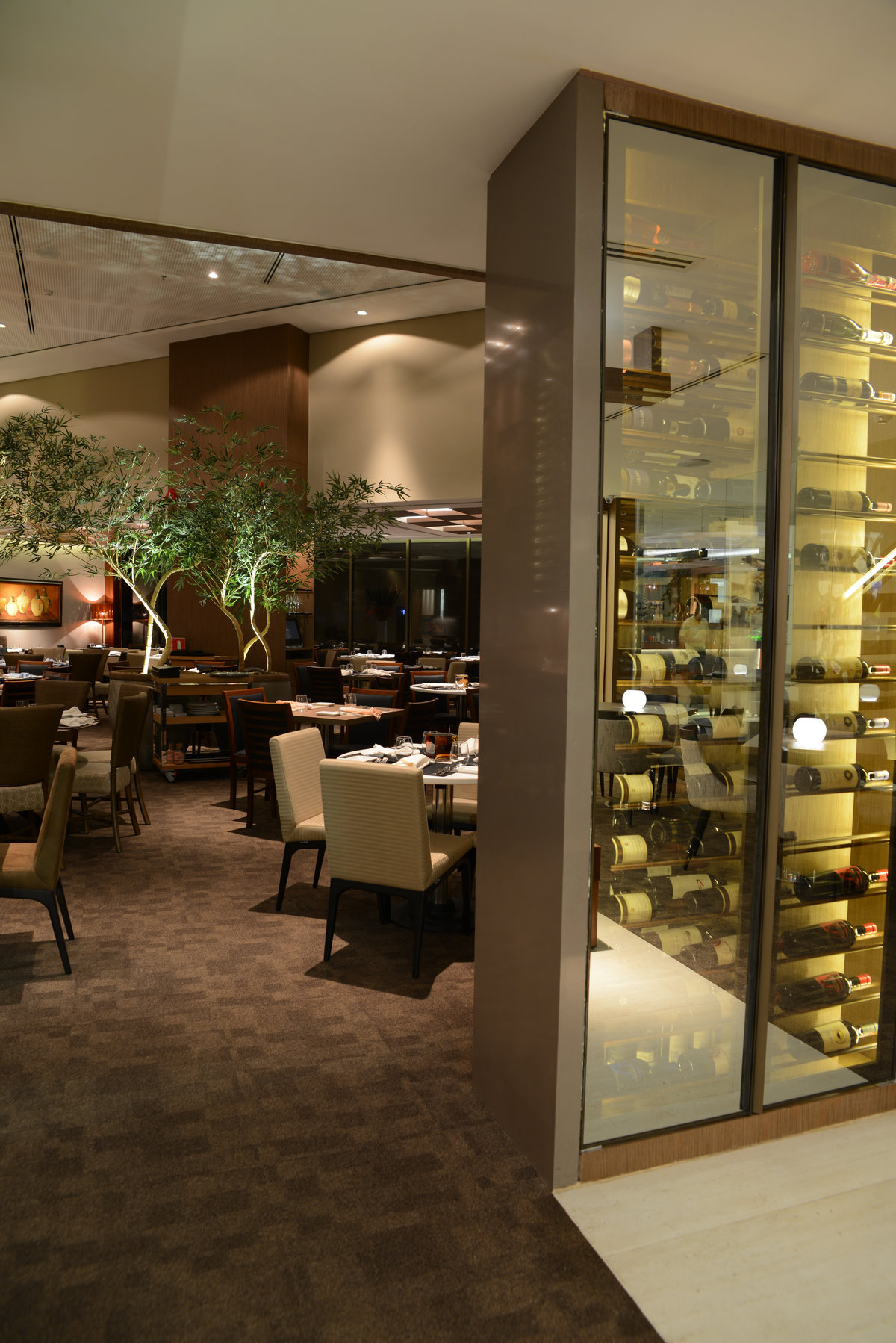 A parede com painéis em relevo proporciona profundidade e sofisticação, enquanto a grande adega vertical com estrutura metálica e iluminação embutida torna-se um ponto focal do salão, agregando um toque de requinte e funcionalidade.
