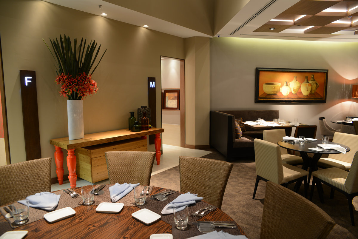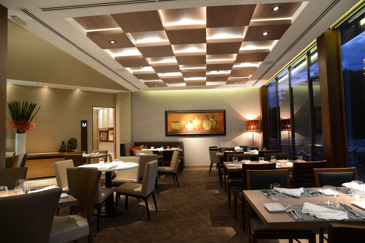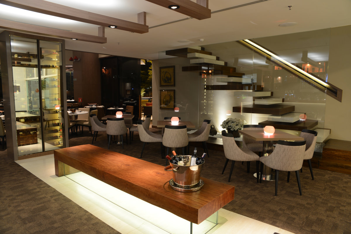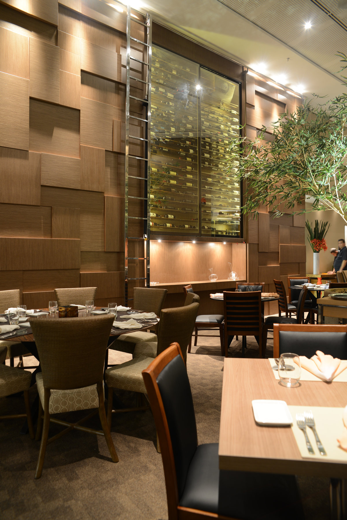 O projeto de interiores deste restaurante destaca-se pela elegância contemporânea e pelo uso inteligente de materiais e elementos naturais para criar um ambiente acolhedor e sofisticado. O espaço explora uma paleta de tons terrosos, com destaque para o uso extensivo da madeira, presente em painéis, mobiliário e acabamentos, o que confere calor e conforto visual ao ambiente.