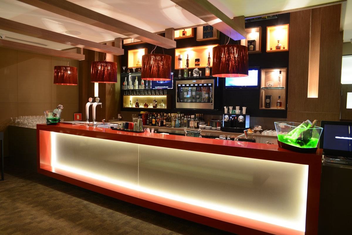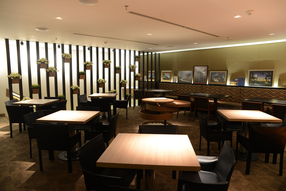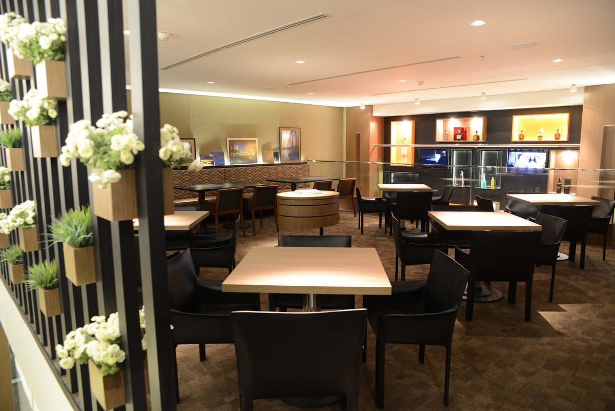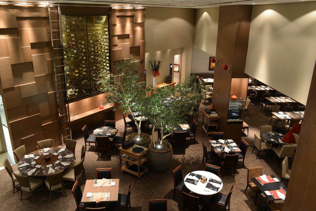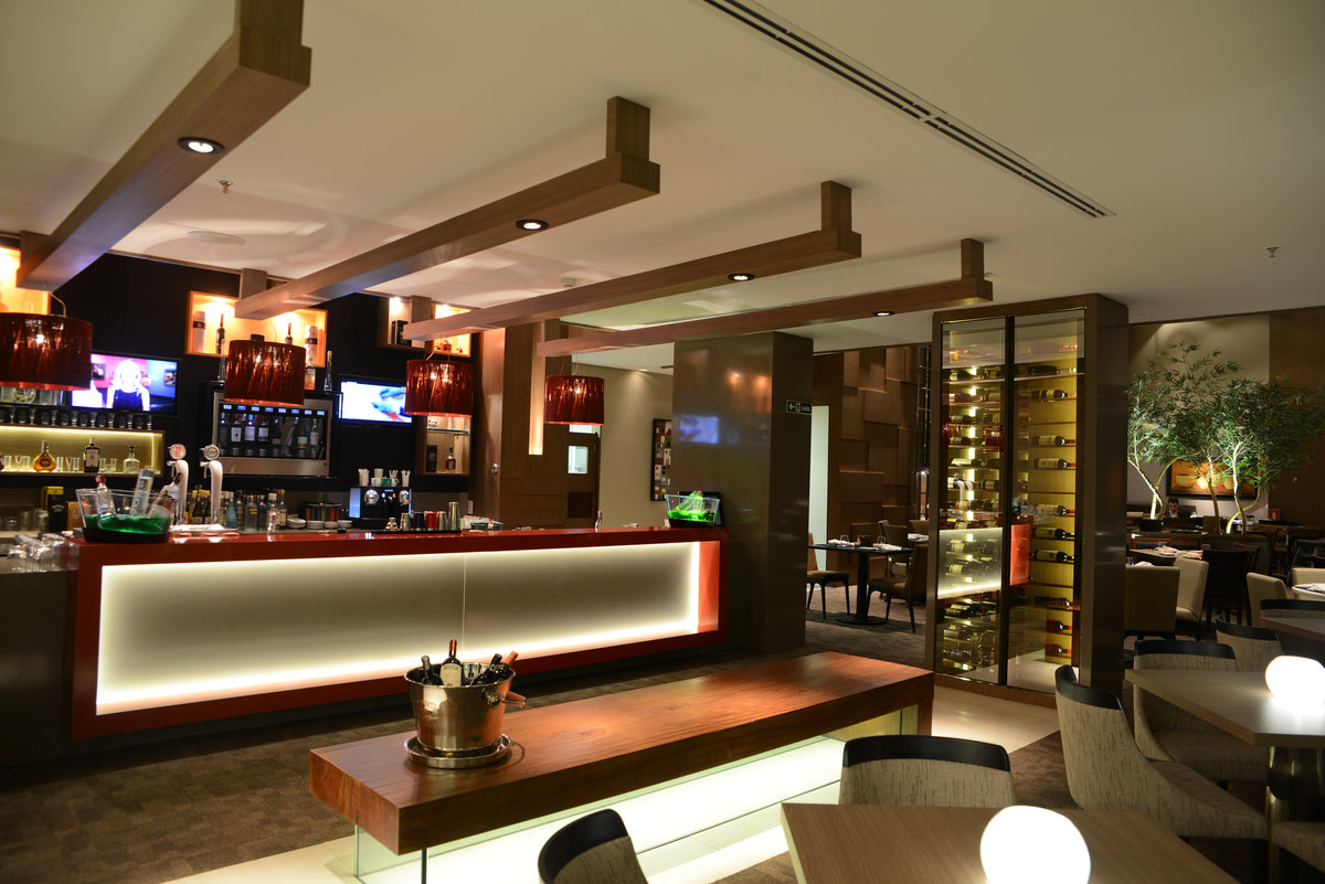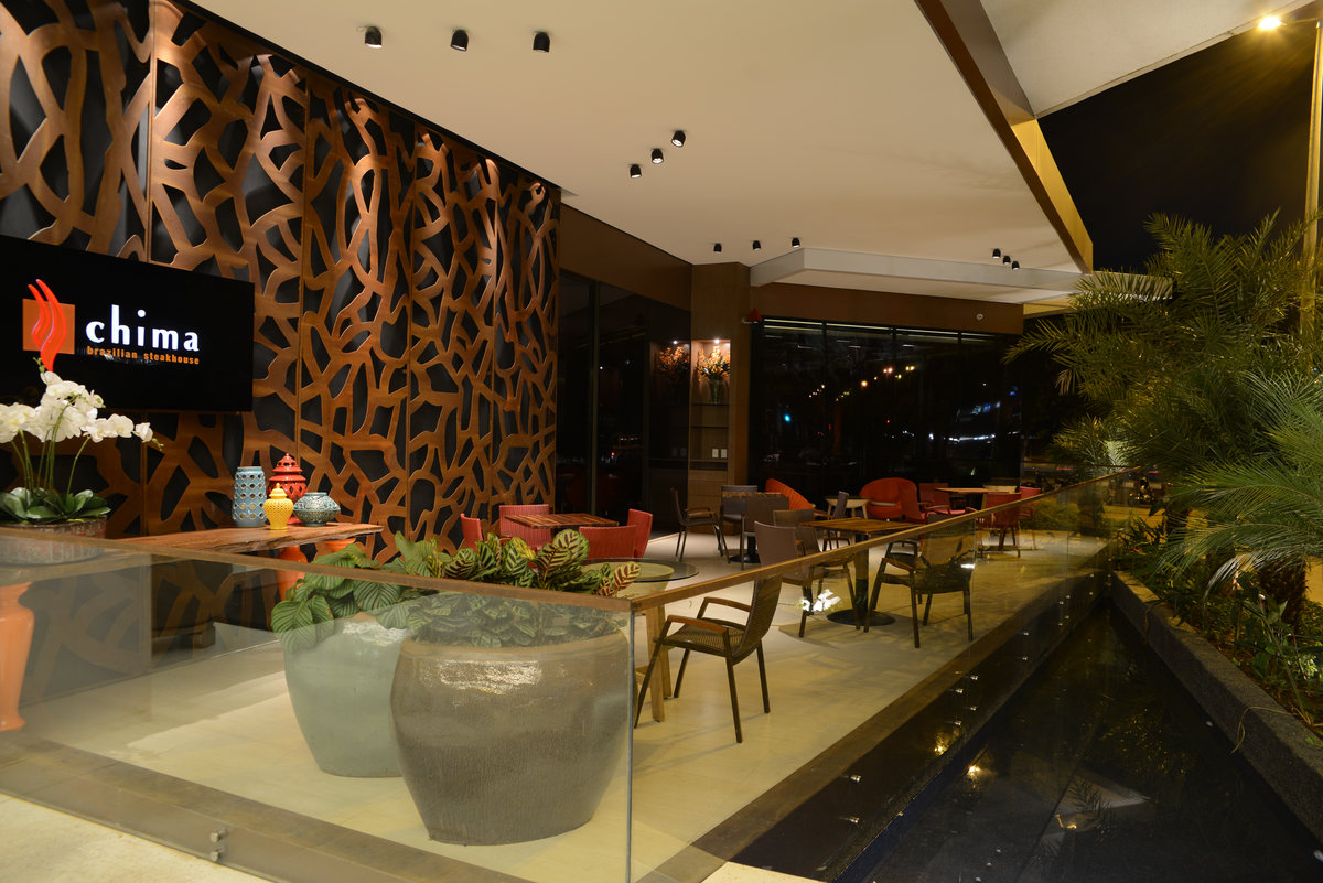 No centro do layout, árvores naturais em grandes vasos trazem frescor e vida ao espaço, além de funcionarem como divisores sutis que delimitam áreas sem comprometer a fluidez da circulação. A iluminação indireta, embutida no forro e nas paredes, cria uma atmosfera intimista e acolhedora, ideal para experiências gastronômicas prolongadas.