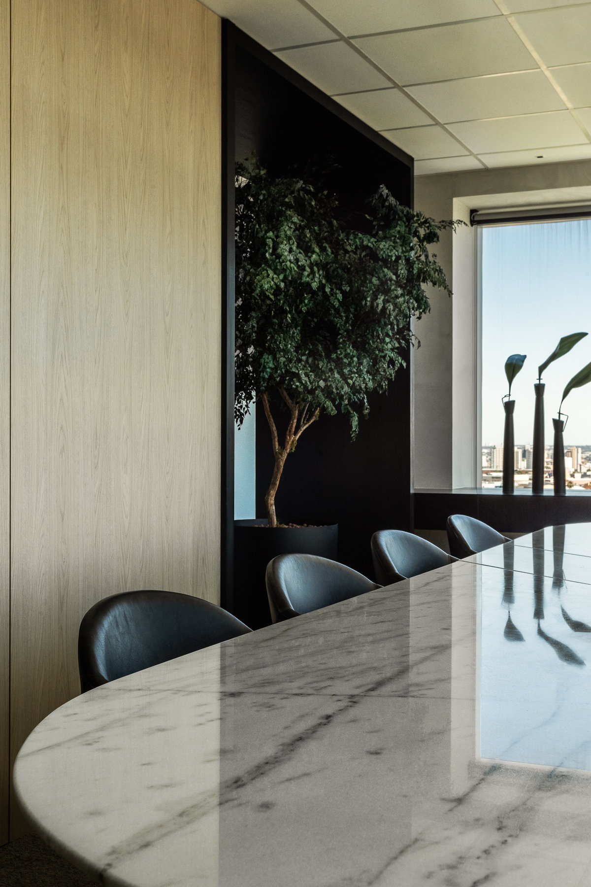 O design aposta em proporções generosas e materiais nobres para refletir a importância do ambiente onde está inserida: um espaço de decisões, encontros e criatividade. A base robusta, em tom escuro fosco, contrasta com a superfície polida da pedra, reforçando a dualidade entre solidez e fluidez — marca registrada do olhar sensível de Sandra.
