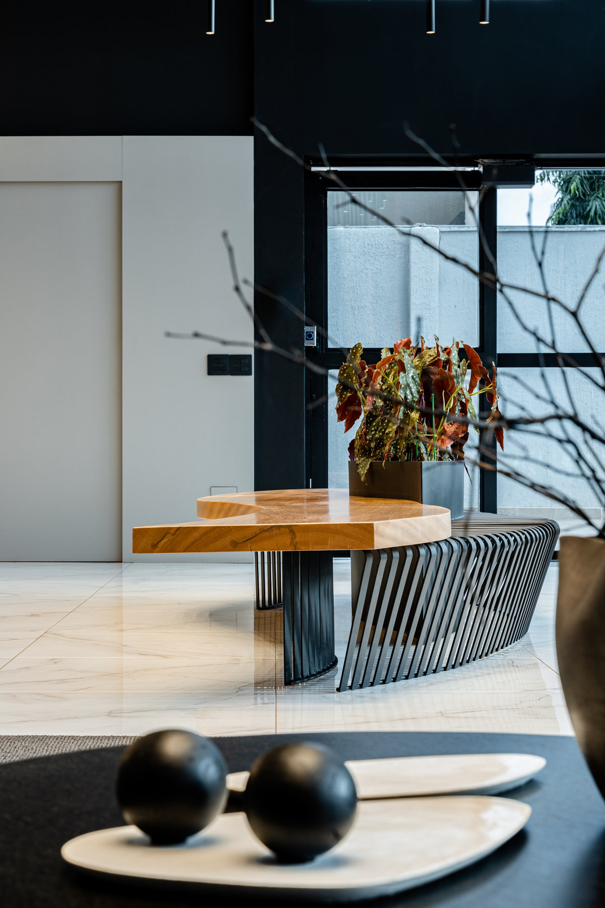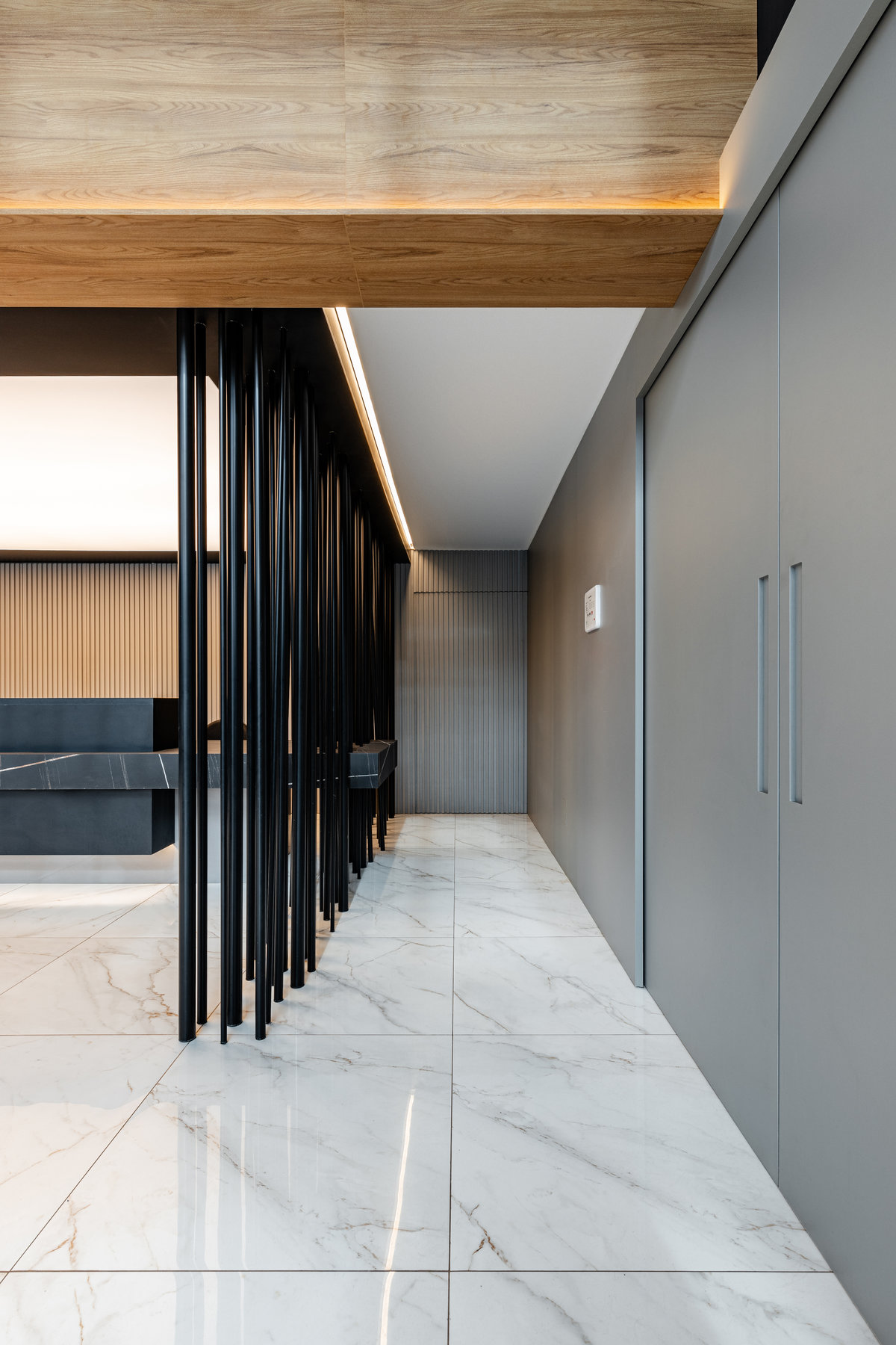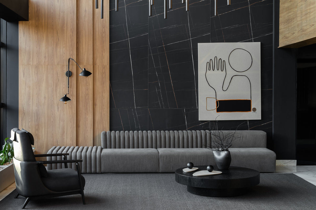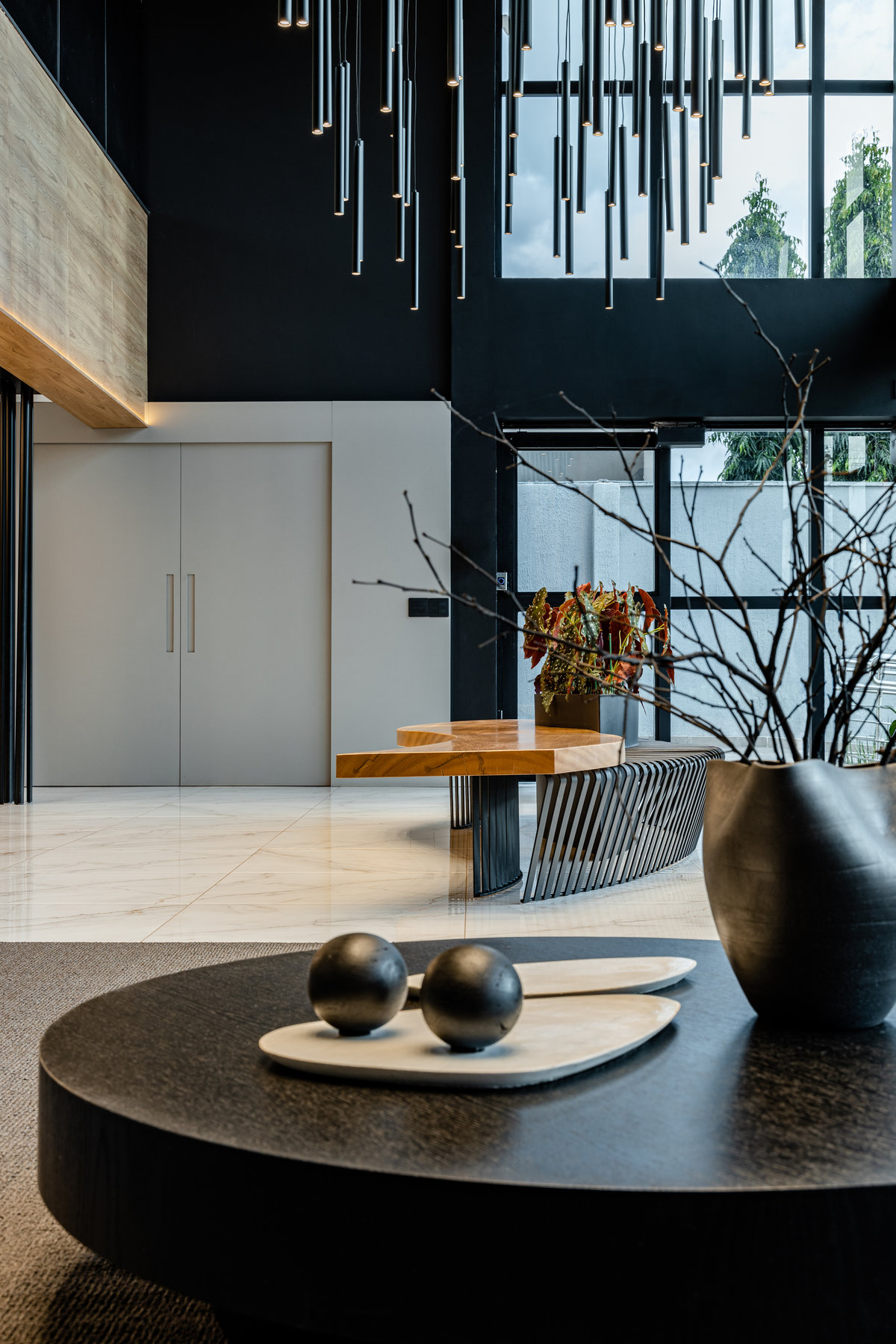 A paleta de materiais aposta em contrastes elegantes: mármore branco com veios suaves no piso, painéis amadeirados no forro e paredes, além de superfícies em pedra escura e elementos metálicos pretos que reforçam o estilo urbano e refinado. A luz natural, filtrada pelas grandes aberturas, projeta sombras marcantes que ampliam a sensação de movimento e profundidade no espaço.