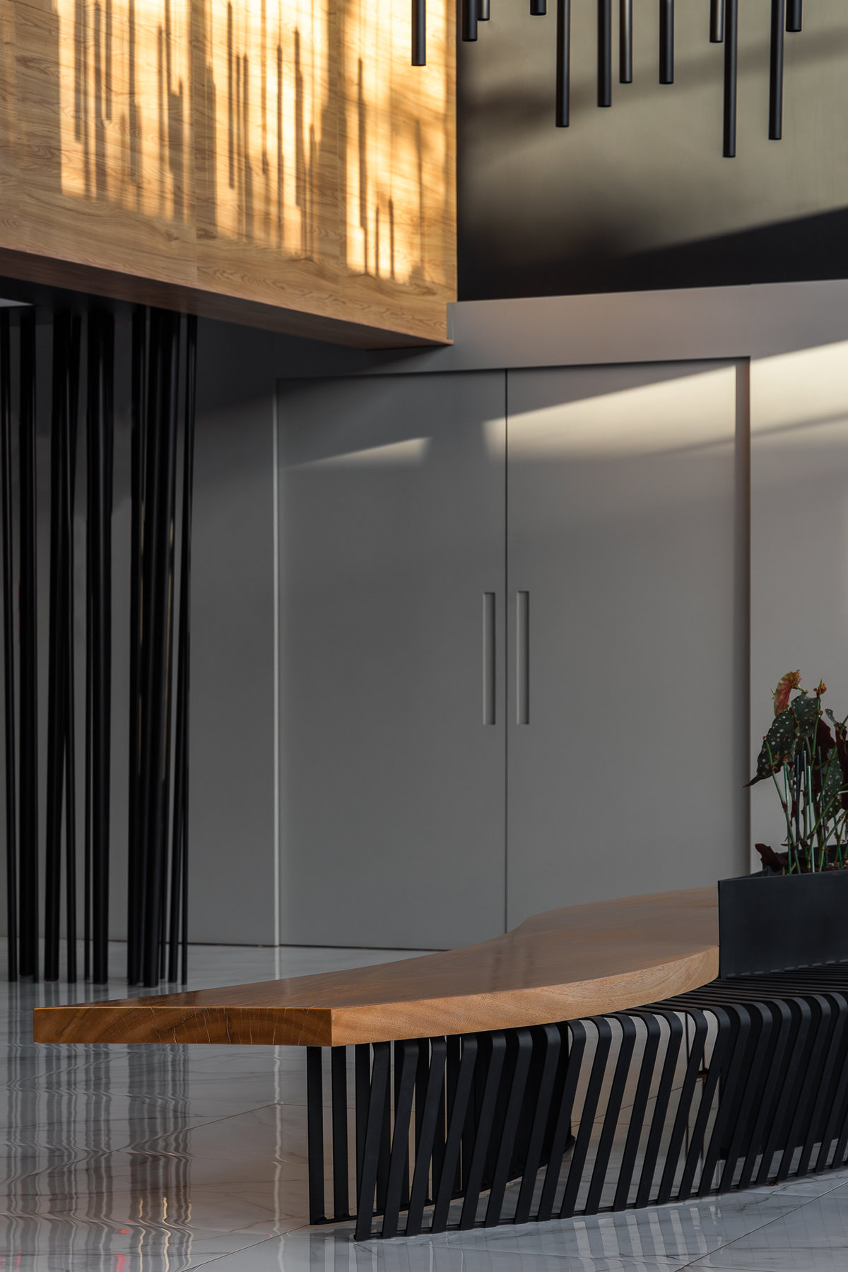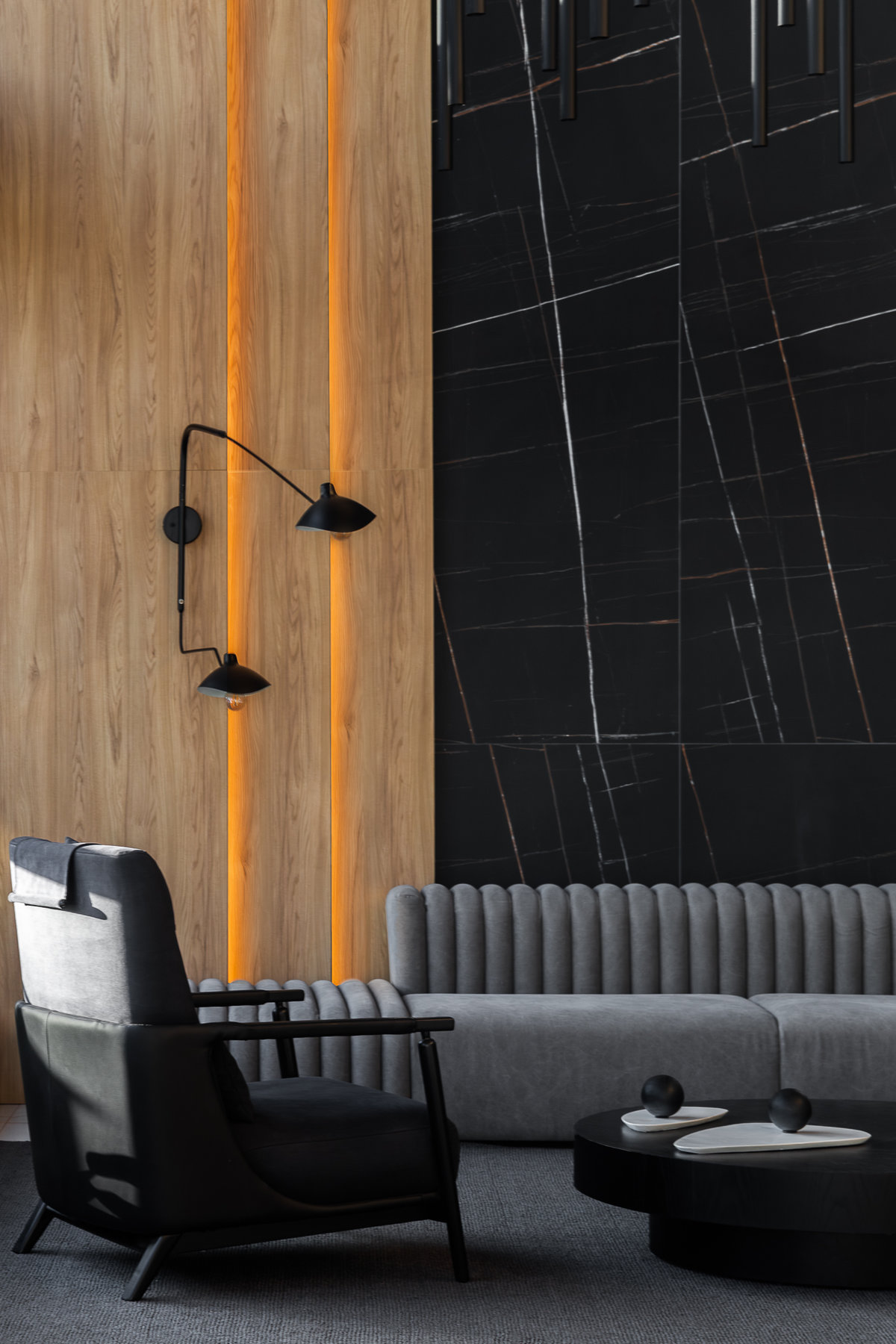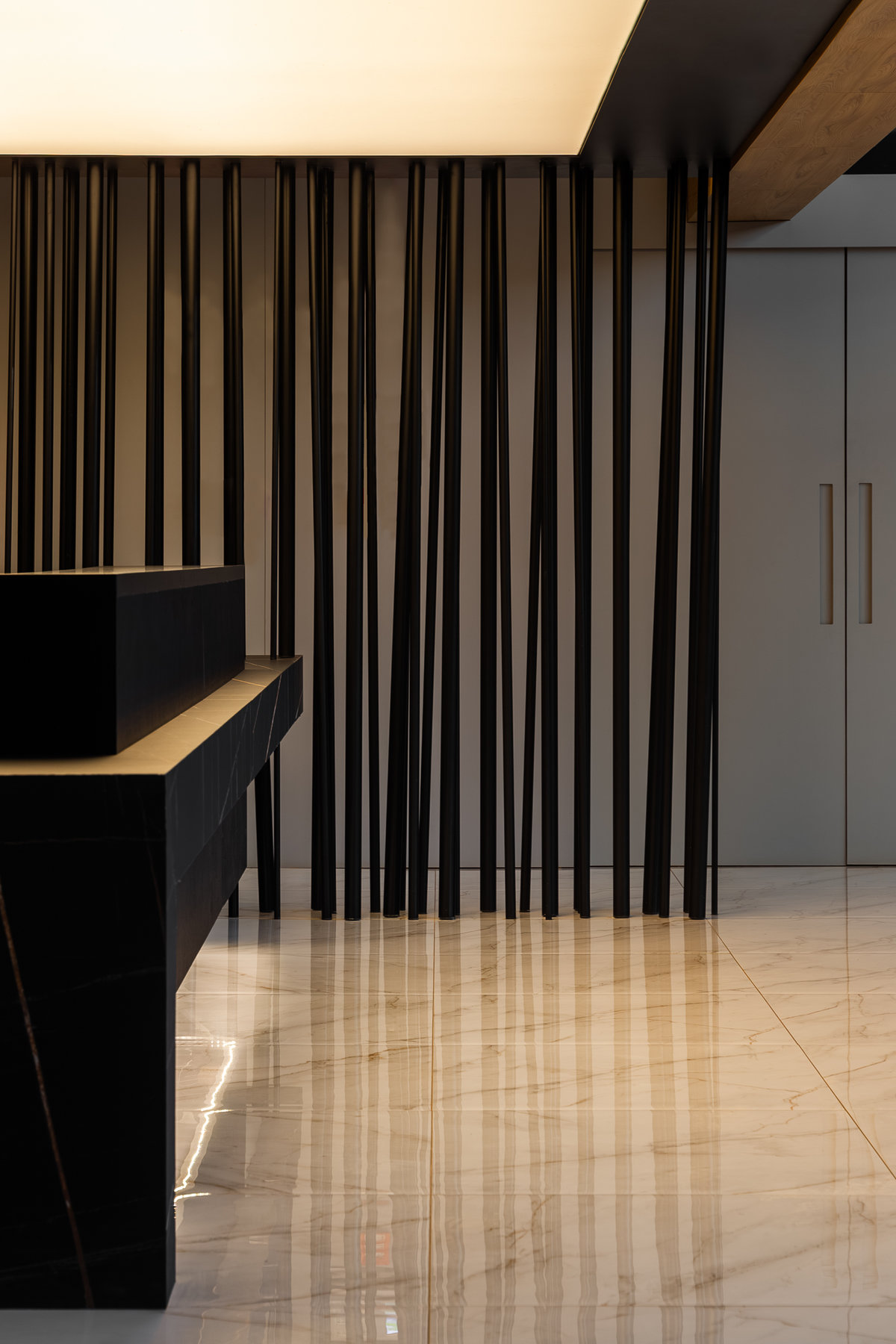 A paleta de materiais aposta em contrastes elegantes: mármore branco com veios suaves no piso, painéis amadeirados no forro e paredes, além de superfícies em pedra escura e elementos metálicos pretos que reforçam o estilo urbano e refinado. A luz natural, filtrada pelas grandes aberturas, projeta sombras marcantes que ampliam a sensação de movimento e profundidade no espaço.