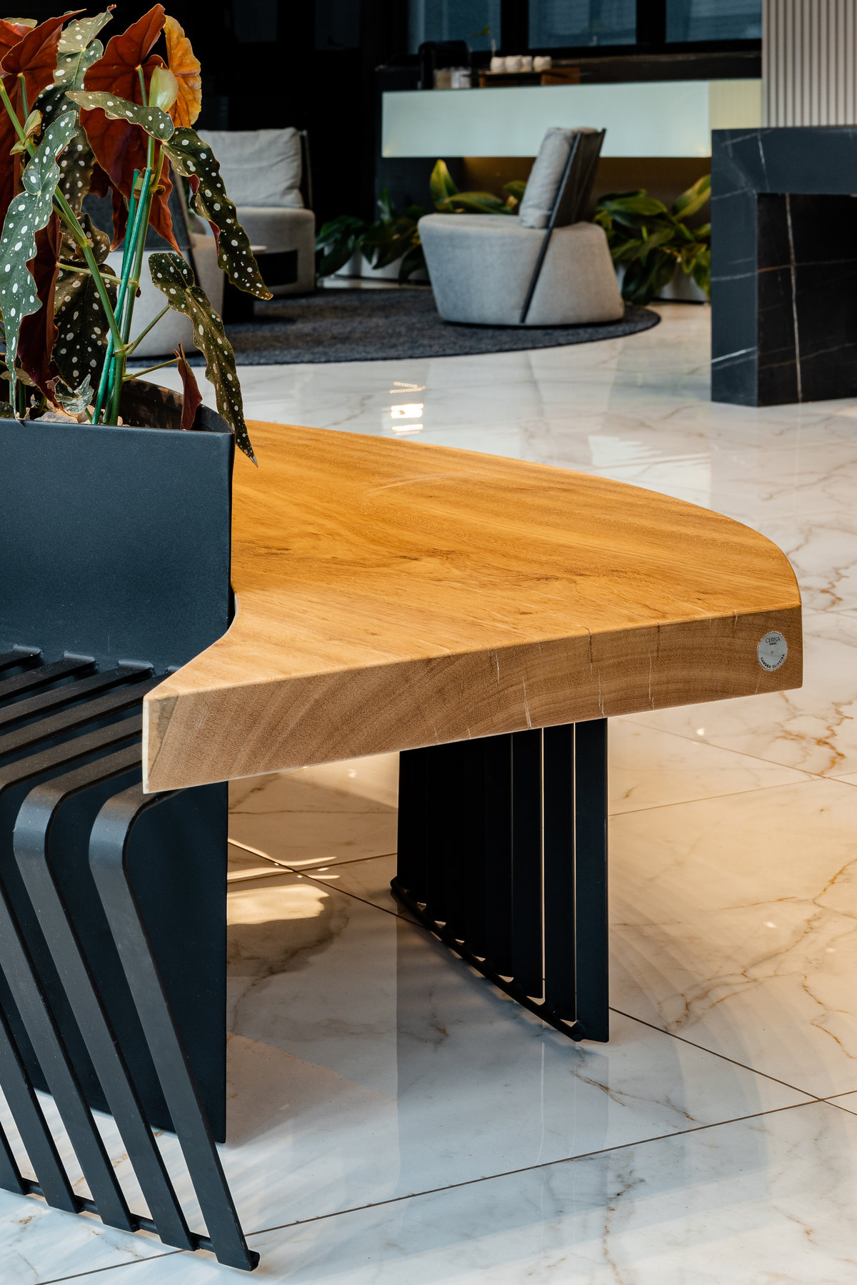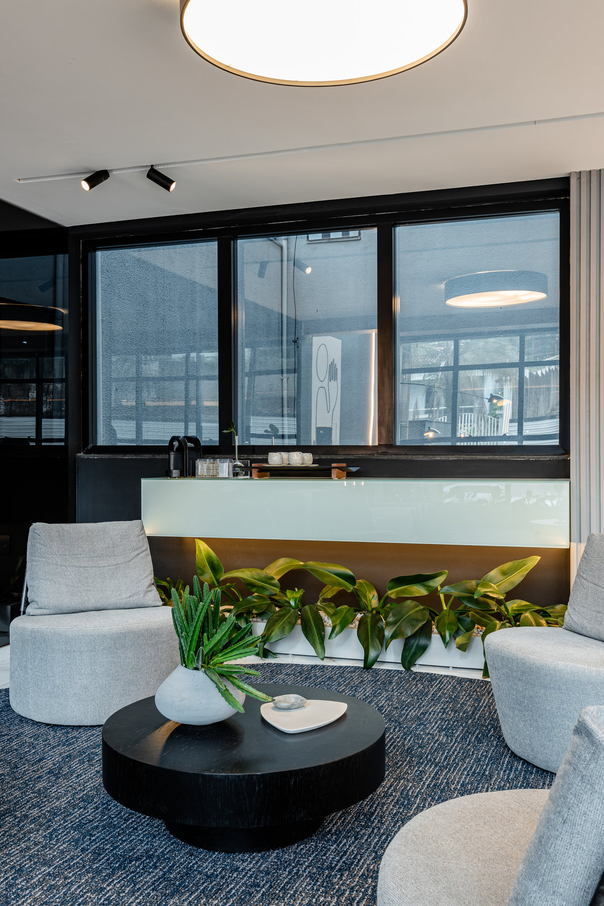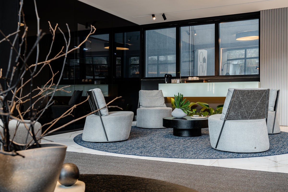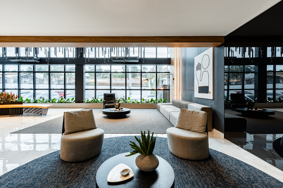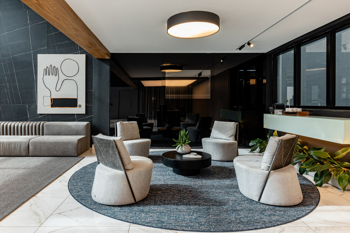 O mobiliário de linhas modernas oferece conforto e funcionalidade, enquanto a paleta de cores neutras, com toques quentes, transmite sobriedade e sofisticação. A presença de elementos naturais, como plantas e acabamentos orgânicos, equilibra o ambiente e suaviza a experiência do visitante.