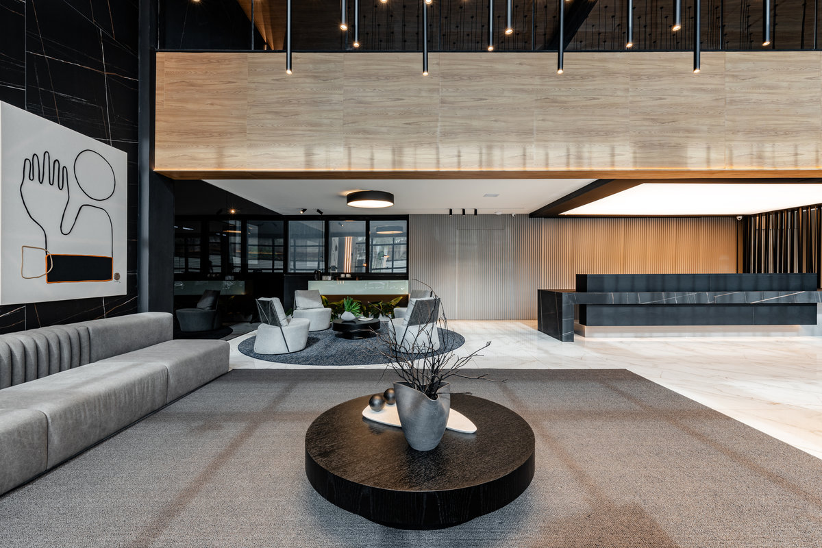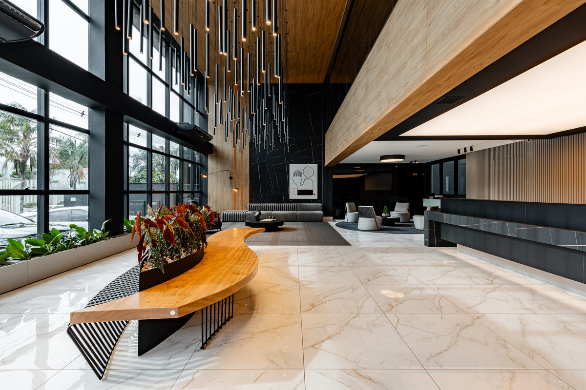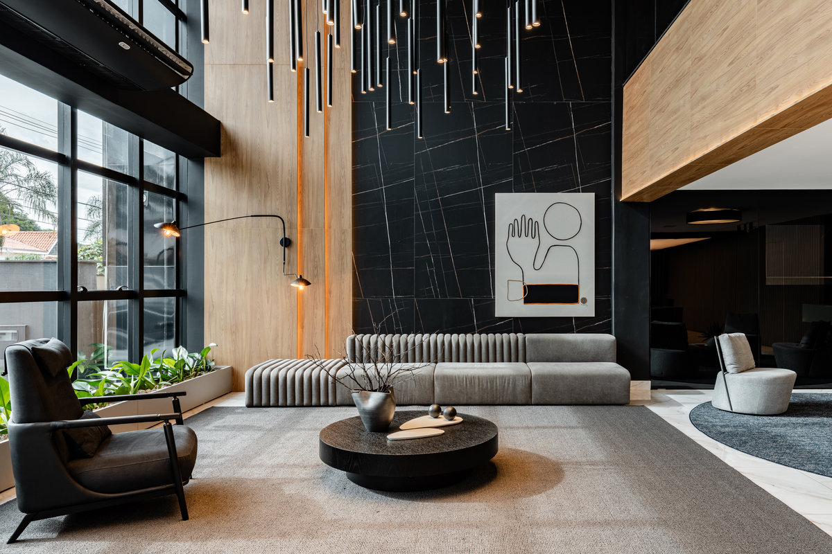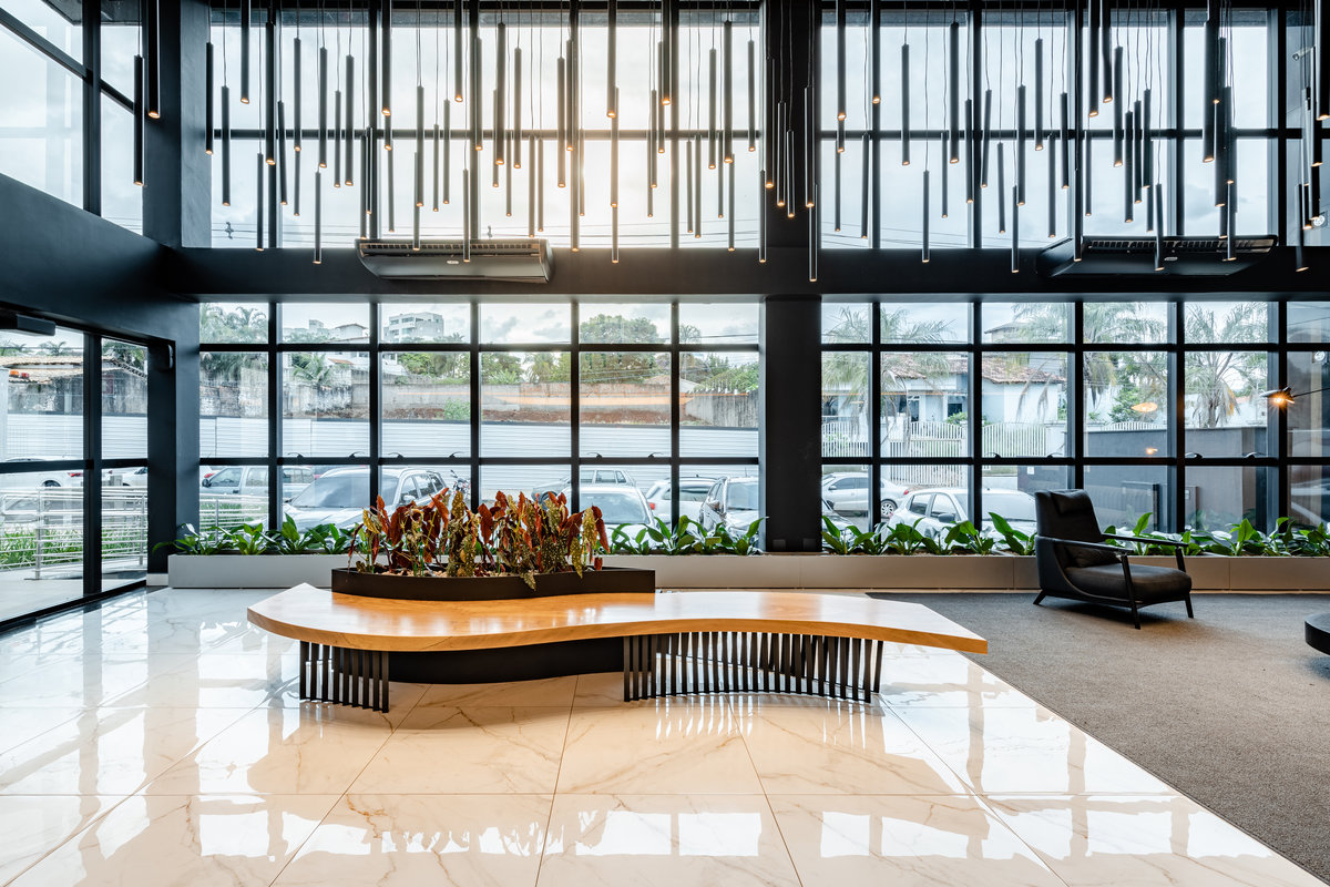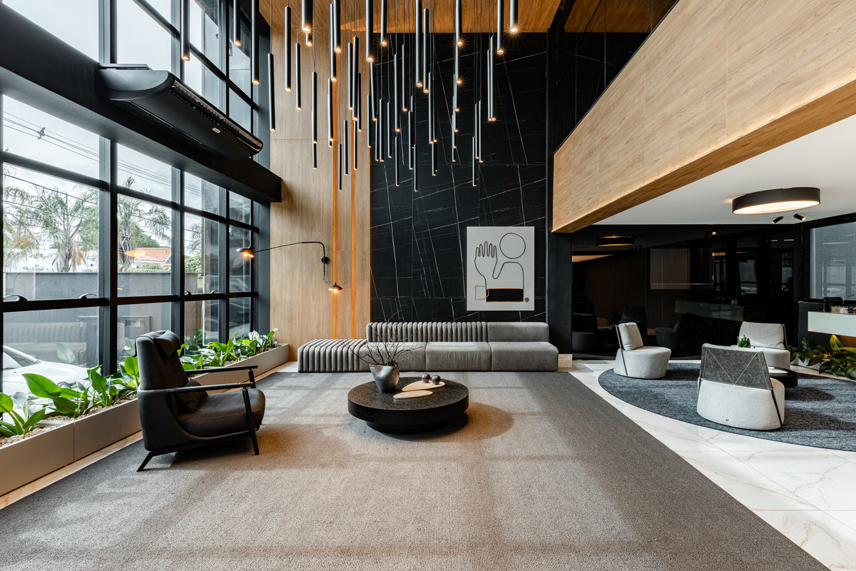 Este lobby corporativo impressiona pela imponência arquitetônica e pelo equilíbrio entre sofisticação, design contemporâneo e funcionalidade. O projeto explora ao máximo a verticalidade do pé-direito duplo, valorizada por uma instalação luminosa escultural composta por pendentes cilíndricos em diferentes alturas, que criam um efeito visual dinâmico e sofisticado.