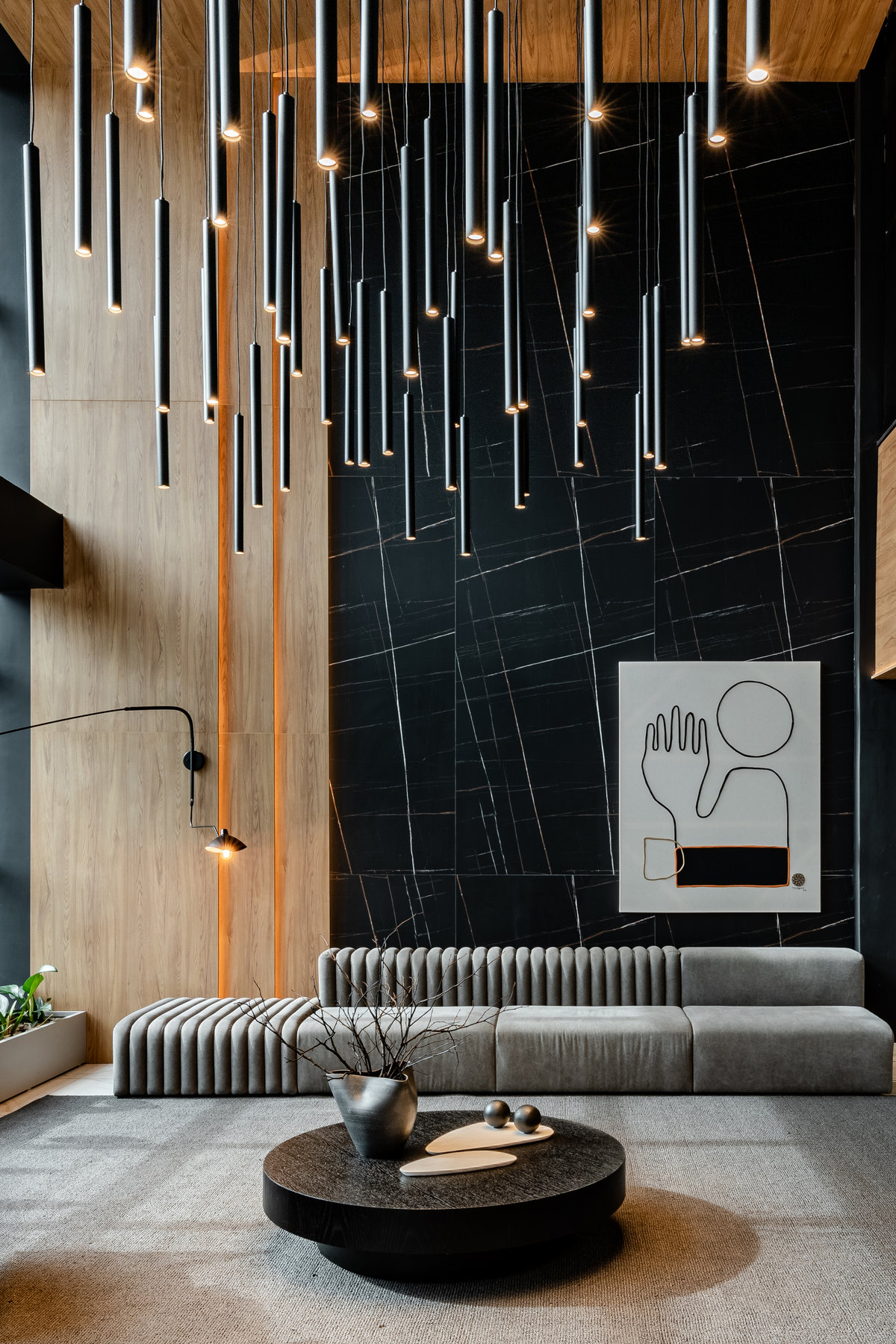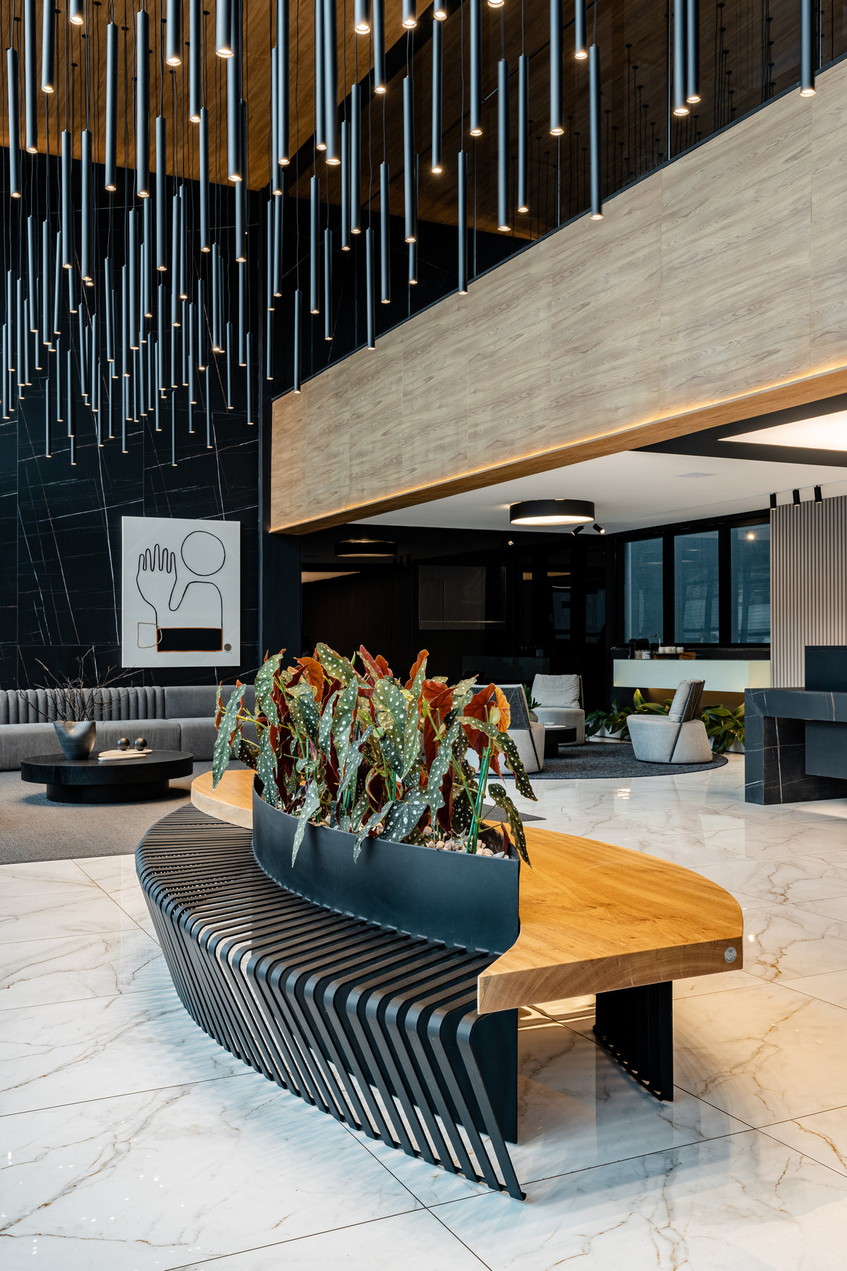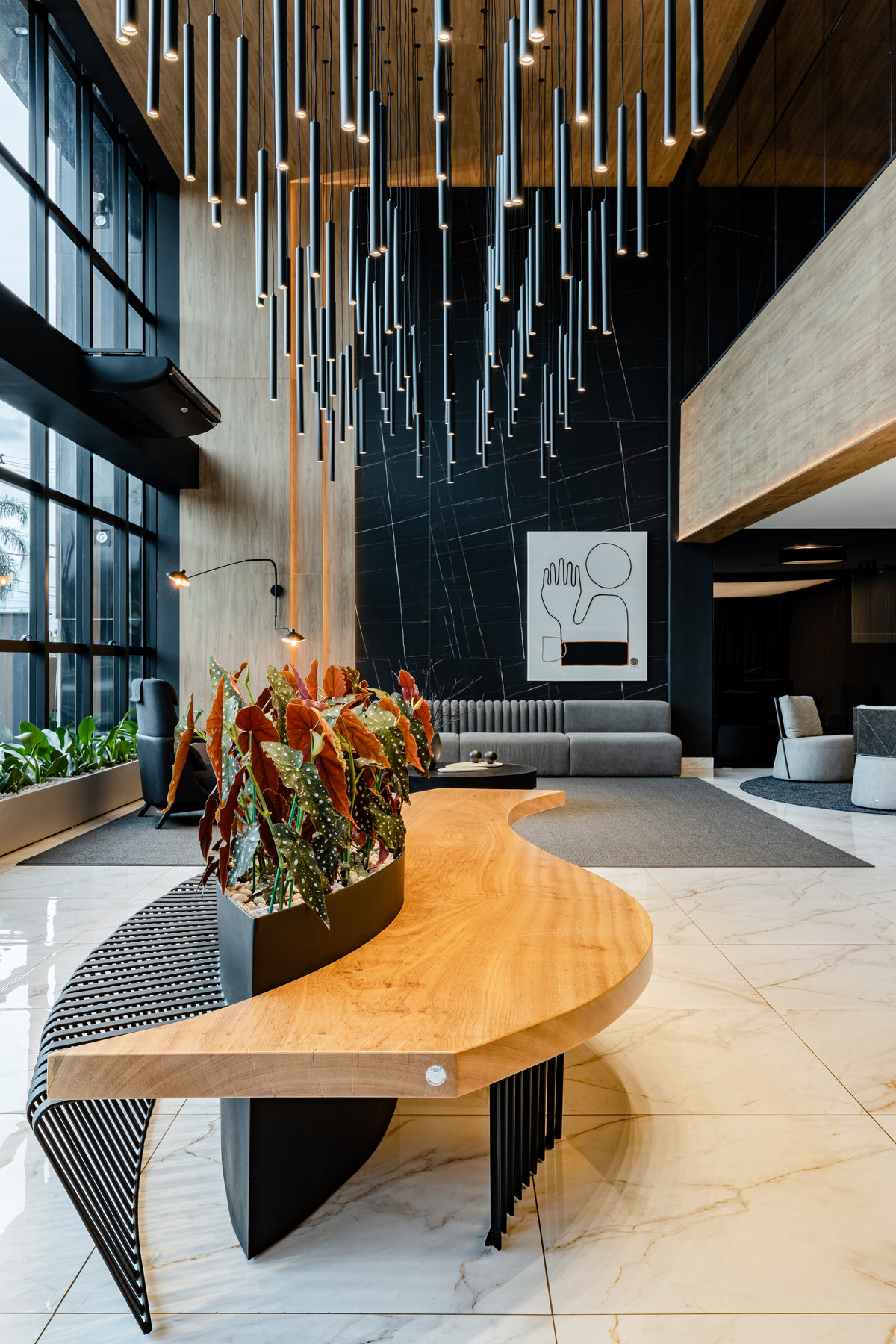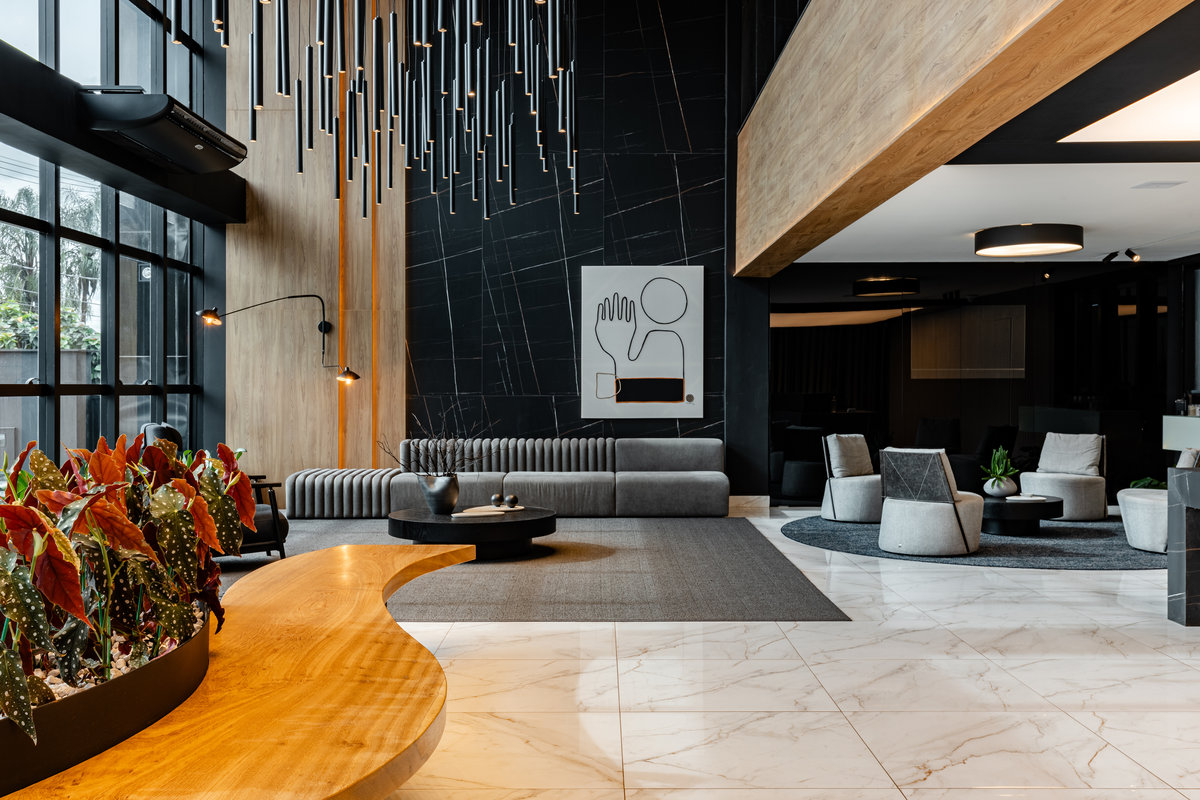 Este lobby corporativo impressiona pela imponência arquitetônica e pelo equilíbrio entre sofisticação, design contemporâneo e funcionalidade. O projeto explora ao máximo a verticalidade do pé-direito duplo, valorizada por uma instalação luminosa escultural composta por pendentes cilíndricos em diferentes alturas, que criam um efeito visual dinâmico e sofisticado.