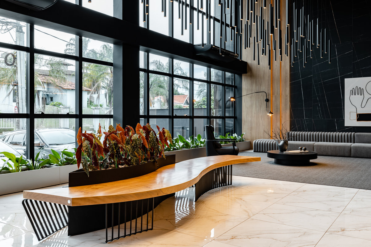O mobiliário segue a linguagem contemporânea do projeto, com peças de design assinado, como os sofás de linhas retas, poltronas elegantes e um banco central com floreiras integradas, que funciona como ponto de interesse e acolhimento no ambiente. A vegetação pontual traz frescor e suavidade, sem interferir na estética minimalista.