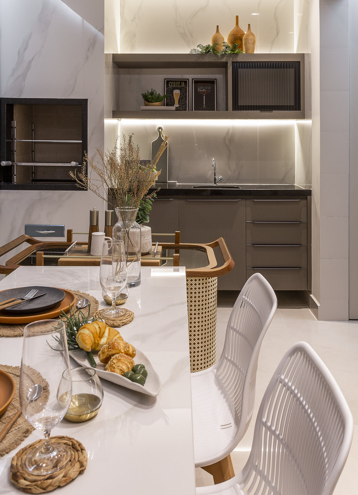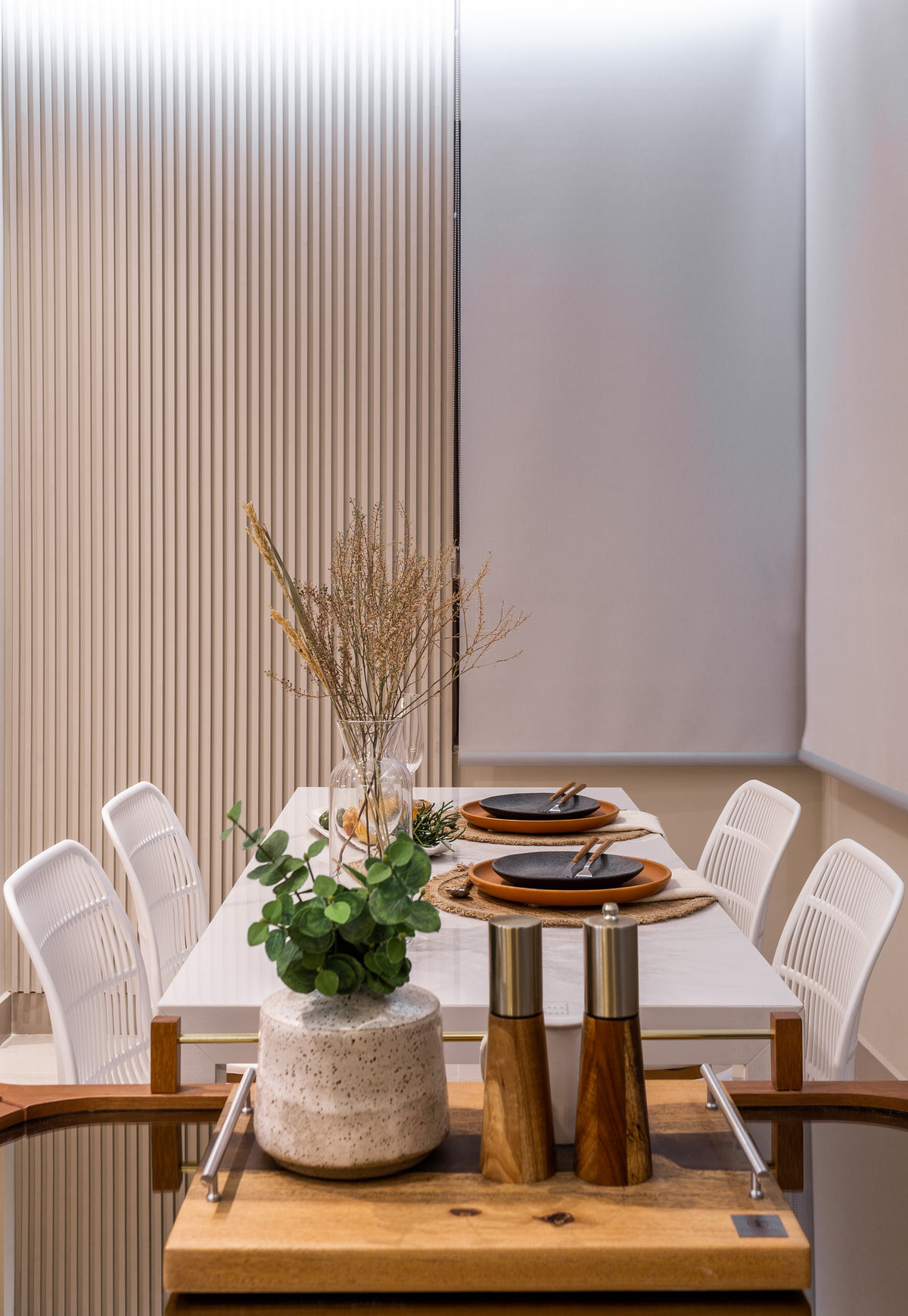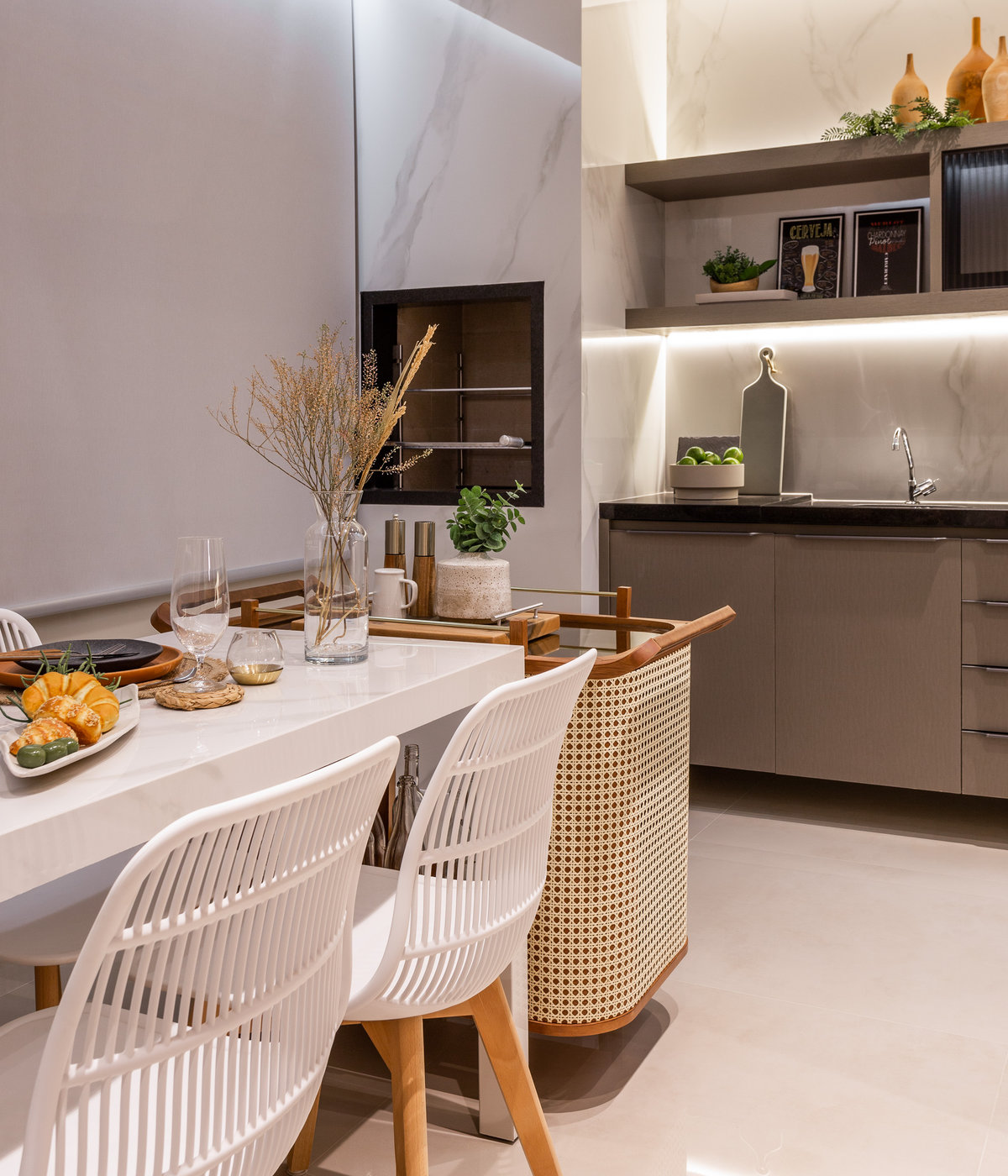 Destaque para o carrinho-bar em madeira natural com palhinha, que além de funcional, adiciona um toque retrô-chique e artesanal à composição. A mesa de jantar, com cadeiras brancas de design leve, harmoniza perfeitamente com o estilo clean do ambiente, enquanto os elementos decorativos — como vasos, sousplats e utensílios em tons terrosos — conferem personalidade e calor.