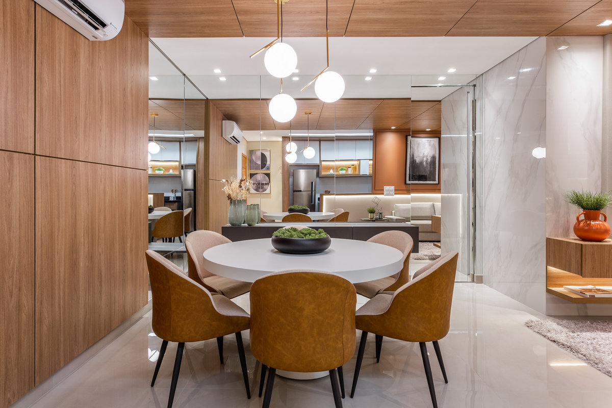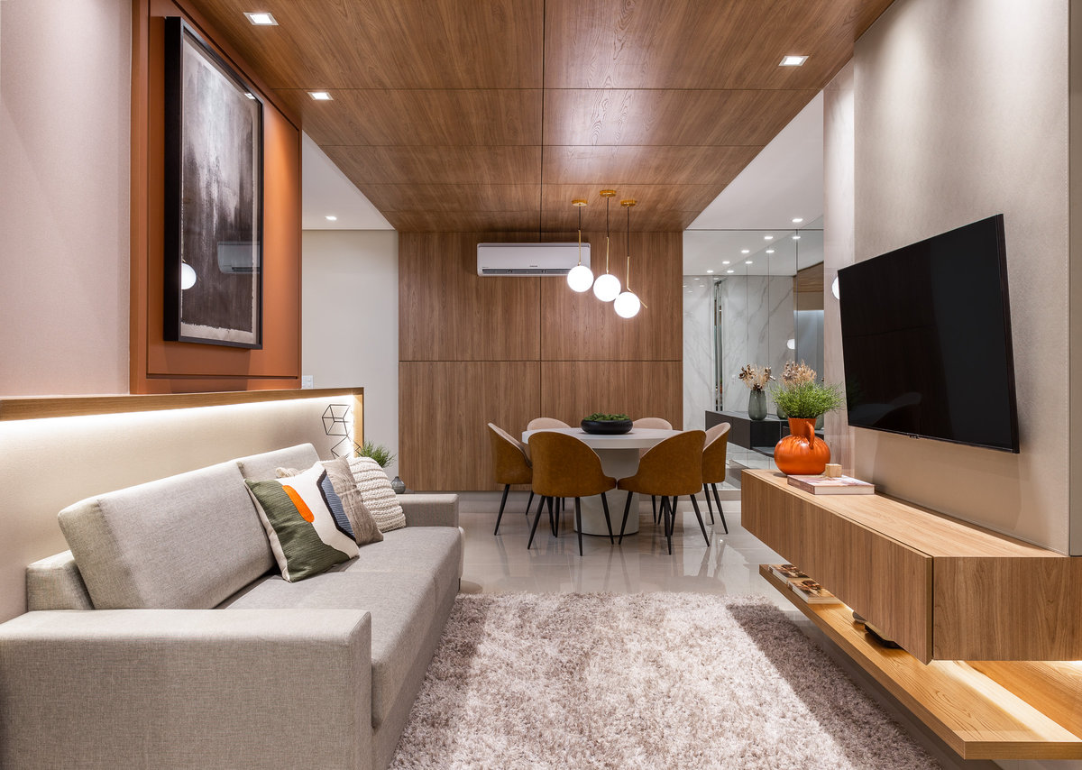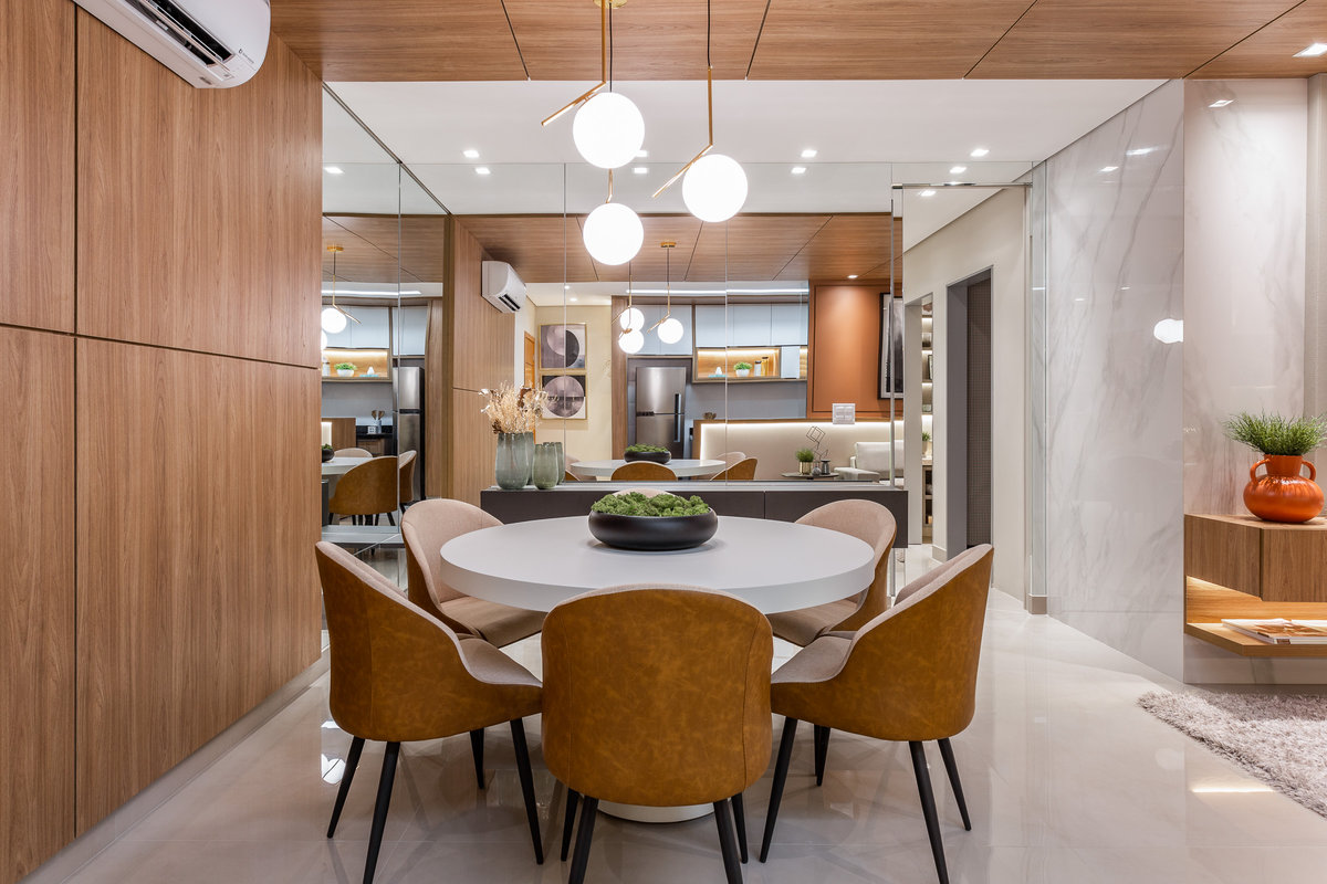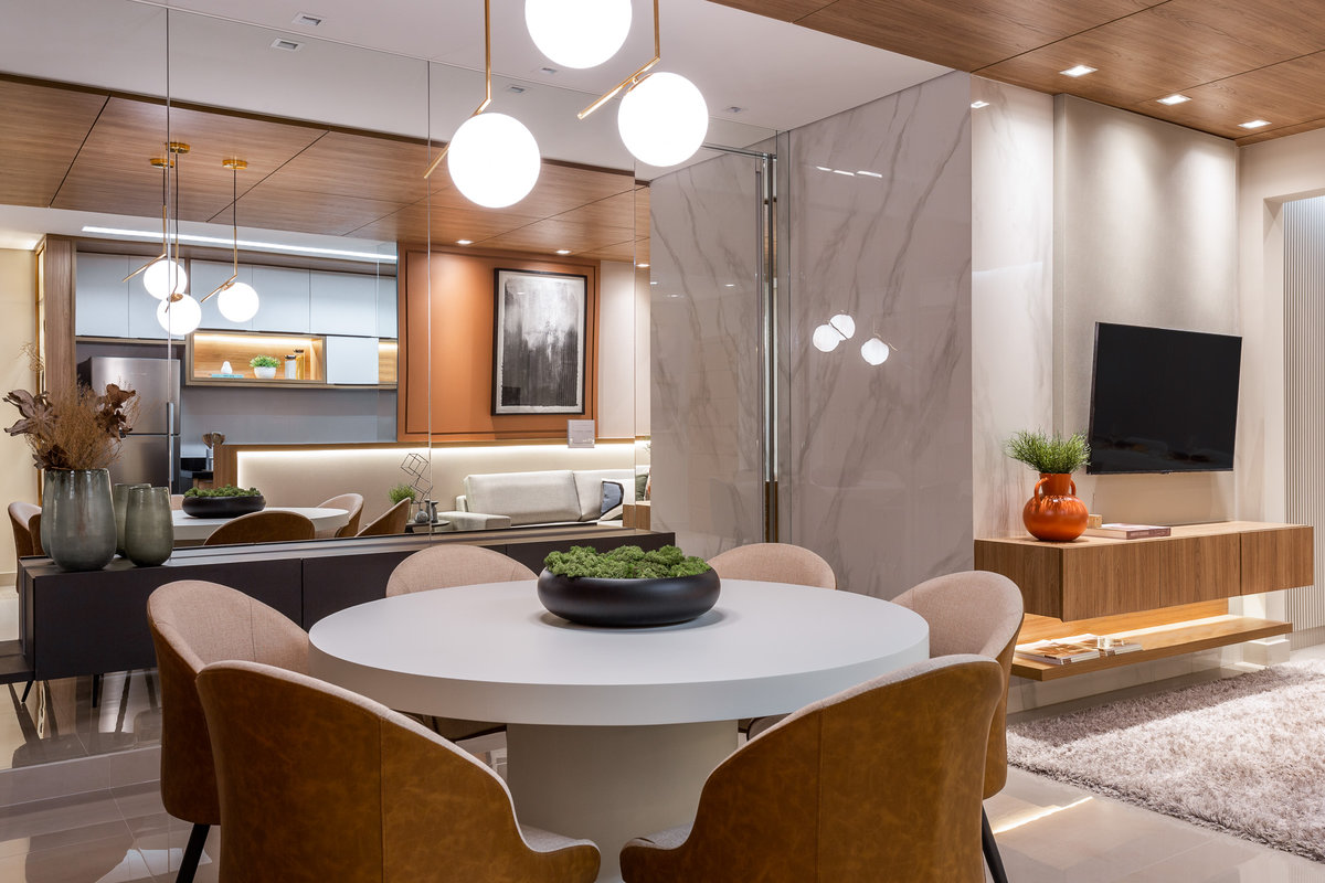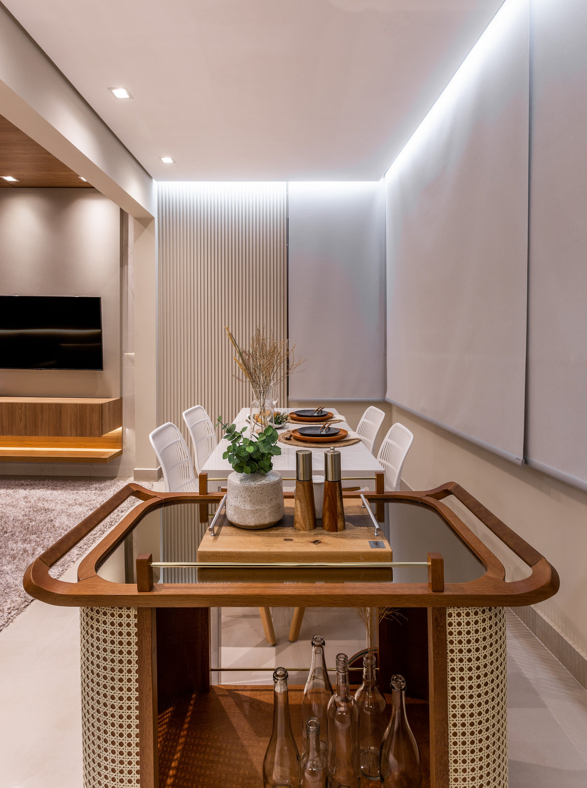 O layout integrado entre estar e jantar valoriza a amplitude do espaço, enquanto o mobiliário de linhas retas e acabamento em madeira clara reforça a sensação de leveza e conforto. A iluminação indireta em LED embutida no forro e nas cortinas cria uma atmosfera suave e sofisticada, ideal para momentos de convívio.