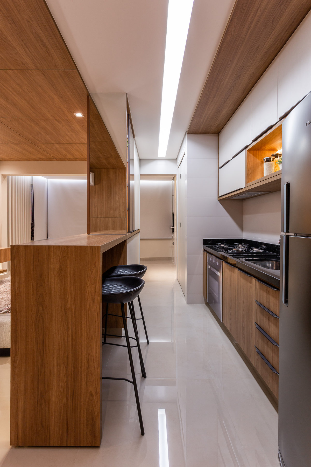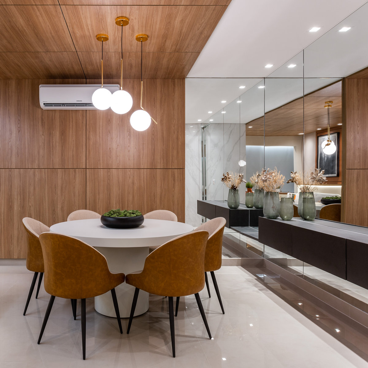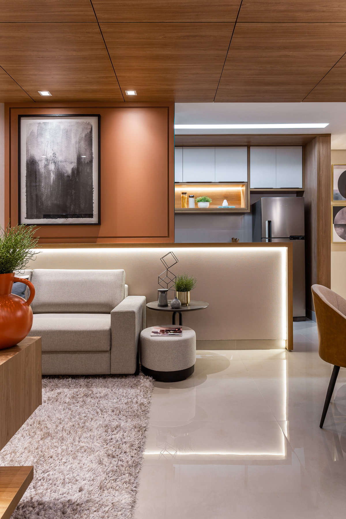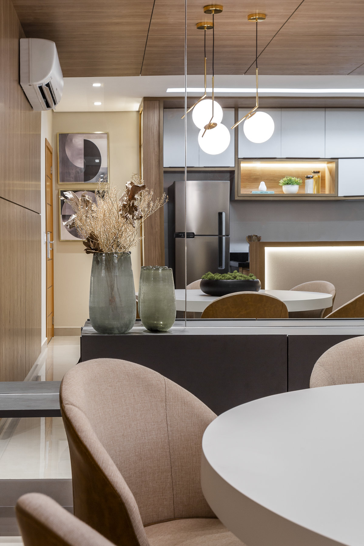 Painéis ripados, cortinas embutidas e o uso inteligente da marcenaria reforçam o cuidado com cada detalhe, compondo um espaço elegante, prático e visualmente aconchegante — reflexo do olhar sensível e sofisticado de Sandra Oliveira.