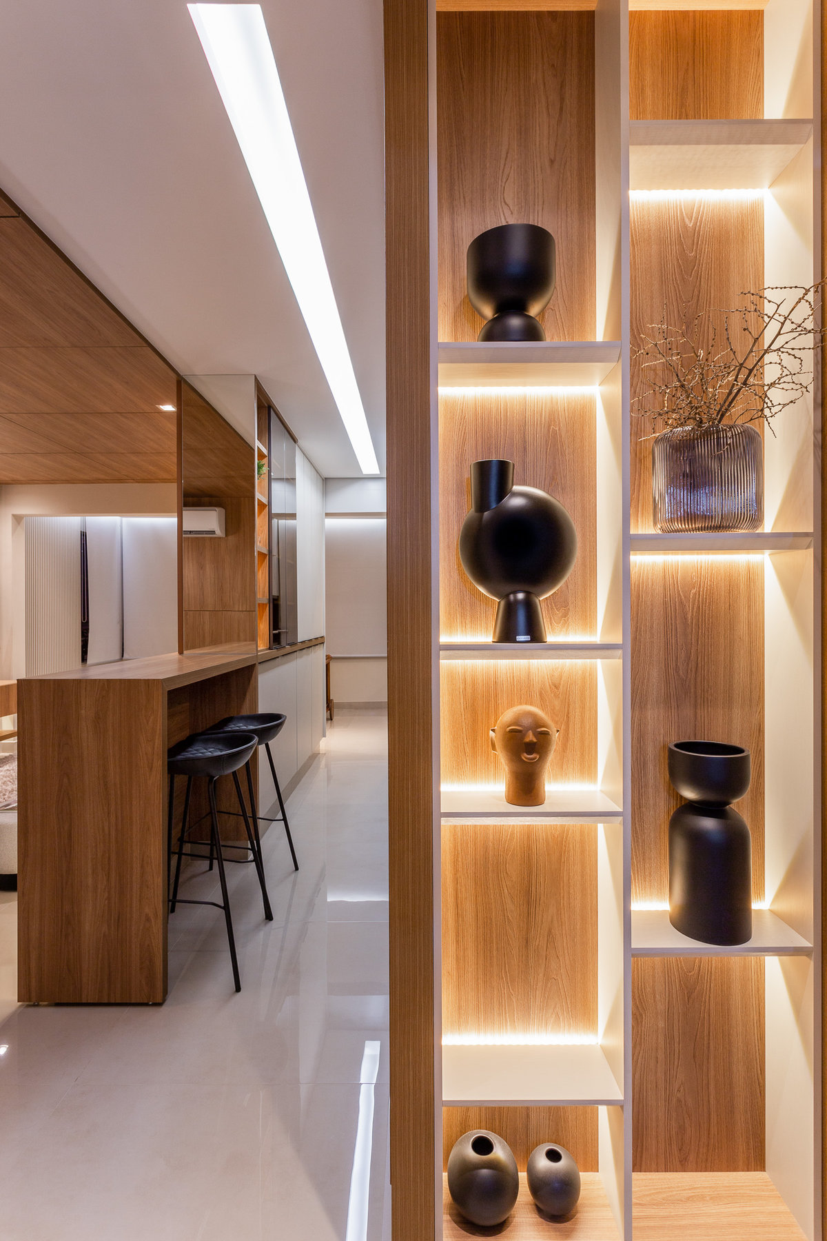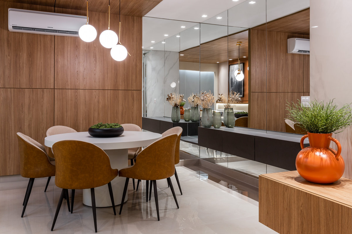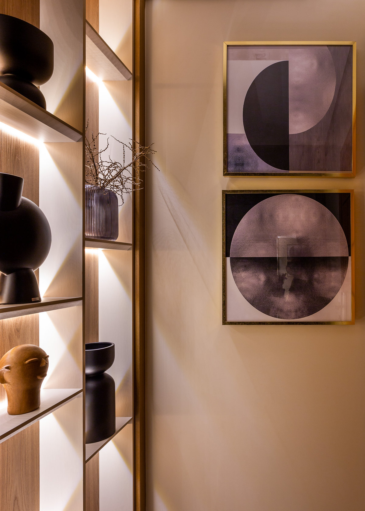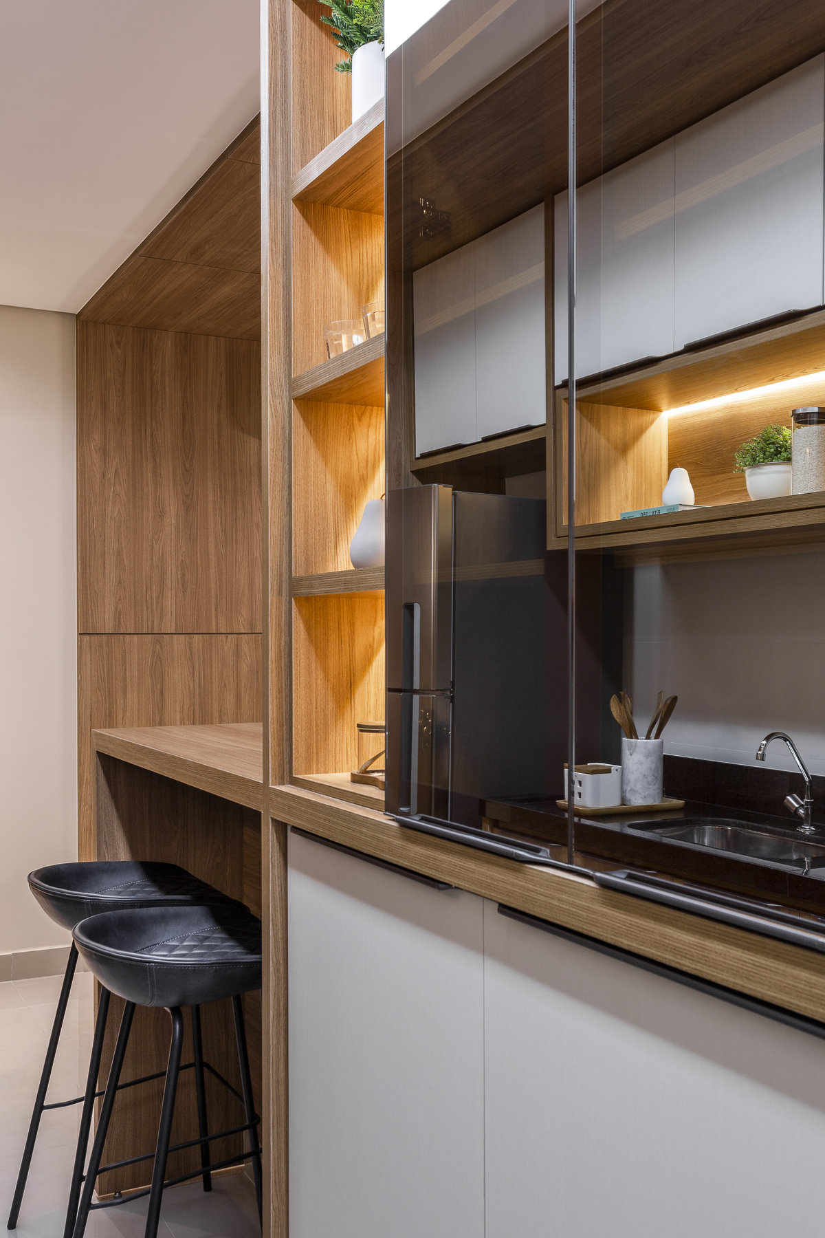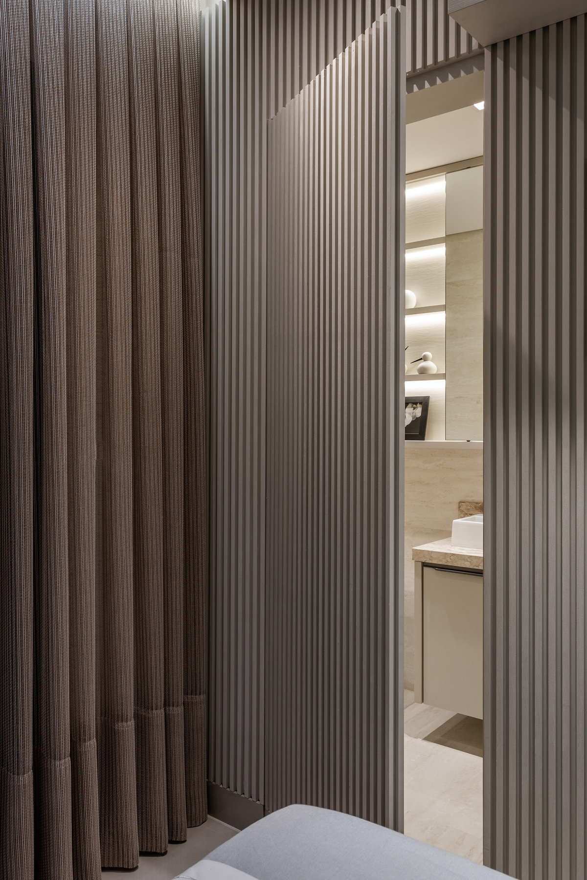 Painéis ripados, cortinas embutidas e o uso inteligente da marcenaria reforçam o cuidado com cada detalhe, compondo um espaço elegante, prático e visualmente aconchegante — reflexo do olhar sensível e sofisticado de Sandra Oliveira.