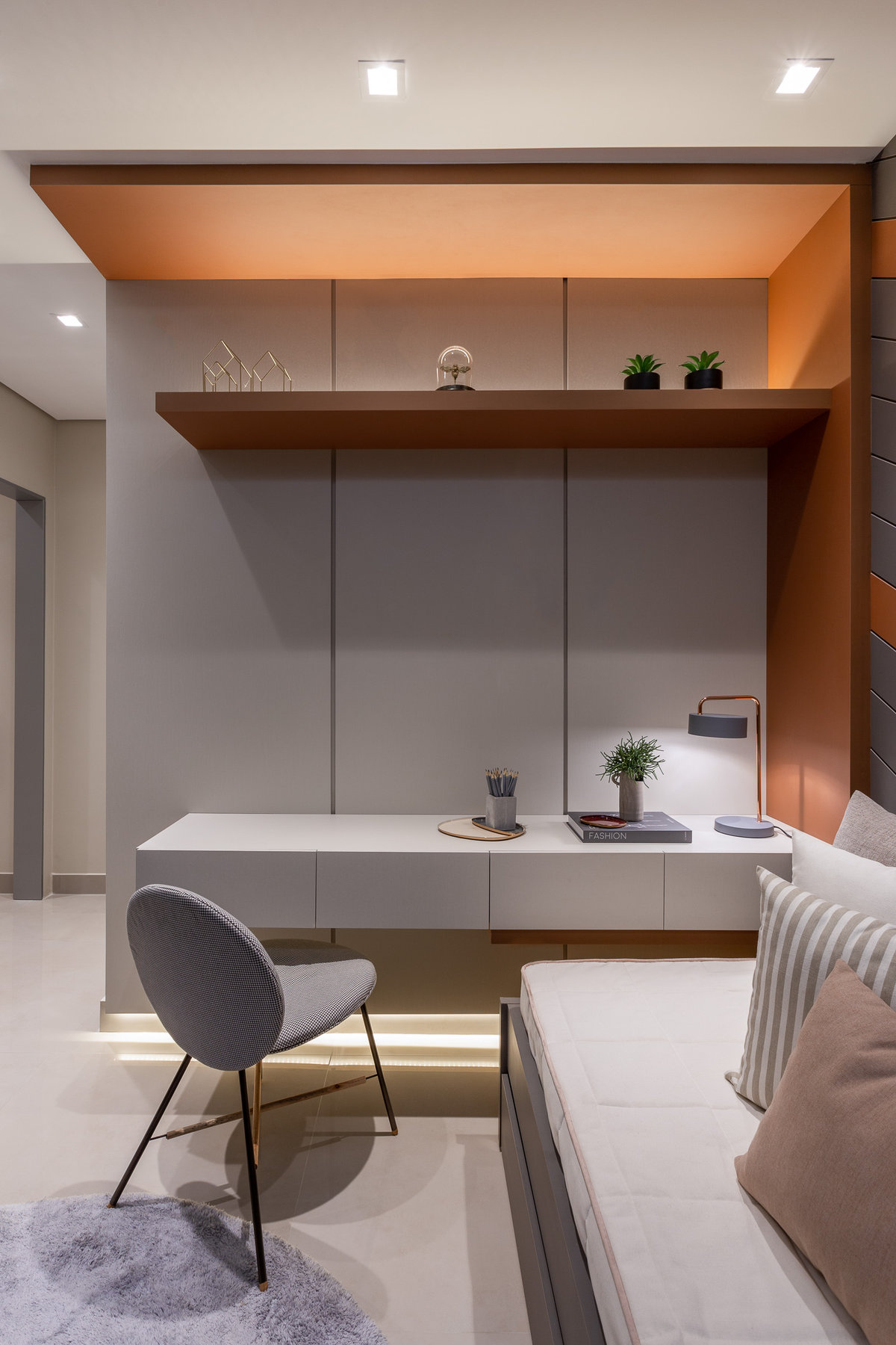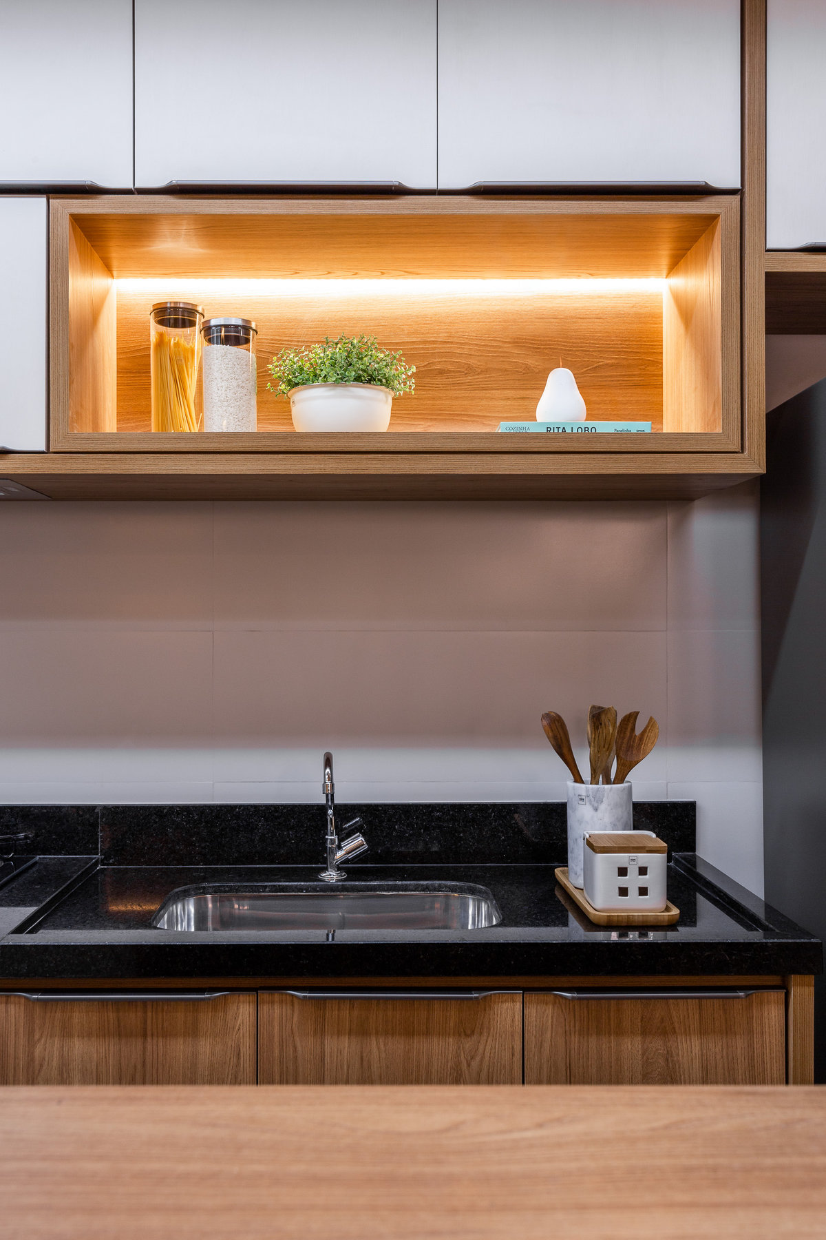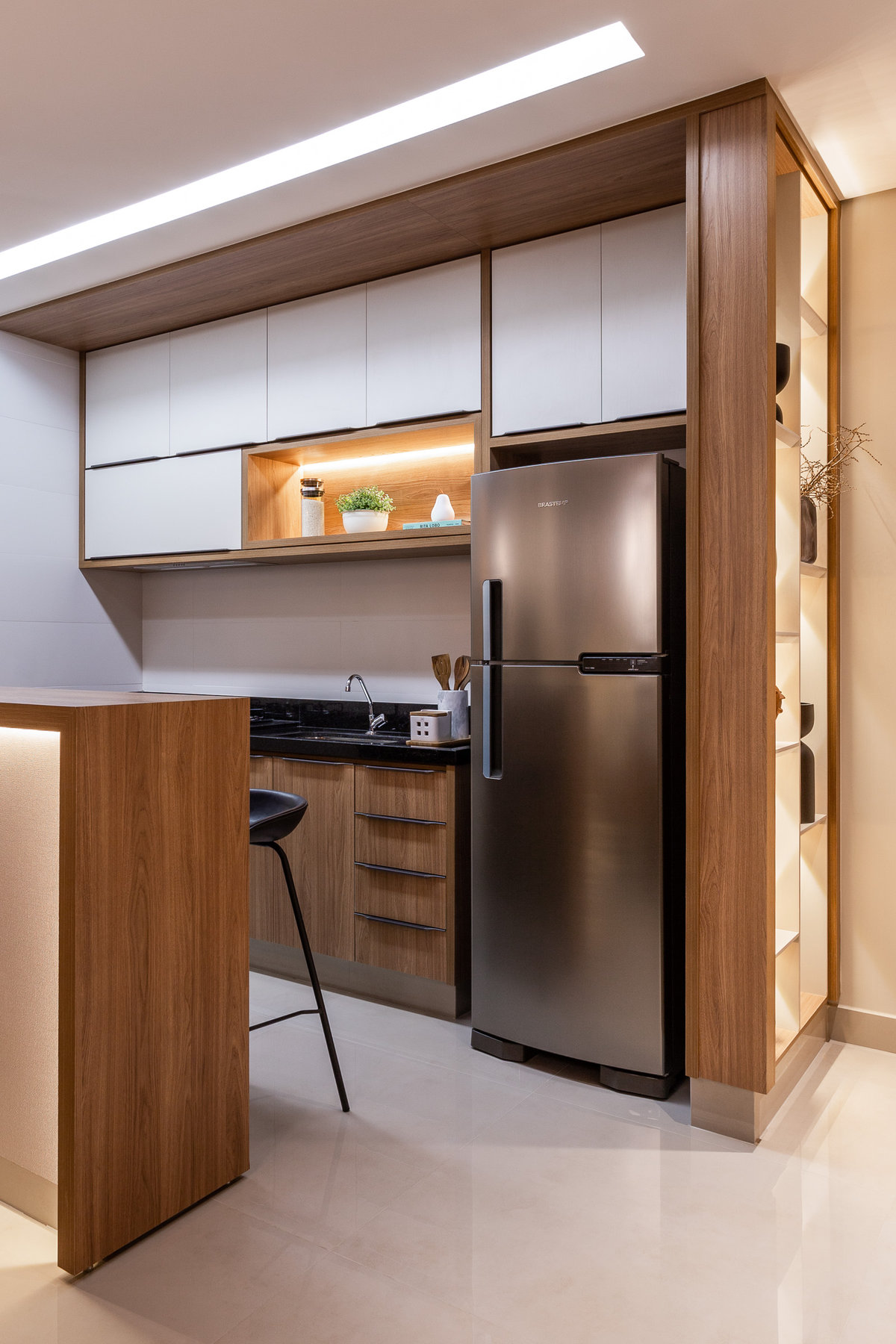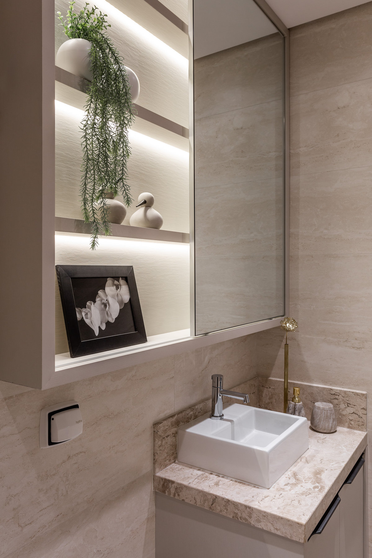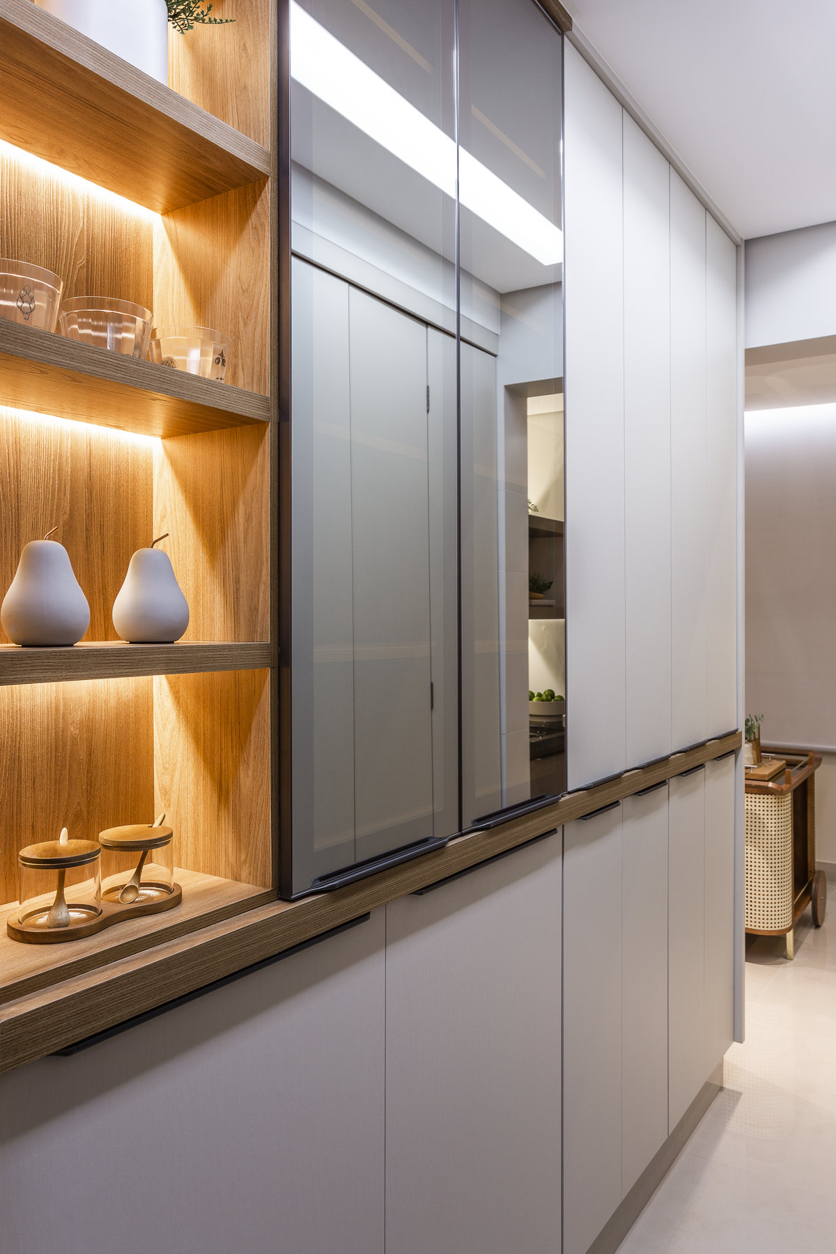 Painéis ripados, cortinas embutidas e o uso inteligente da marcenaria reforçam o cuidado com cada detalhe, compondo um espaço elegante, prático e visualmente aconchegante — reflexo do olhar sensível e sofisticado de Sandra Oliveira.