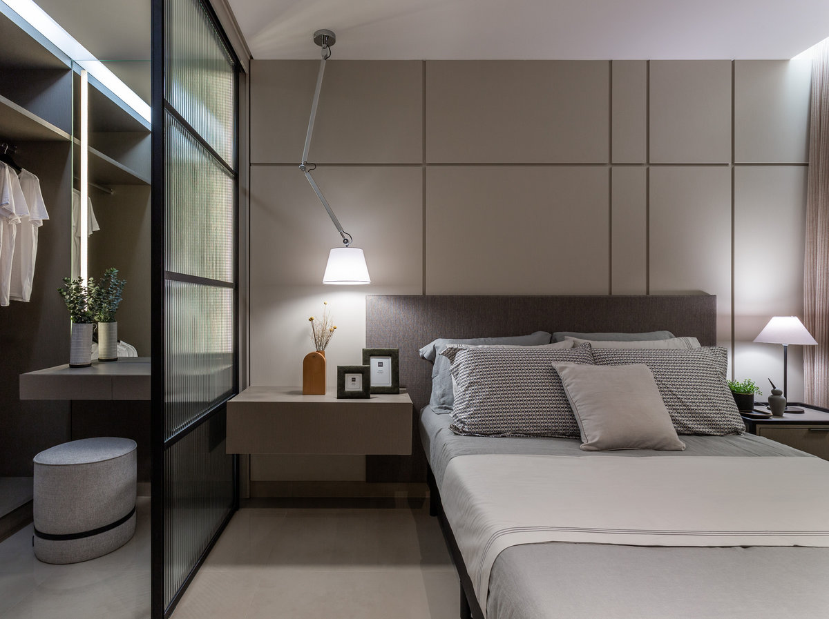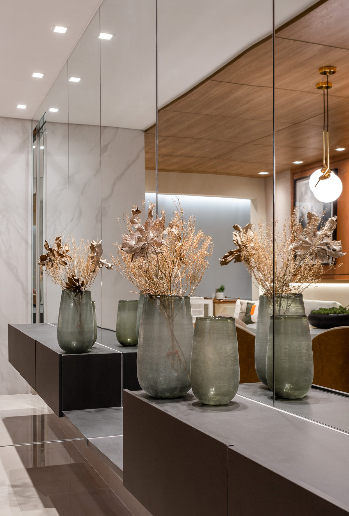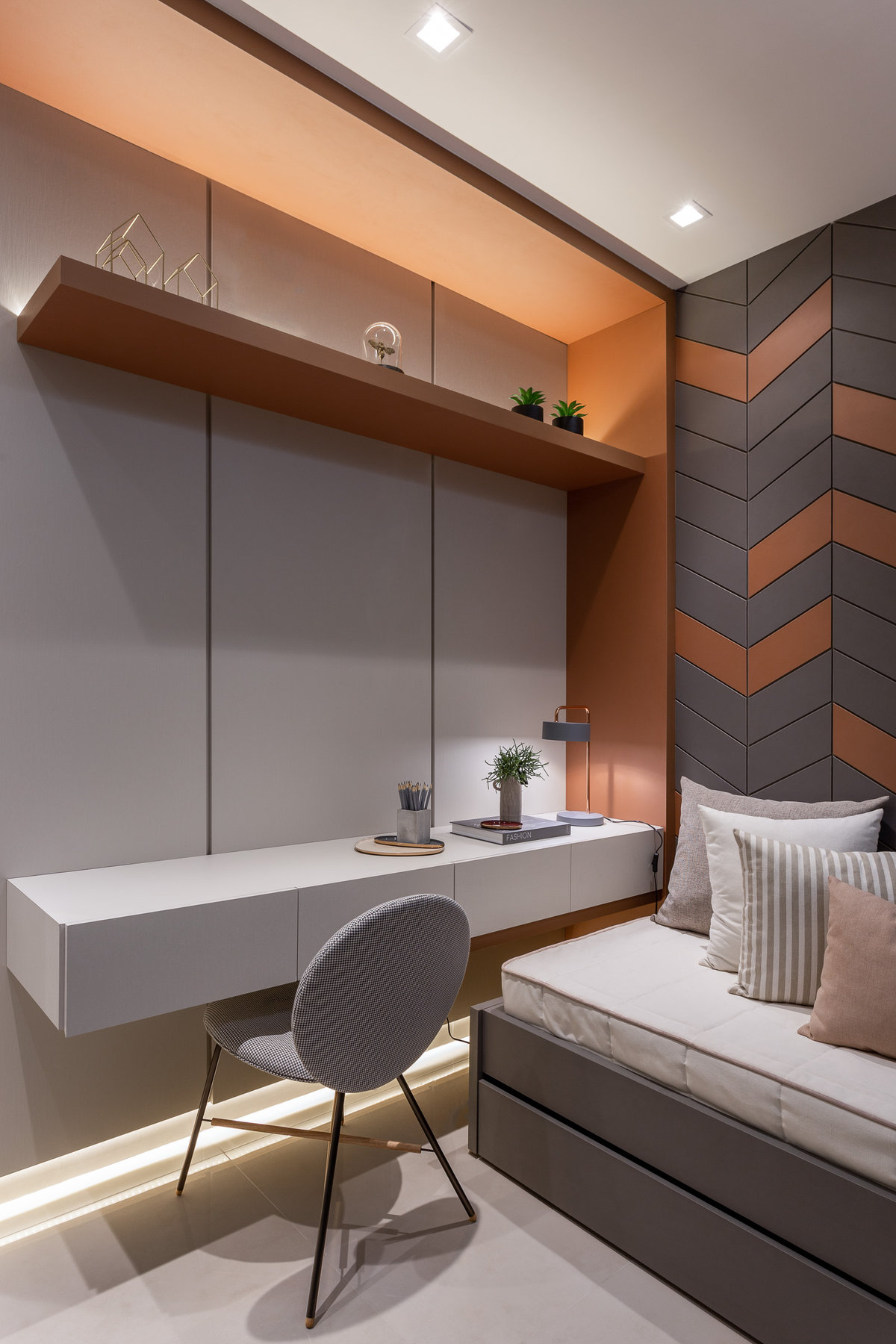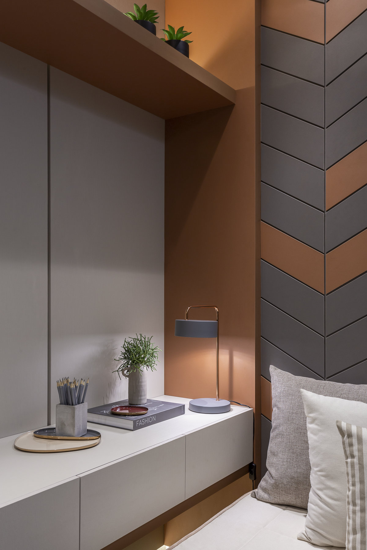 Painéis ripados, cortinas embutidas e o uso inteligente da marcenaria reforçam o cuidado com cada detalhe, compondo um espaço elegante, prático e visualmente aconchegante — reflexo do olhar sensível e sofisticado de Sandra Oliveira.