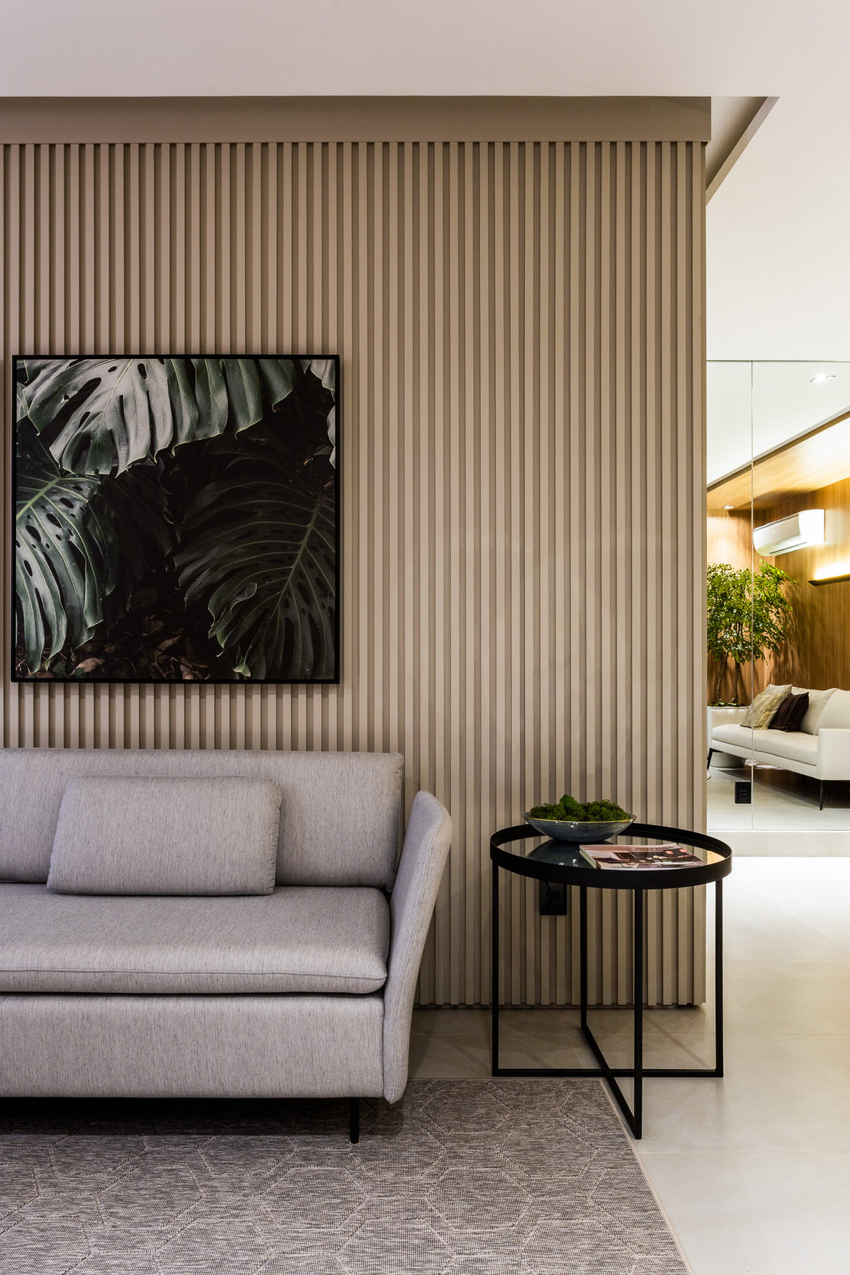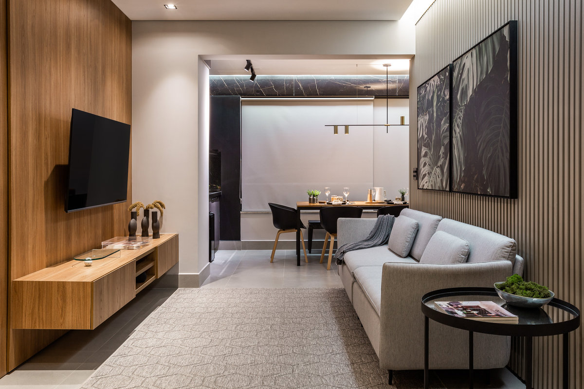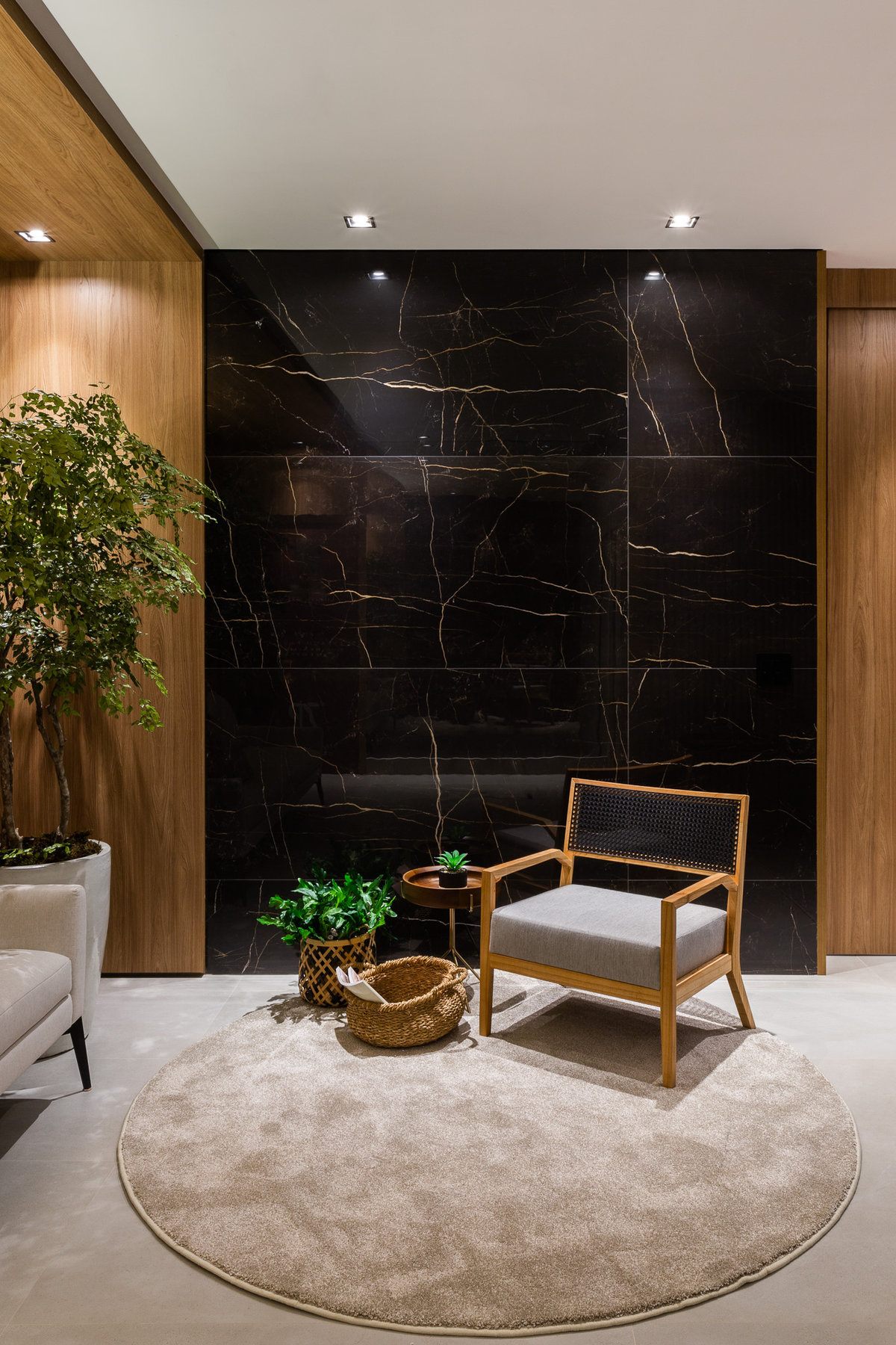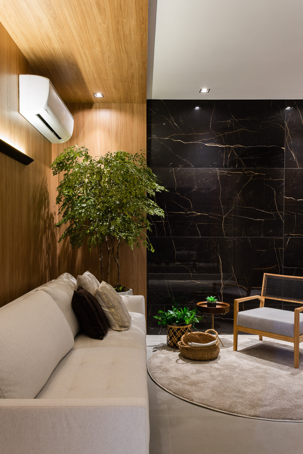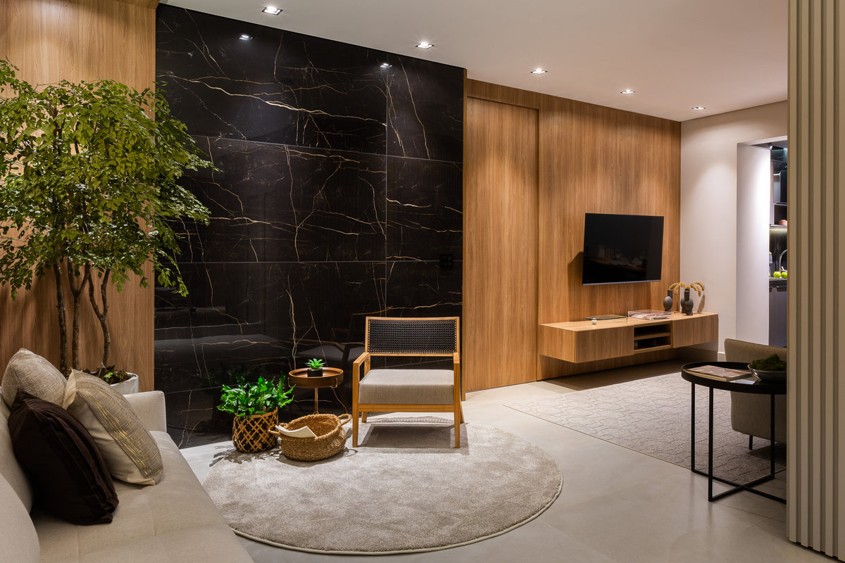 No Grand Living II, a ZP Arquitetura reafirma sua assinatura contemporânea com um projeto que valoriza conforto, textura e integração. A parede de mármore preto com veios dourados traz sofisticação imediata ao ambiente, contrastando com a madeira clara que reveste o restante do espaço, criando uma composição harmônica e acolhedora.
