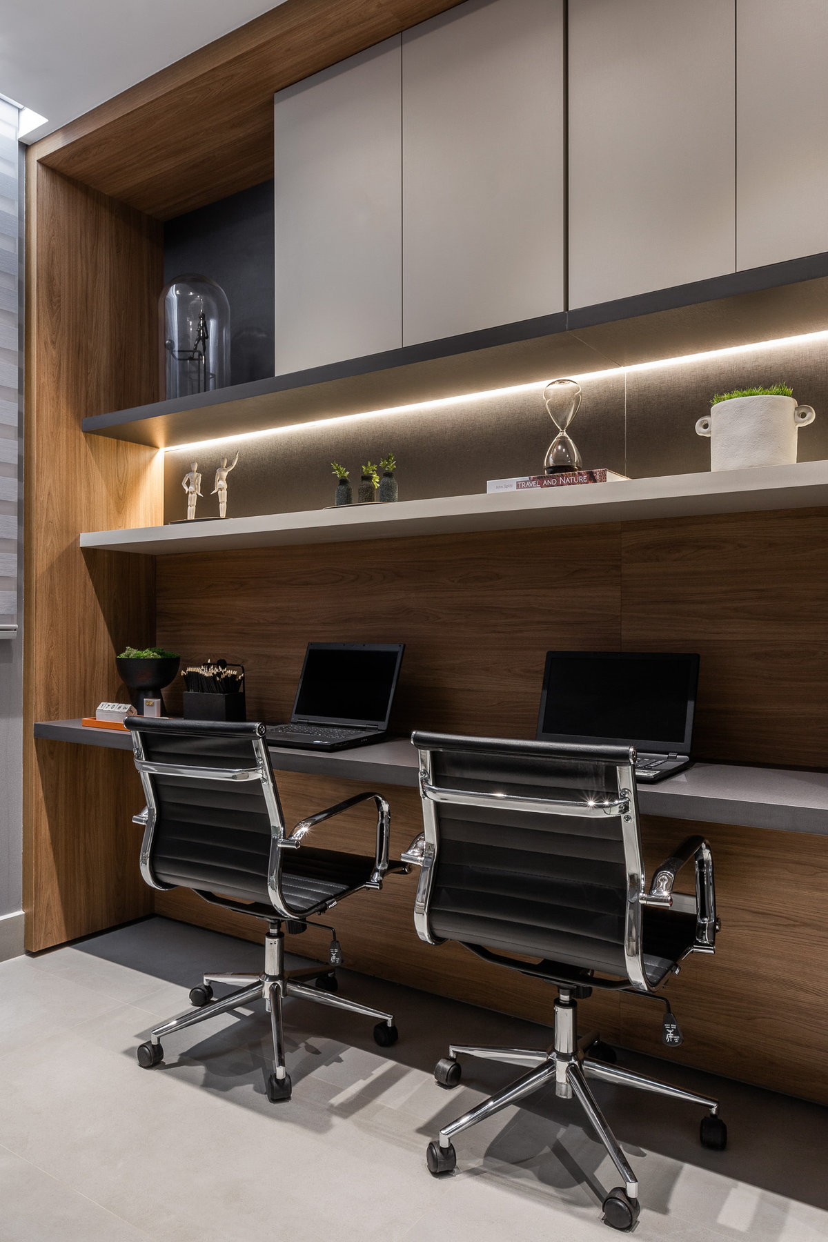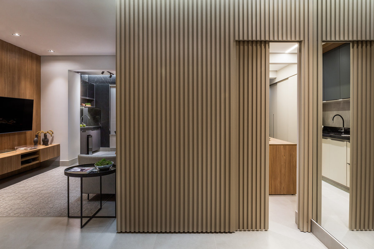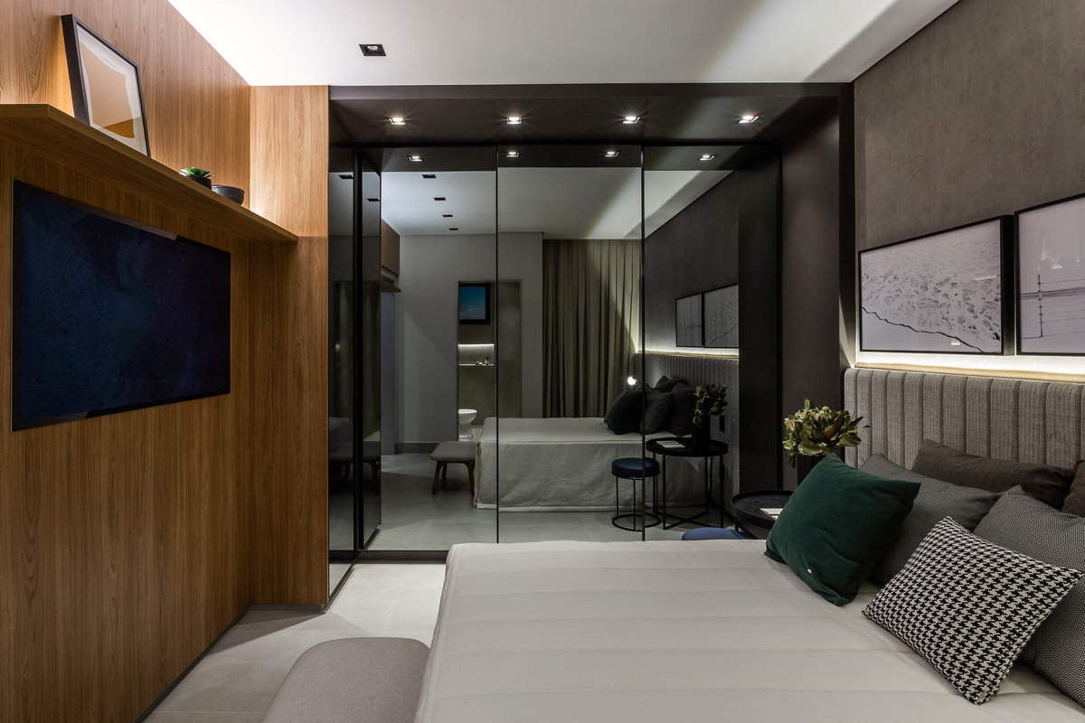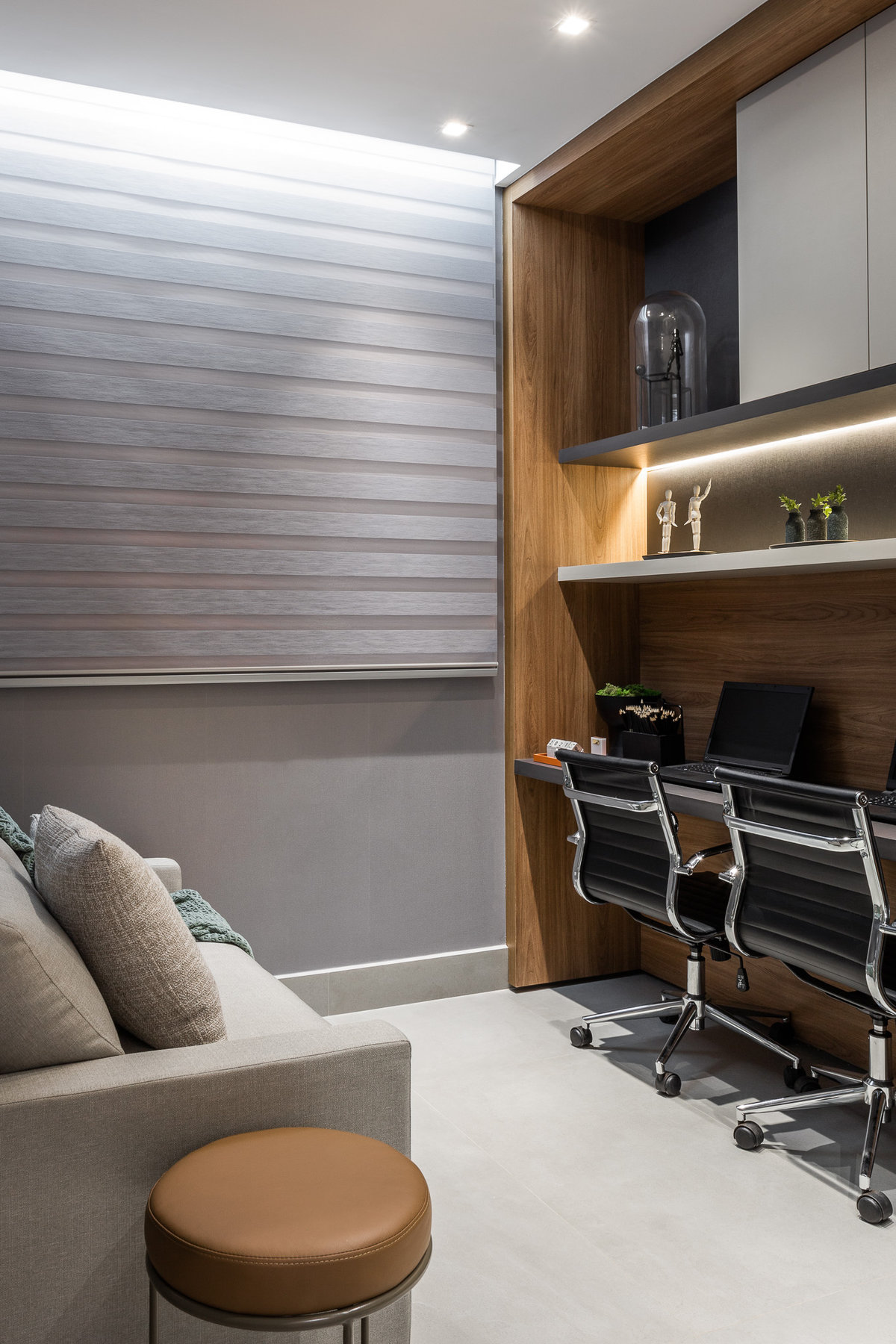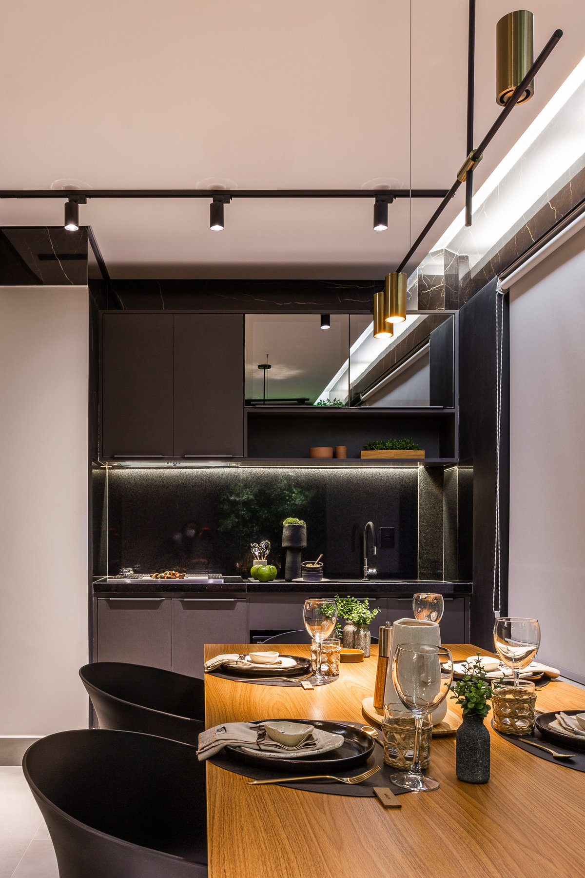 No Grand Living II, a ZP Arquitetura reafirma sua assinatura contemporânea com um projeto que valoriza conforto, textura e integração. A parede de mármore preto com veios dourados traz sofisticação imediata ao ambiente, contrastando com a madeira clara que reveste o restante do espaço, criando uma composição harmônica e acolhedora.