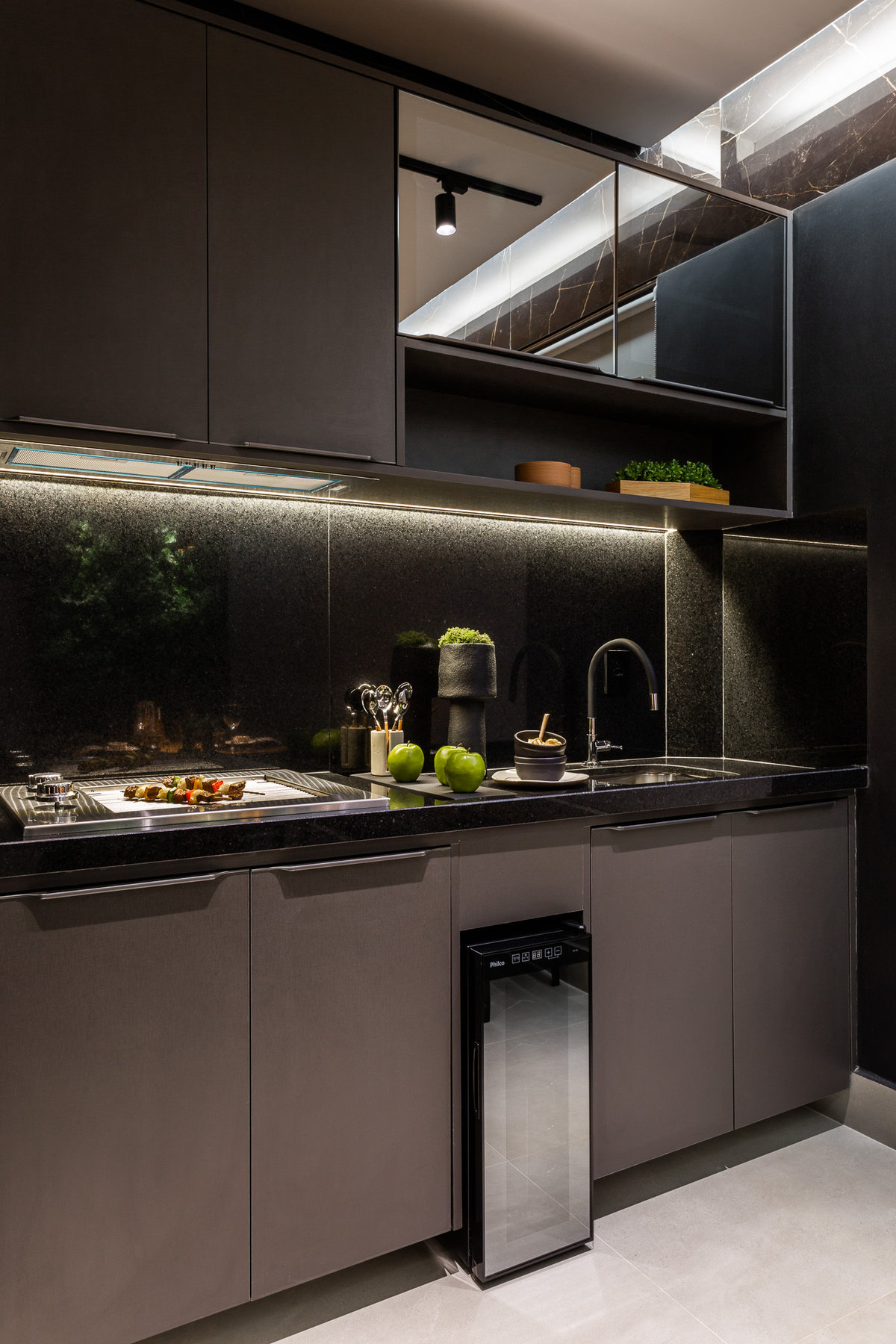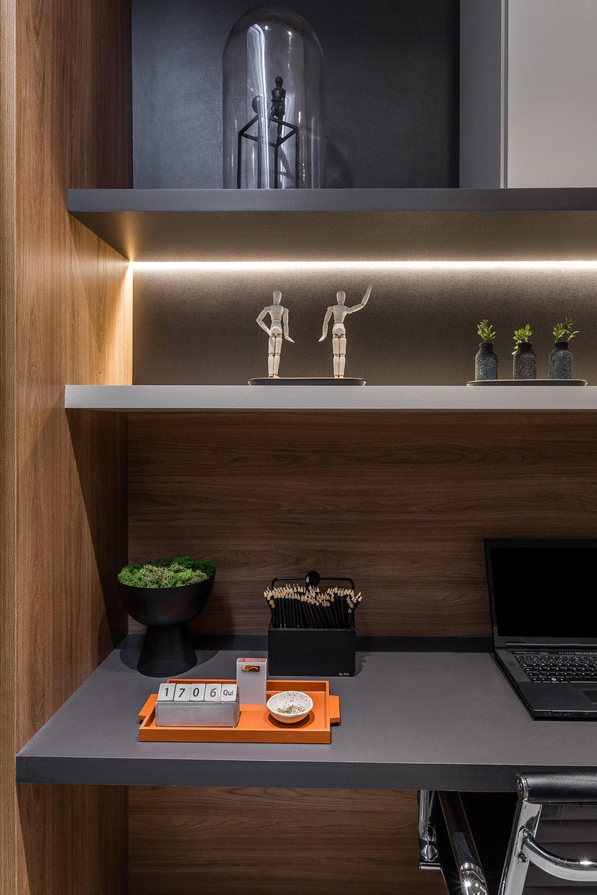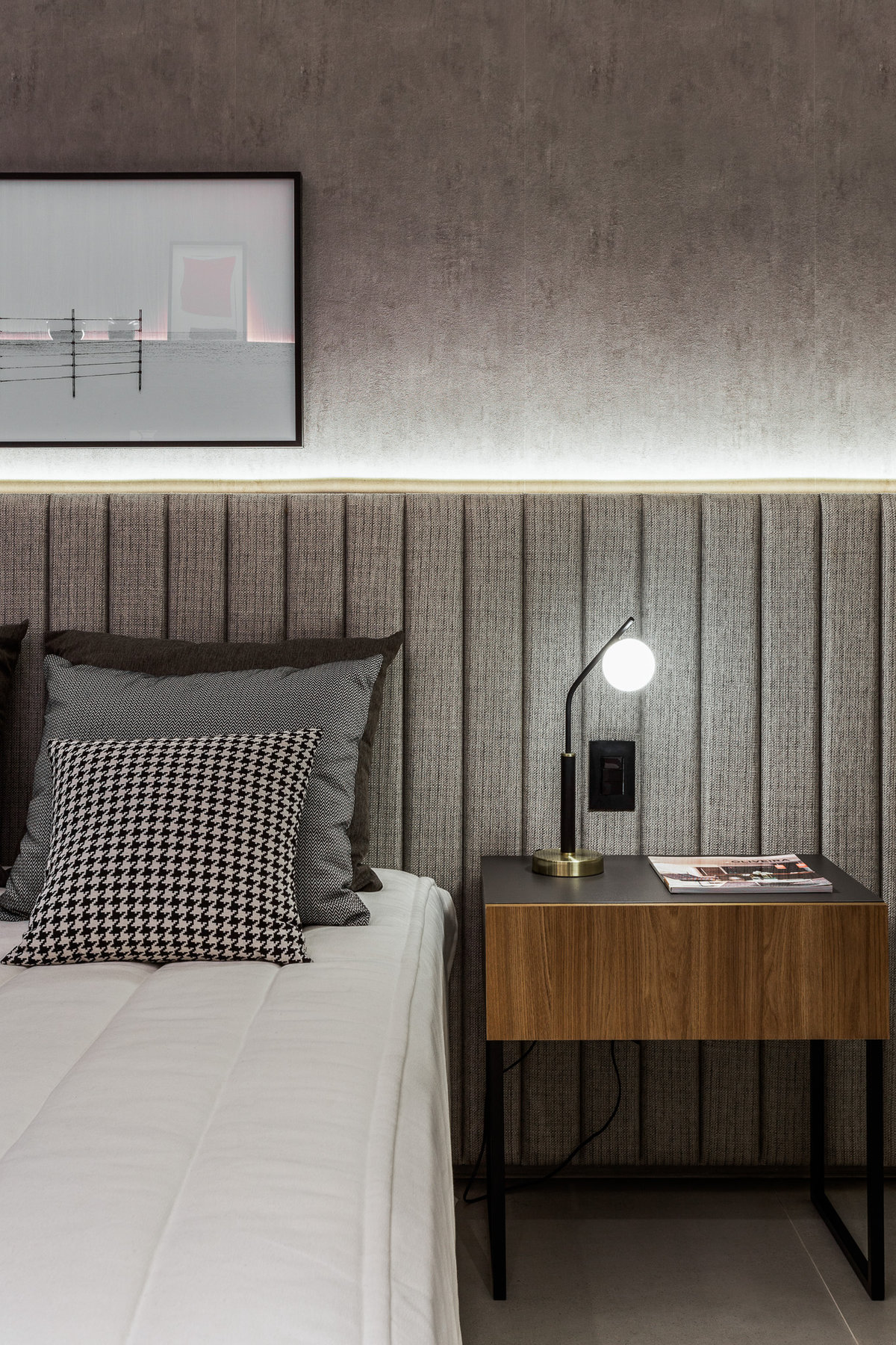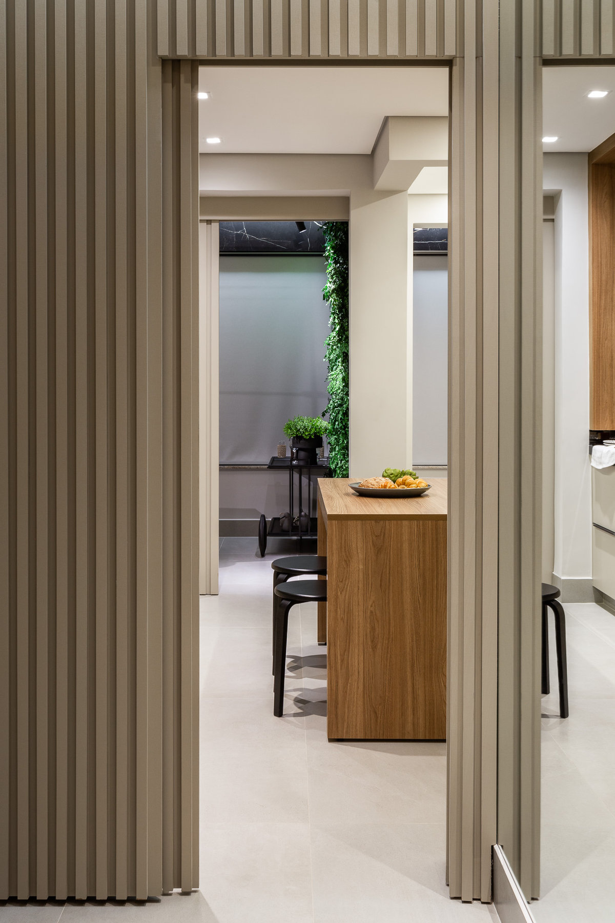 No Grand Living II, a ZP Arquitetura reafirma sua assinatura contemporânea com um projeto que valoriza conforto, textura e integração. A parede de mármore preto com veios dourados traz sofisticação imediata ao ambiente, contrastando com a madeira clara que reveste o restante do espaço, criando uma composição harmônica e acolhedora.