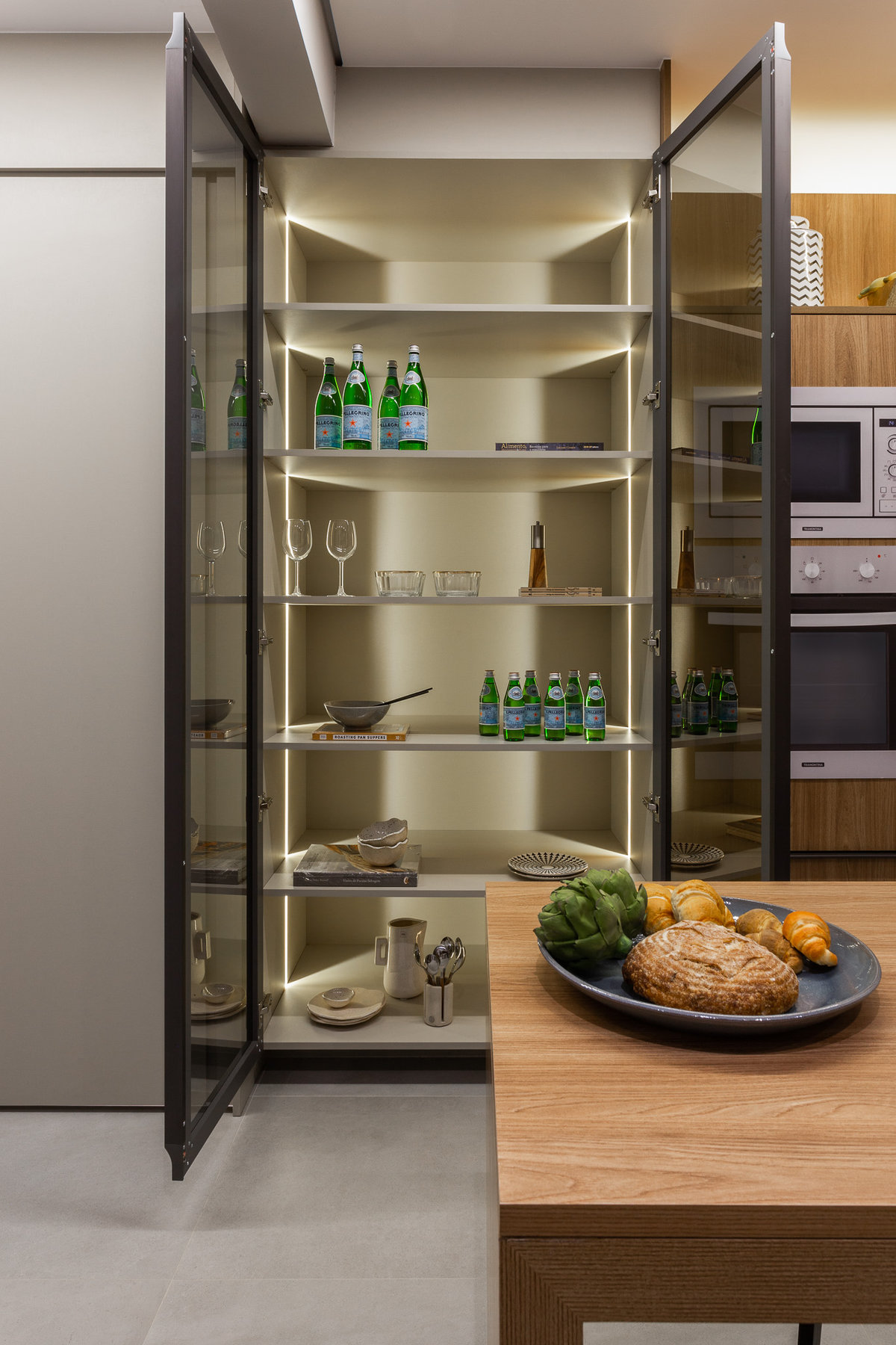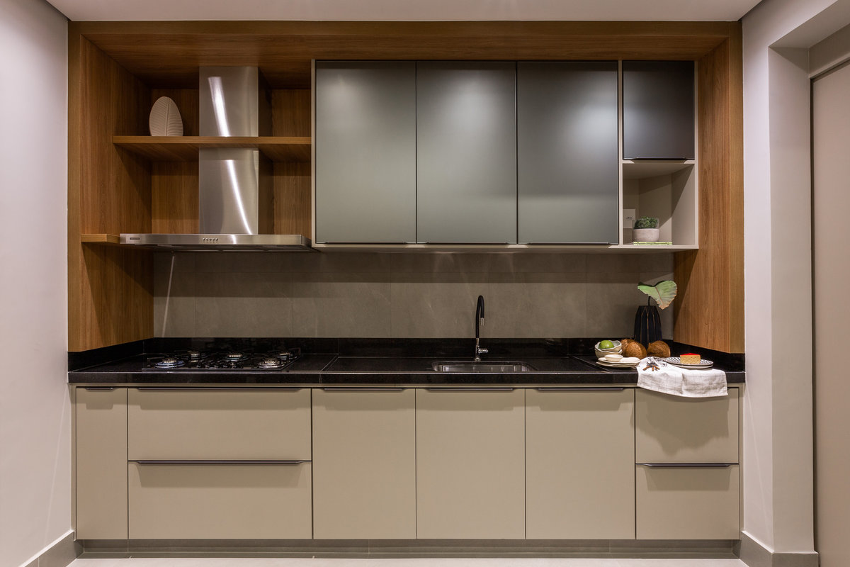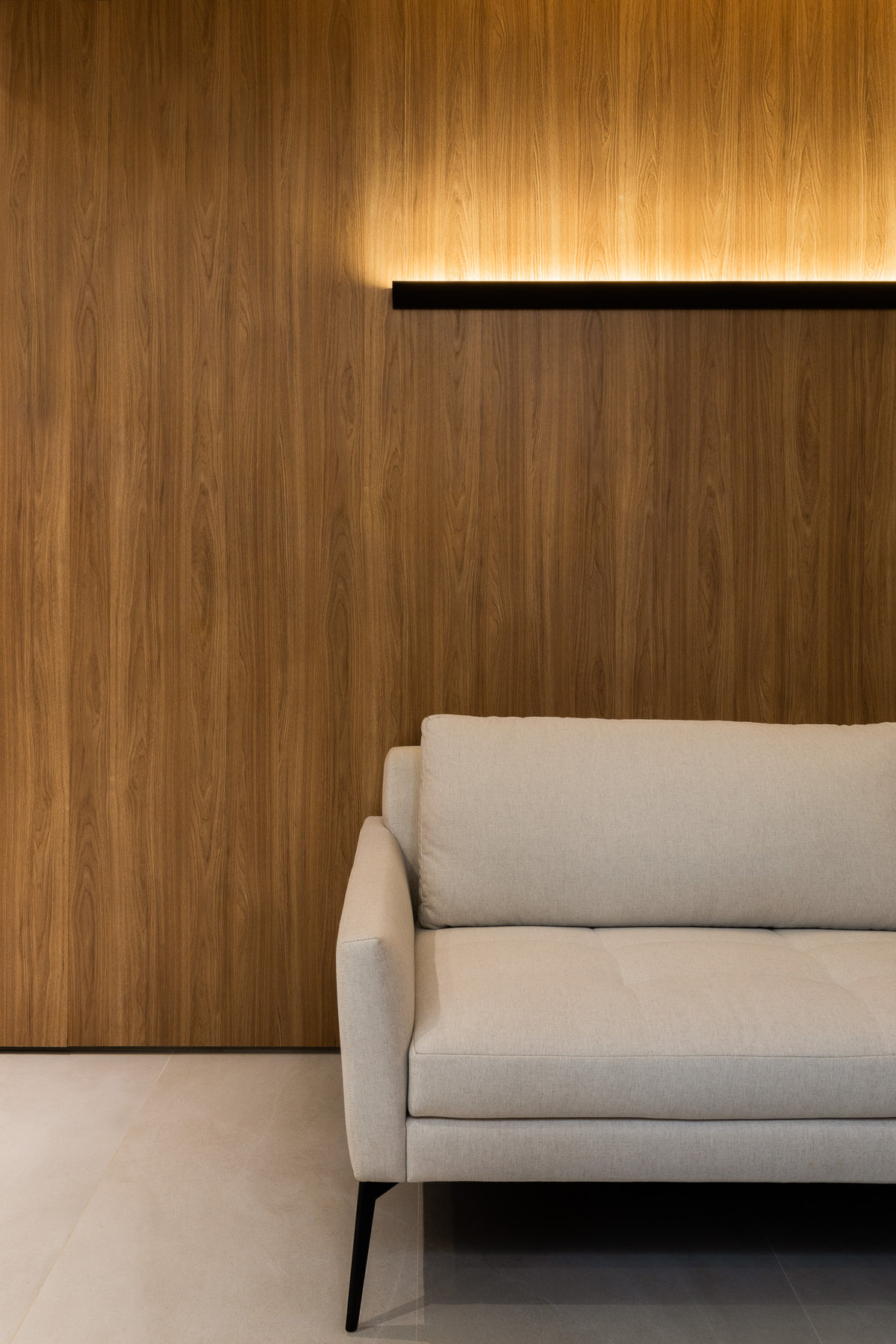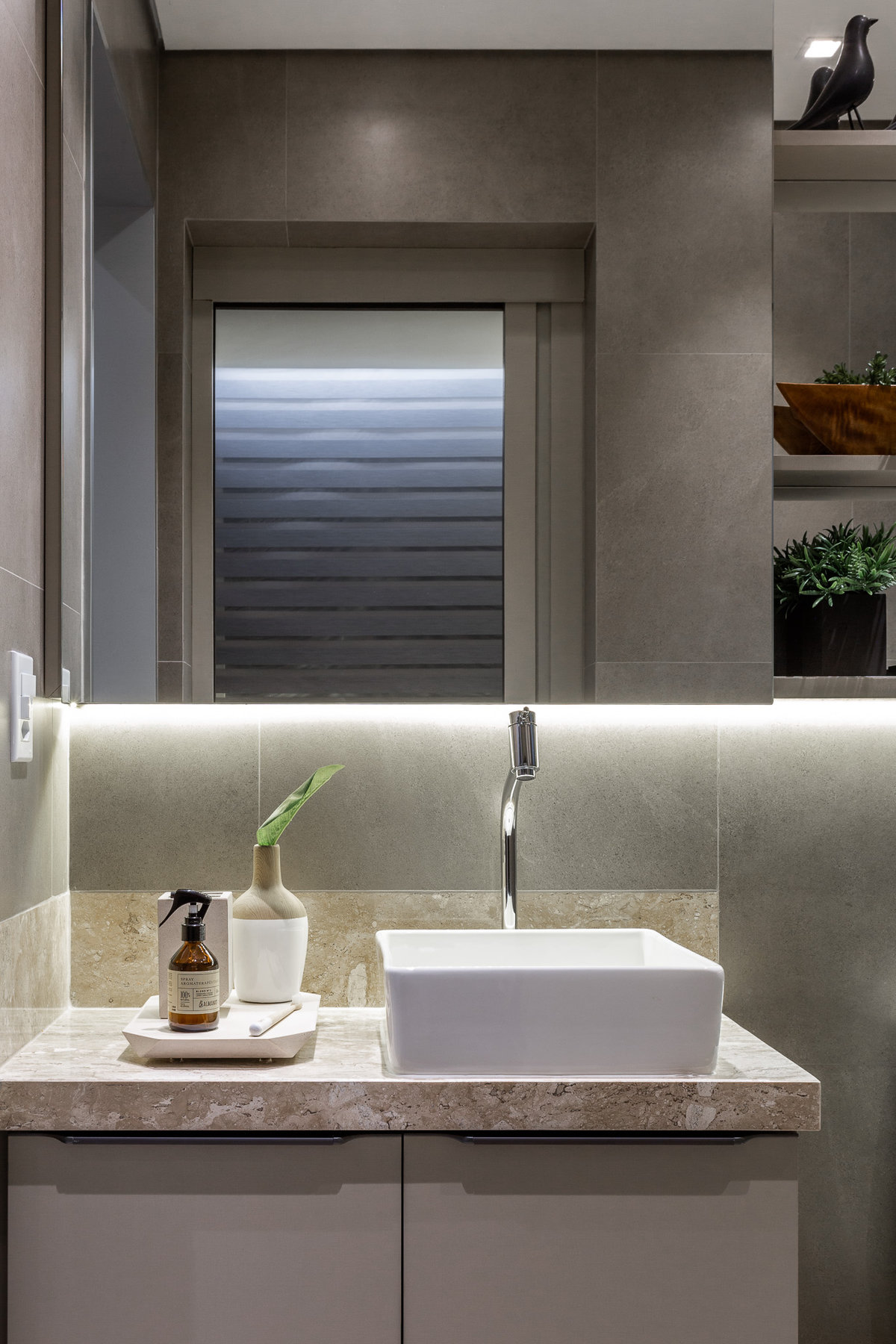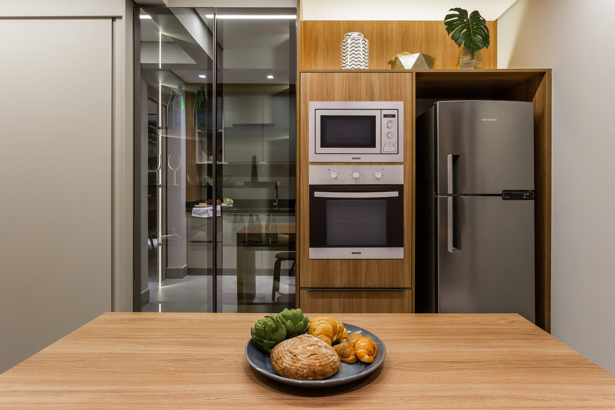 No Grand Living II, a ZP Arquitetura reafirma sua assinatura contemporânea com um projeto que valoriza conforto, textura e integração. A parede de mármore preto com veios dourados traz sofisticação imediata ao ambiente, contrastando com a madeira clara que reveste o restante do espaço, criando uma composição harmônica e acolhedora.