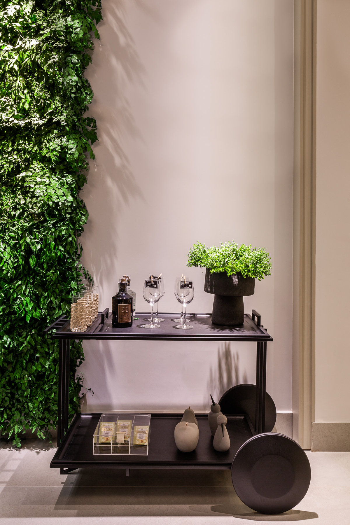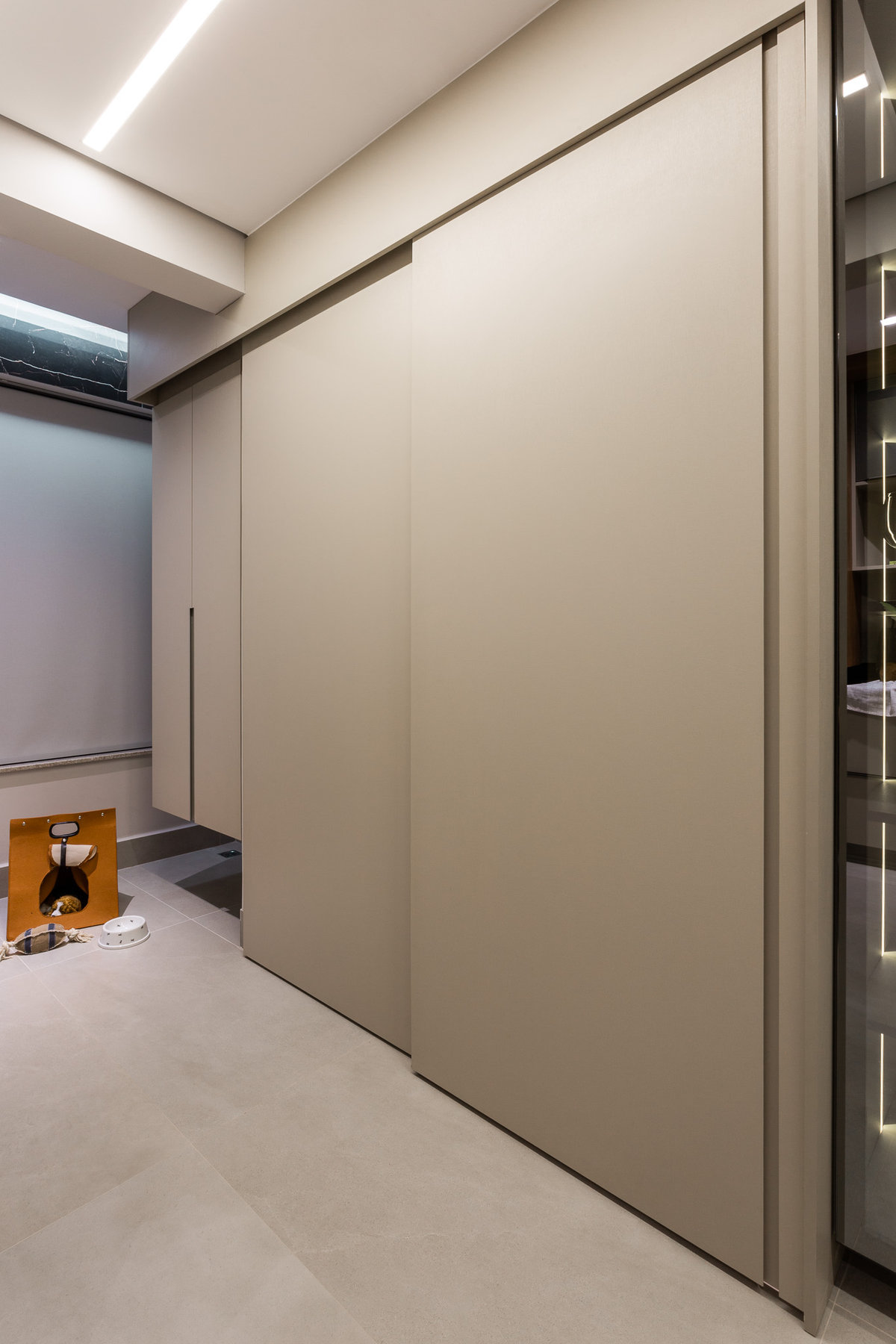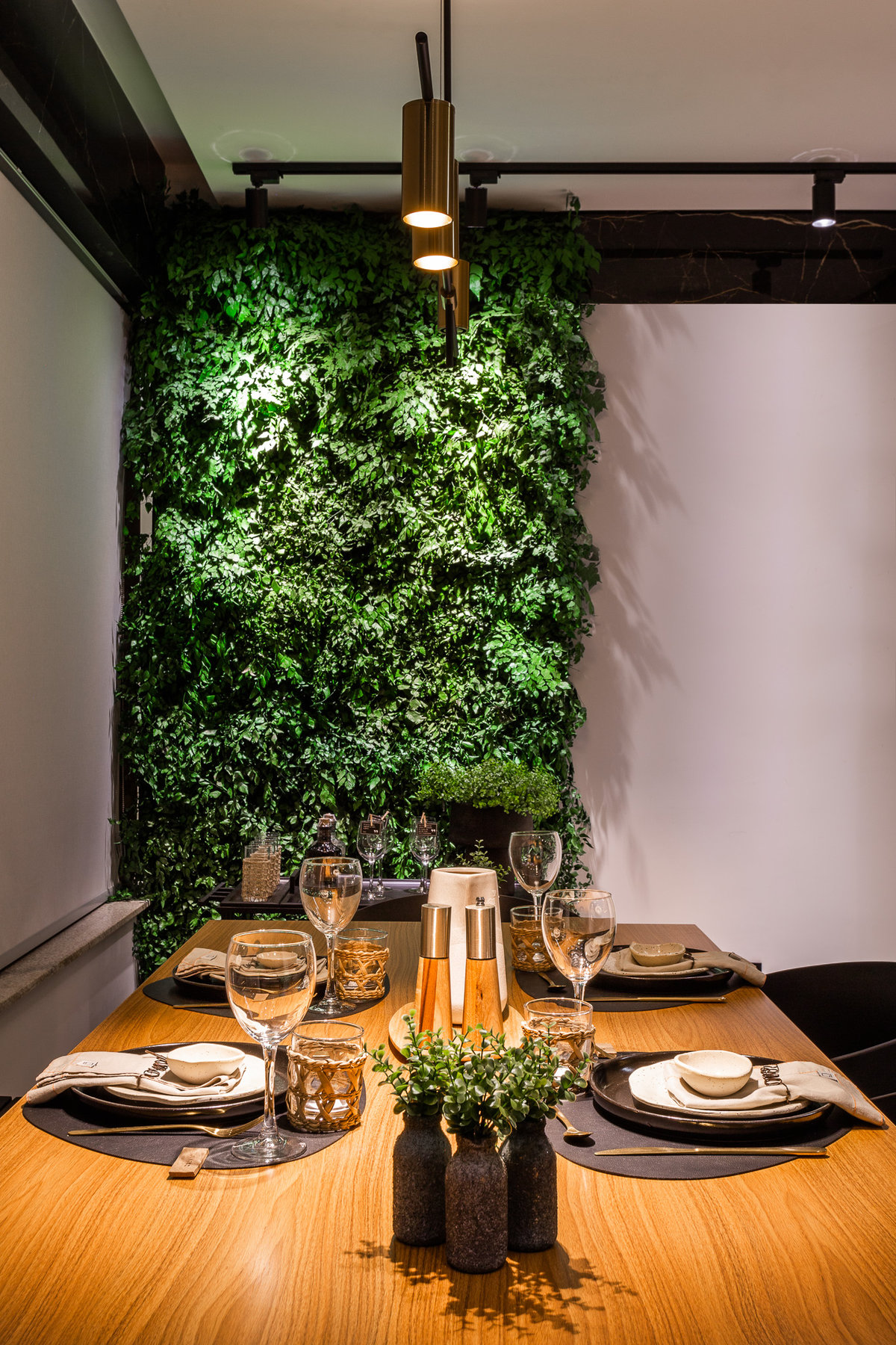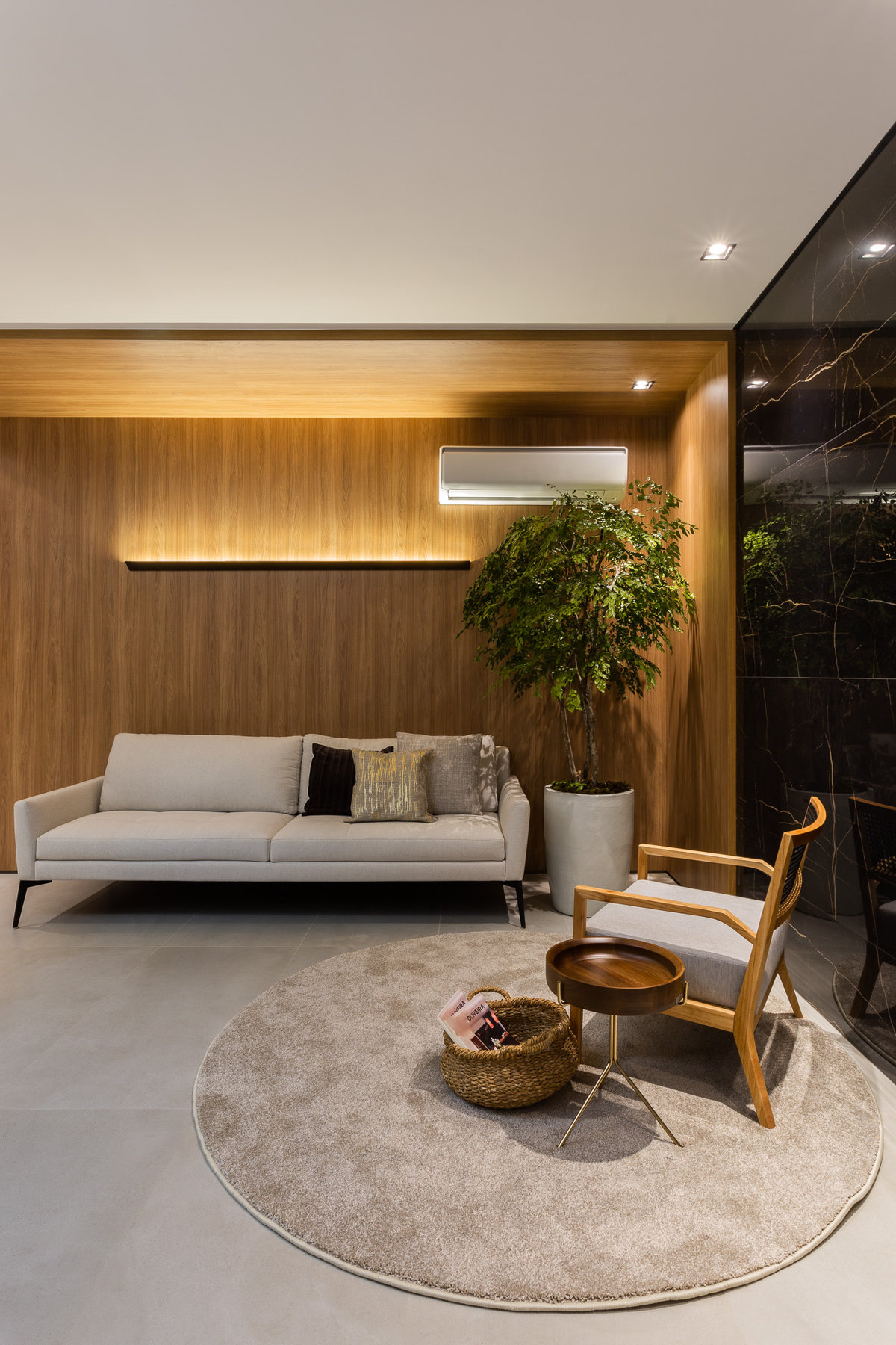 A escolha de mobiliário com linhas limpas, tapete circular e o uso de plantas naturais suavizam a imponência dos materiais, tornando o living um convite ao bem-estar. A paleta neutra reforça a sensação de equilíbrio e tranquilidade, enquanto a iluminação pontual valoriza os volumes e materiais com elegância.